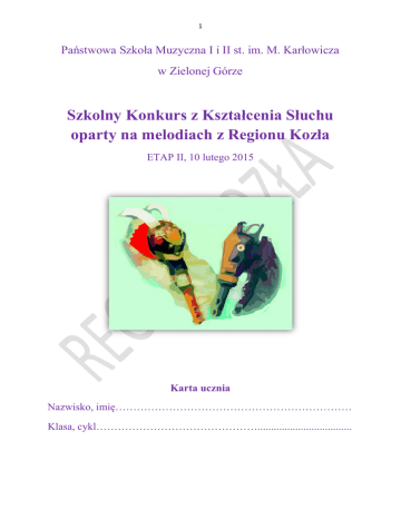 1 Państwowa Szkoła Muzyczna I i II st. im. M. Karłowicza w Zielonej Górze Szkolny Konkurs z Kształcenia Słuchu oparty na melodiach z Regionu Kozła ETAP II, 10 lutego 2015 Karta ucznia Nazwisko, imię………………………………………………………… Klasa, cykl………………………………………................................... 2 Zadanie 1. „Układanka muzyczna”- („Matka mnie tu przysłała” – okrągły) Melodia, którą za chwilę usłyszysz , składa się z sześciu taktów oznaczonych cyframi. Niektóre z nich powtarzają się więcej niż jeden raz. Po 2 – krotnym odtworzeniu nagrania, zapisz jej przebieg, wpisując w takty odpowiednie cyfry. Zadanie 2. „Niedokończony utwór” - („Dzisiej, dzisiej” – wiwat) Spójrz na cztery pierwsze takty melodii, którą za chwilę usłyszysz. Spośród trzech poniżej umieszczonych wersji wybierz tę, która Twoim zdaniem najlepiej pasuje do wysłuchanego fragmentu. Melodię usłyszysz 3 razy w jednej prezentacji . Odpowiedź Wersja 1 Wersja 2 Wersja 3 3 Zadanie 3. „Ile razy?” („Rybok” – marsz ) Po wysłuchaniu nagrania napisz ile razy powtórzyła się poniżej zapisana melodia. Odpowiedź wpisz cyfrą. Nagranie usłyszysz 1 raz. Odpowiedź Zadanie 4. „Ukryte kadencje”. ( „Socz”) Po wysłuchaniu przykładu muzycznego zaznacz fragmenty w których D7 rozwiązuje się na T. Melodię usłyszysz 3 razy w jednej prezentacji. 4 Zadanie 5. „Harmoniczna łamigłówka” („Mój ojciec wielki” – walcerek) Po wysłuchaniu melodii: • • • zaznacz grupy nut tworzące akordy, podaj nazwę literową zaznaczonego akordu, określ jaką funkcję harmoniczną (T,S,D,D7) pełni w tej tonacji. Melodię usłyszysz 3 razy w jednej prezentacji. Zadanie 6. „Zgadywanka rytmiczna” („Oberek obcy”) Po wysłuchaniu melodii wpisz cyframi w prostokąt grupy rytmiczne występujące w nagraniu. Melodię usłyszysz 3 razy w jednej prezentacji. 5 Zadanie 7. „Muzyczny chochlik” („Chodzony”) Przyjrzyj się uważnie zapisanej melodii. Po 4 – krotnym wysłuchaniu melodii otocz kółkiem nuty, które są błędnie zapisane. Pod zaznaczonymi nutami wpisz właściwą nazwę nuty. Nagranie usłyszysz 2 razy. Zadanie 8. „Niewidzialne metrum”( „Pod Borym dymbinum” – chodzony) Po wysłuchaniu przykładu, w którym występuje zmienne metrum, w puste pola oznaczone prostokątami wpisz oznaczenie metryczne. Całość nagrania usłyszysz 2 razy. 6 Suma uzyskanych punktów