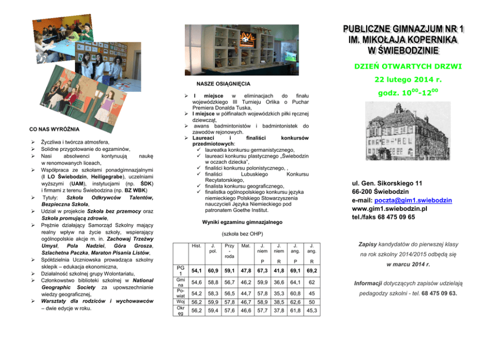 DZIEŃ OTWARTYCH DRZWI 22 lutego 2014 r. NASZE OSIĄGNIĘCIA godz. 1000-1200 I miejsce w eliminacjach do finału wojewódzkiego III Turnieju Orlika o Puchar Premiera Donalda Tuska, I miejsce w półfinałach wojewódzkich piłki ręcznej dziewcząt, awans badmintonistów i badmintonistek do zawodów rejonowych. Laureaci i finaliści konkursów przedmiotowych: laureatka konkursu germanistycznego, laureaci konkursu plastycznego „Świebodzin w oczach dziecka”, finaliści konkursu polonistycznego, , finaliści Lubuskiego Konkursu Recytatorskiego, finalista konkursu geograficznego, finalistka ogólnopolskiego konkursu języka niemieckiego Polskiego Stowarzyszenia nauczycieli Języka Niemieckiego pod patronatem Goethe Institut. CO NAS WYRÓŻNIA Życzliwa i twórcza atmosfera, Solidne przygotowanie do egzaminów, Nasi absolwenci kontynuują naukę w renomowanych liceach, Współpraca ze szkołami ponadgimnazjalnymi (I LO Świebodzin, Heiligegrabe), uczelniami wyższymi (UAM), instytucjami (np. ŚDK) i firmami z terenu Świebodzina (np. BZ WBK) Tytuły: Szkoła Odkrywców Talentów, Bezpieczna Szkoła, Udział w projekcie Szkoła bez przemocy oraz Szkoła promującą zdrowie, Prężnie działający Samorząd Szkolny mający realny wpływ na życie szkoły, wspierający ogólnopolskie akcje m. in. Zachowaj Trzeźwy Umysł, Pola Nadziei, Góra Grosza, Szlachetna Paczka, Maraton Pisania Listów, Spółdzielnia Uczniowska prowadząca szkolny sklepik – edukacja ekonomiczna, Działalność szkolnej grupy Wolontariatu, Członkowstwo biblioteki szkolnej w National Geographic Society za upowszechnianie wiedzy geograficznej, Warsztaty dla rodziców i wychowawców – dwie edycje w roku. ul. Gen. Sikorskiego 11 66-200 Świebodzin e-mail: [email protected] www.gim1.swiebodzin.pl tel./faks 68 475 09 65 Wyniki egzaminu gimnazjalnego (szkoła bez OHP) Hist. PG 1 Gmi na Powiat Woj Okr ęg J. pol. Przy roda Mat. J. niem J. niem J. ang. J. ang. P R P R Zapisy kandydatów do pierwszej klasy na rok szkolny 2014/2015 odbędą się w marcu 2014 r. 54,1 60,9 59,1 47,8 67,3 41,8 69,1 69,2 54,6 58,8 56,7 46,2 59,9 36,6 64,1 62 Informacji dotyczących zapisów udzielają 54,2 58,3 56,5 44,7 57,8 35,3 60,8 45 pedagodzy szkolni - tel. 68 475 09 63. 56,2 59,9 57,8 46,7 58,9 38,5 62,6 50 56,2 59,4 57,6 46,6 57,7 37,8 61,8 45,3 ORGANIZUJEMY Klasy integracyjne, Wycieczki, zajęcia integracyjne, dyskoteki, Wspólne wyjścia młodzieży i nauczycieli do kina oraz na spektakle teatralne, Cykl imprez związanych z patronem szkoły (apel, konkursy, wystawy, turniej wiedzy, zawody sportowe), Szkolne i międzyszkolne konkursy wiedzy m.in. ogólnopolski konkurs literacki pod patronatem Kuratorium Oświaty w Gorzowie Wlkp., Szkolną Ligę Ortograficzną promującą poprawność ortograficzną gimnazjalistów, „Superjedynki” – konkurs młodych talentów, Spotkania młodzieży z uczniami szkoły z Heiligegrabe, Olśniewające przedstawienia szkolnego teatru, Wystawy prac plastycznych, Bale gimnazjalne, Mecze sportowe między nauczycielami i uczniami, Indywidualne i grupowe zajęcia w zakresie orientacji i doradztwa zawodowego dla uczniów i rodziców. ZAPEWNIAMY Traktowanie każdego ucznia w sposób indywidualny, Wspomaganie rozwoju, pasji i zainteresowań wszystkich uczniów, Realizację programu nauczania przez zespół nauczycieli o wysokich kwalifikacjach, Fachową pomoc pedagogów skierowaną do uczniów i rodziców, Skuteczne przeciwdziałanie współczesnym zagrożeniom, Pomoc pedagogiczną w wyborze dalszej drogi kształcenia, Monitoring zewnętrzny i wewnętrzny, 00 00 Naukę w godzinach 8 – 16 . BAZA SZKOŁY Pracownie komputerowe z dostępem do Internetu, nowocześnie wyposażone pracownie przedmiotowe, Sale gimnastyczne, siłownia, lodowisko, skatepark, boisko wielofunkcyjne ze sztuczną nawierzchnią, Biblioteka szkolna wraz z nowoczesnym Multimedialnym Centrum Informacyjnym ze stanowiskami dla uczniów, Dziennik Elektroniczny LIBRUS – system kontroli frekwencji i postępów w nauce, Klub Uczniowski, Gabinet pielęgniarki, Stołówka szkolna, Sklepik szkolny. ZAJĘCIA POZALEKCYJNE Zajęcia rozwijające szczególne uzdolnienia przedmiotowe i międzyprzedmiotowe uczniów, Koła przedmiotowe (m. in. biblijne, pszczelarskie), Zajęcia artystyczne (plastyczne, teatralnowokalne). Dzięki dużemu zaangażowaniu nauczycieli i uczniów mamy okazję uczestniczyć w przygotowanych na wysokim poziomie spektaklach i koncertach, Zajęcia sportowe (koszykówka i piłka nożna dziewcząt, koszykówka i piłka nożna chłopców, aerobik, zajęcia sportowo-rekreacyjne, zajęcia korekcyjne), Klub młodych matematyków Matematyka bez granic, Zajęcia terapeutyczne, Zajęcia z bezpieczeństwa Ruchu Drogowego Jeżdżę z Głową, Zajęcia wyrównawcze z języka polskiego, matematyki, biologii, fizyki, języka niemieckiego, języka angielskiego, geografii i historii, Grupa Ratownictwa Przedmedycznego.