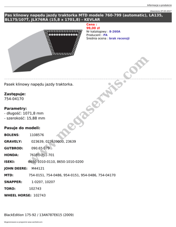 Informacje o produkcie Utworzono 07-03-2017 Pas klinowy napędu jazdy traktorka MTD modele 760-799 (automatic), LA135, BL175/107T, JLX76RA (15,8 x 1701,8) - KEVLAR Cena : 99,00 zł is .c om Nr katalogowy : 8-260A Producent : PA Średnia ocena : brak recenzji Pasek klinowy napędu jazdy traktorka. Parametry: - długość: 1071,8 mm - szerokość: 15,88 mm .m Pasuje do modeli: eg as e rw Zastępuje: 754-04170 BOLENS: 1108576 023639, 023639000, 23639 GUTBROD: 090.65.079 w 76181-751-701 w HONDA: ISEKI: w GRAVELY: JOHN DEERE: MTD: SNAPPER: TORO: 8650-1010-0110, 8650-1010-0200 M44121 754-0151, 754-0486, 954-0151, 954-0486, 754-04170 1-0207, 10207 102743 WHEEL HORSE: 102743 BlackEdition 175-92 / 13AN787E615 (2009) Wygenerowano w programie www.oscGold.com w w w .m eg as e is .c om rw BlackEdition 175-92 / 13AN787E615 (2010) BlackEdition 180-92 / 13AT787E615 (2009) BlackEdition 180-92 / 13AT787E615 (2010) BlackEdition 180-92 / 13AT787E615 (2008) Black-Line B 155/92 AM / 13AM788E683 (2009) Black-Line B 155/92 AM / 13AM788E683 (2008) Black-Line B 155/92 AM / 13AM788E683 (2010) Bolens BL 135/92 AT / 13AH785E684 (2009) Bolens BL 135/92 AT / 13AH785E484 (2008) Bolens BL 175/105 AT / 13AN785N684 (2009) Bolens BL 175/105 AT / 13AN785N684 (2008) Bolens BL 175/105 AT / 13AN781N684 (2008) Bolens BL 155/92 AT / 13A3785E684 (2008) Bolens BL 175/105 AT / 13AN785N484 (2008) Bolens BL 135/92 AT / 13AH781E684 (2008) Bolens BL 135/92 AT / 13AH785E684 (2008) Bolens BL 135/92 AT / 13AM785E684 (2008) Celebration 155/92 / 13AM783E686 (2008) Celebration 200/105 / 13AT783N686 (2008) Efco Kommand 92/15,5 AM / 13AM78KE637 (2009) Efco Kommand 92/15,5 AM / 13AM78KE637 (2010) Floraself MAC 220/105 AM / 13AU788N668 (2009) Floraself MAC 220/105 AM / 13AU788N668 (2008) Floraself MAC 220/105 AM / 13AU788N668 (2010) Gutbrod JLX 76 RA / 13AH786A490 (2008) Gutbrod JLX 76 RA / 13AH78GA690 (2009) Gutbrod JLX 76 RA / 13AH786A690 (2008) Lawnflite 705 LA / 13AV783E611 (2009) Lawnflite 908 LA / 13AV783N611 (2009) Lawnflite 604 LA / 13AV783A611 (2008) Lawnflite 908 LA / 13AT783N611 (2008) Lawnflite 705 LA / 13AV783E611 (2008) Lawnflite 604 LA / 13AG783A611 (2009) Lawnflite 908 LA / 13AX783N611 (2008) Massey Ferguson MF 30-15 RA / 13AV781A695 (2008) Massey Ferguson MF 30-15 RA / 13AV785A695 (2008) Massey Ferguson MF 36-15 RA / 13AV785E695 (2009) Massey Ferguson MF 36-15 RA / 13AV781E695 (2008) Massey Ferguson MF 30-15 RA / 13AV785A695 (2009) Massey Ferguson MF 36-15 RA / 13AV785E695 (2008) Mtd P 155 AME / 13AM783E478 (2008) Mtd P 155 AME / 13AM783E678 (2008) Mtd LA 135 / 13AH783A600 (2008) Mtd P 180 AMN / 13AT783N478 (2008) Mtd P 180 AMN / 13AT783N678 (2008) Mtd P 180 AMN / 13AT783N678 (2009) Mtd LA 135 / 13AH783A600 (2009) Mtd LA 135 / 13AH783A400 (2008) Mtd P 155 AME / 13AM783E678 (2009) w w w .m eg as e rw Mtd Prot 220 RD / 13AU783N631 (2008) Oleo-Mac Krosser 92/15,5 AM / 13AM78KE636 (2010) Oleo-Mac Krosser 92/15,5 AM / 13AM78KE636 (2009) Raiffeisen RMH 7200-105 AM / 13AT787N628 (2008) Raiffeisen RMH 7135-76 AM / 13AH787A628 (2009) Raiffeisen RMH 7145-92 AM / 13AM787E628 (2009) Raiffeisen RMH 7135-76 AM / 13AH787A628 (2008) Raiffeisen RMH 7145-92 AM / 13AM787E628 (2008) Raiffeisen RMH 7175-105 AM / 13AN787N628 (2009) Raiffeisen RMH 7175-105 AM / 13AN787N628 (2008) Raiffeisen RMH 7200-105 AM / 13AT787N628 (2009) Sarp SR 135 BSA / 13AH788E698 (2008) Sarp SR 135 BSA / 13AH788E498 (2008) SilverCut SC 200/105 / 13AT783N612 (2008) Silverline 18/92 AT / 13AN783E677 (2009) Silverline 200/105 / 13AT783N486 (2008) Silverline 17/105 AT / 13AN789N677 (2008) Silverline 155/92 / 13AM783E486 (2008) Sunline RTH 155/105 / 13AM783N685 (2009) Sunline RTS 125/96 / 13AH762F685 (2010) Sunline RTH 155/105 / 13AM783N685 (2010) Sunline RTH 155/105 / 13AM783N685 (2008) Yardman A 7135 A / 13AH78YA643 (2009) Yardman A 7135 A / 13AH784A643 (2008) Yardman A 7135 A / 13AH784A443 (2008) is .c om Informacje o produkcie Wygenerowano w programie www.oscGold.com