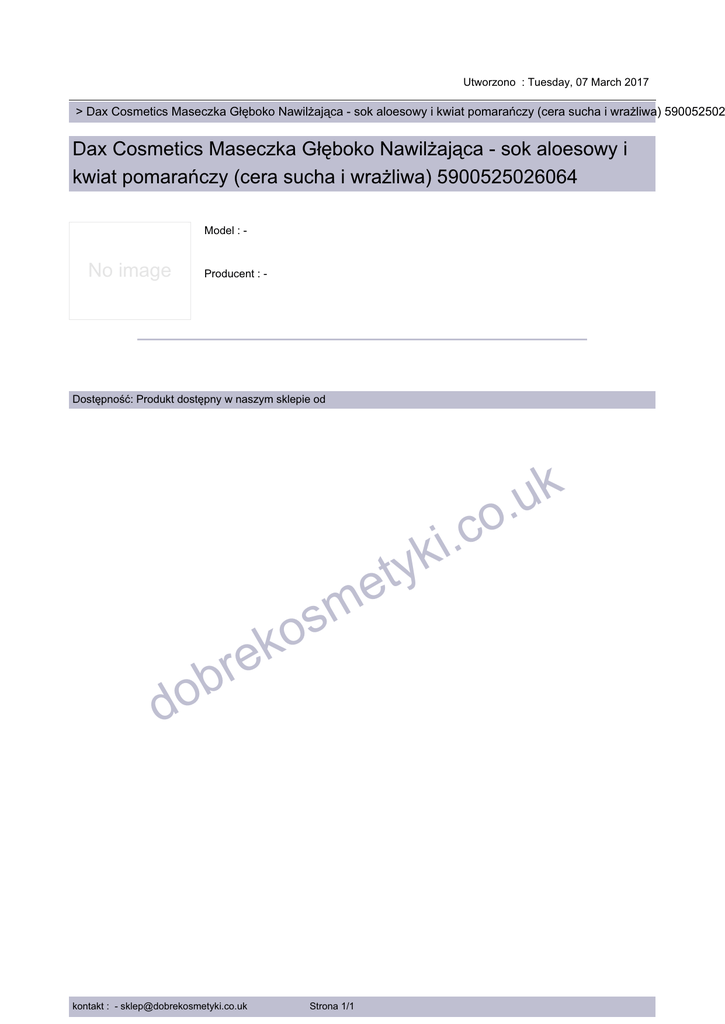 Utworzono : Tuesday, 07 March 2017 > Dax Cosmetics Maseczka Głęboko Nawilżająca - sok aloesowy i kwiat pomarańczy (cera sucha i wrażliwa) 590052502 Dax Cosmetics Maseczka Głęboko Nawilżająca - sok aloesowy i kwiat pomarańczy (cera sucha i wrażliwa) 5900525026064 Model : - No image Producent : - Dostępność: Produkt dostępny w naszym sklepie od y t e k u . o c . i k m s o k e br do kontakt : - [email protected] Strona 1/1