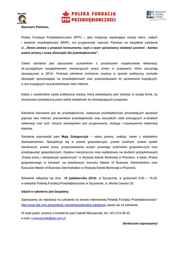 ISO 9001 ZETOM-CERT Szanowni Państwo, Polska Fundacja Przedsiębiorczości (PFP) – jako instytucja wspierająca rozwój mikro, małych i średnich przedsiębiorstw (MSP), ma przyjemność zaprosić Państwa na bezpłatne szkolenie pt. „Nowa ustawa o prawach konsumenta, czyli o czym sprzedawcy wiedzieć powinni - bardzo ważne zmiany i nowe obowiązki dla przedsiębiorców”. Celem szkolenia jest zapoznanie uczestników z procedurami rozpatrywania reklamacji, ze szczególnym uwzględnieniem rewolucyjnych wręcz zmian w przepisach, które zaczynają obowiązywać w 2014r. Podczas szkolenia omówione zostaną w sposób praktyczny rozmaite obowiązki spoczywające na przedsiębiorcach oraz przeciwstawiane im uprawnienia kupujących, w tym kupujących za pośrednictwem sieci Internet. Każdy z uczestników zyska praktyczną wiedzę, którą zobowiązany jest wdrożyć w swojej firmie, by dostosować prowadzoną przez siebie działalność do obowiązujących przepisów. Szkolenie kierowane jest do przedsiębiorców, zwłaszcza przedsiębiorców prowadzących sprzedaż poprzez sieć Internet, pracowników przedsiębiorstw oraz wszystkich osób pracujących w działach reklamacji oraz tych, których obowiązkiem jest przyjmowanie, obsługa i rozpatrywanie reklamacji klientów. Szkolenie poprowadzi pani Maja Grzegorczyk – radca prawny, praktyk, trener z wieloletnim doświadczeniem. Specjalizuje się w prawie gospodarczym, prawie cywilnym, prawie spółek handlowych, prawie pracy, przeprowadzaniu audytu prawnego podmiotów gospodarczych oraz przedsięwzięć gospodarczych. Opiekun merytoryczny oraz wykładowca na studiach podyplomowych „Prawa pracy i ubezpieczeń społecznych” w Wyższej Szkole Bankowej w Poznaniu, a także „Prawa gospodarczego w biznesie” na prestiżowym kierunku Master of Business Administration oraz Executive Master of Business Administration w Wyższej Szkole Bankowej w Poznaniu. Szkolenie odbędzie się dnia 16 października 2014r. w Szczecinie, w godzinach 9.00 – 15.45, w siedzibie Polskiej Fundacji Przedsiębiorczości w Szczecinie, ul. Monte Cassino 32. Udział w szkoleniu jest bezpłatny. Zapraszamy do rejestracji na szkolenie na stronie internetowej Polskiej Fundacji Przedsiębiorczości” http://www.pfp.com.pl/szkolenia i doradztwo/aktualne szkolenia/ zapisz sie na szkolenie. W razie pytań, prosimy o kontakt do pani Izabelli Maruszczak, tel.: (91) 312-92-22, e-mail: [email protected] Serdecznie zapraszamy! ISO 9001ISO 9001 ZETOMCERTZETOM- Program szkolenia CERT „Nowa ustawa o prawach konsumenta, czyli o czym sprzedawcy wiedzieć powinni bardzo ważne zmiany i nowe obowiązki dla przedsiębiorców”. Temat zajęć Godzina 9.00 9.00 – 10.30 10.30 – 10.45 10.45 – 12.15 12.15 – 12.30 12.30 – 14.15 Powitanie uczestników i wprowadzenie Przegląd aktów prawnych regulujących kwestie odpowiedzialności wobec klienta z uwzględnieniem najnowszych zmian w przepisach. b) Moja rola na rynku produkcji i dystrybucji i jakie to ma znaczenie dla mojej odpowiedzialności wobec klienta. c) Jak przygotować się do rozpatrywania reklamacji zgodnie z nowymi przepisami – omówienie. Przerwa a) 1. Jakie uprawnienia przysługują klientowi zgodnie z nowymi przepisami – co może być przedmiotem reklamacji. 2. Czego klient może żądać składając reklamację? nowa definicja tzw. wady fizycznej; czy konsument zawsze może żądać zwrotu towaru; kiedy naprawa a kiedy wymiana; kto ponosi koszty dostarczenia reklamowanego towaru; 3. Obowiązki kupującego związane z reklamacją i skutki ich niedopełnienia. 4. Jak liczymy terminy po zmianie przepisów? Przerwa 1. Jak przeprowadzić postępowanie reklamacyjne po zmianie przepisów? kto dostarcza towar i na czyj koszt? czy musimy trzymać paragony? czy musimy zachować oryginalne opakowanie – czy jego brak może stanowić podstawę odmowy przyjęcia reklamacji? nowe formularze reklamacyjne – obowiązki sprzedawców. 2. Czy sprzedawcy przysługują roszczenia regresowe np. wobec dystrybutora? 14.15 – 14.30 14.30 – 15.45 15.45 Przerwa 1. Sprzedaż poprzez Internet – rewolucyjne zmiany w przepisach i nowe obowiązki sprzedających. 2. Nowe obowiązki informacyjne spoczywające na przedsiębiorcy, nowe obowiązki informacyjne – opisy na stronie internetowej. 3. Regulamin sklepu internetowego – co powinien zawierać. 4. Nowe zasady związane z odstąpieniem od umowy zawartej poprzez Internet. 5. Obowiązki spoczywające na kupującym przy zawieraniu umowy na odległość – czy muszę sprawdzić stan przesyłki przy odbiorze. Przegląd orzecznictwa. Zakończenie szkolenia