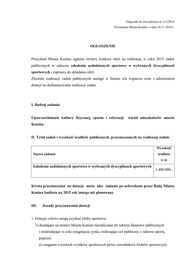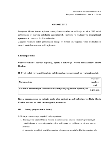 Załącznik do Zarządzenia nr 113/2014 Prezydenta Miasta Konina z dnia 20.11.2014 r. OGŁOSZENIE Prezydent Miasta Konina ogłasza otwarty konkurs ofert na realizację w roku 2015 zadań publicznych w zakresie szkolenia uzdolnionych sportowo w wybranych dyscyplinach sportowych i zaprasza do składania ofert. Zlecenie realizacji zadań publicznych nastąpi w formie ich wsparcia wraz z udzieleniem dotacji na dofinansowanie realizacji zadań. I. Rodzaj zadania Upowszechnianie kultury fizycznej, sportu i rekreacji wśród mieszkańców miasta Konina. II. Tytuł zadań i wysokość środków publicznych, przeznaczonych na realizację zadań. Wysokość Nazwa zadania środków w zł. Szkolenia uzdolnionych sportowo w wybranych dyscyplinach sportowych 2.400.000,- Kwota przeznaczona na dotacje może ulec zmianie po uchwaleniu przez Radę Miasta Konina budżetu na 2015 rok innego niż planowany. III. Zasady przyznawania dotacji 1. Dotacje celowe mogą uzyskać kluby sportowe: 1) działające na terenie Miasta Konina niezaliczane do sektora finansów publicznych i niedziałające w celu osiągnięcia zysku, realizujące cel publiczny z zakresu sportu, poprzez: a) osiąganie wysokich wyników sportowych przez zawodników klubów sportowych, b) poprawę warunków uprawiania sportu przez zawodników klubów sportowych, c) poprawę kondycji fizycznej i zdrowia psychicznego mieszkańców poprzez uczestnictwo w aktywnym stylu życia, d) promocję sportu i aktywnego stylu życia, e) umożliwianie dostępu do różnorodnych form aktywności sportowej jak największej liczbie mieszkańców Konina. 2) gwarantujące własny wkład finansowy w wysokości minimum 10% wartości realizowanego zadania, który nie pochodzi ze środków publicznych, 3) promujące wizerunek Konina jako miasta wspierającego rozwój sportu. 2. Z dotacji celowej mogą być dofinansowane wydatki na: 1) realizację programów szkolenia sportowego, 2) zakup sprzętu sportowego, 3) pokrycie kosztów organizowania zgrupowań i zawodów sportowych lub uczestnictwa w tych zawodach, 4) pokrycie kosztów korzystania z obiektów sportowych dla celów szkolenia sportowego, 5) finansowanie stypendiów sportowych i wynagrodzenia kadry szkoleniowej, 6) pokrycie kosztów obsługi zadania do wysokości 8% dotacji, z wyłączeniem wydatków na wynagrodzenia i pochodne od wynagrodzeń wypłacanych członkom zarządów klubów. 3. Z dotacji nie mogą być finansowane następujące wydatki: 1) kary i mandaty nałożone na klub i zawodników klubu, 2) transfery zawodników, 3) zobowiązania z tytułu zaciągniętych kredytów i pożyczek oraz kosztów ich obsługi. 4. W przypadku, gdy suma wnioskowanych dofinansowań, wynikająca ze złożonych ofert, przekracza wysokość środków przeznaczonych na realizację zadania, organizator konkursu zastrzega sobie możliwość zmniejszania wielkości dofinansowania o które ubiega się klub. IV. Termin realizacji zadań Realizacja w/w zadań od daty zawarcia umowy do 31.12.2015 r. V. Warunki realizacji zadań 1. Realizacja zleconego organizacji pozarządowej zadania następuje po zawarciu umowy. 2 2 . Zadanie publiczne zawarte w ofercie nie może być realizowane przez podmiot niebędący stroną umowy o wsparcie realizacji zadania publicznego. 3. Podmiot, realizując zlecone zadanie, jest zobowiązany do informowania w wydawanych przez siebie publikacjach, swoich materiałach informacyjnych (plakatach, zaproszeniach, regulaminach, ogłoszeniach prasowych, wykazach sponsorów itp.), poprzez media, o fakcie dofinansowania realizacji zadania przez miasto Konin. 4. Podmioty realizujące zadanie powinny posiadać niezbędne warunki i doświadczenie w realizacji zadań o podobnym charakterze, w tym: 1) kadrę specjalistów o kwalifikacjach potwierdzonych dokumentami, 2) bazę materialno-techniczną umożliwiającą realizację zadania - własną lub dostęp do takiej bazy, 3) znaczące wyniki sportowe na arenie ogólnopolskiej lub wojewódzkiej. 5. Podmiot, realizując zadanie, zobowiązany jest do stosowania przepisów prawa, w szczególności ustaw: o ochronie danych osobowych, o finansach publicznych oraz o rachunkowości. VI. Termin i warunki składania ofert 1. Oferty należy składać wyłącznie na drukach dostępnych na stronie internetowej bip.konin.eu. 2. Oferty należy składać w Biurze Obsługi Interesanta Urzędu Miejskiego w Koninie, Plac Wolności 1, w nieprzekraczalnym terminie do dnia 5 grudnia 2014 roku do godz. 15.30 lub przesyłać na adres: Urząd Miejski w Koninie, Plac Wolności 1, 62-500 Konin (decyduje data wpływu do Biura Obsługi Interesanta). 3. Oferta, która wpłynie po ww. terminie, nie będzie objęta procedurą konkursową. 4. Oferty należy składać w zamkniętej kopercie, w miejscu i czasie określonym w ogłoszeniu. Koperta powinna być opisana z oznaczeniem nazwy i adresu podmiotu oraz nazwy zadania określonego w ogłoszeniu o konkursie. VII. Wymagana dokumentacja 1. Oferta o udzielenie dotacji, która winna zawierać następujące informacje: 1) nazwę i siedzibę wnioskodawcy, 2) szczegółowy zakres rzeczowy zadania, 3) kosztorys zawierający kalkulację przewidywanych kosztów realizacji zadania, wraz z podaniem wysokości planowanej dotacji z budżetu miasta, 3 4) harmonogram realizacji zadania, wraz z podaniem terminów rozpoczęcia i zakończenia poszczególnych działań, 5) zasoby kadrowe i rzeczowe przewidywane do wykorzystania przy realizacji zadania, 6) liczbę punktów zdobytych przez klub w ogólnopolskim systemie współzawodnictwa sportowego dzieci i młodzieży w roku poprzedzającym udzielenie dotacji, 7) liczbę i poziom sportowy drużyn klubowych biorących udział w rozgrywkach ligowych, 8) liczbę zawodników ćwiczących w klubie, 9) oświadczenie, że wszystkie dane we wniosku oraz załącznikach są zgodne z aktualnym stanem prawnym i faktycznym. 2. Do oferty, o której mowa w pkt.1 należy dołączyć: 1) Odpis z Krajowego Rejestru Sądowego lub wydru