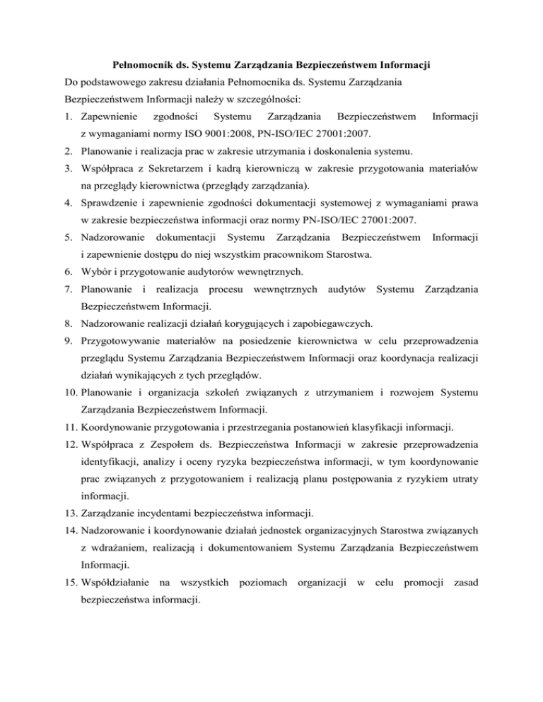 Pełnomocnik ds. Systemu Zarządzania Bezpieczeństwem Informacji Do podstawowego zakresu działania Pełnomocnika ds. Systemu Zarządzania Bezpieczeństwem Informacji należy w szczególności: 1. Zapewnienie zgodności Systemu Zarządzania Bezpieczeństwem Informacji z wymaganiami normy ISO 9001:2008, PN-ISO/IEC 27001:2007. 2. Planowanie i realizacja prac w zakresie utrzymania i doskonalenia systemu. 3. Współpraca z Sekretarzem i kadrą kierowniczą w zakresie przygotowania materiałów na przeglądy kierownictwa (przeglądy zarządzania). 4. Sprawdzenie i zapewnienie zgodności dokumentacji systemowej z wymaganiami prawa w zakresie bezpieczeństwa informacji oraz normy PN-ISO/IEC 27001:2007. 5. Nadzorowanie dokumentacji Systemu Zarządzania Bezpieczeństwem Informacji i zapewnienie dostępu do niej wszystkim pracownikom Starostwa. 6. Wybór i przygotowanie audytorów wewnętrznych. 7. Planowanie i realizacja procesu wewnętrznych audytów Systemu Zarządzania Bezpieczeństwem Informacji. 8. Nadzorowanie realizacji działań korygujących i zapobiegawczych. 9. Przygotowywanie materiałów na posiedzenie kierownictwa w celu przeprowadzenia przeglądu Systemu Zarządzania Bezpieczeństwem Informacji oraz koordynacja realizacji działań wynikających z tych przeglądów. 10. Planowanie i organizacja szkoleń związanych z utrzymaniem i rozwojem Systemu Zarządzania Bezpieczeństwem Informacji. 11. Koordynowanie przygotowania i przestrzegania postanowień klasyfikacji informacji. 12. Współpraca z Zespołem ds. Bezpieczeństwa Informacji w zakresie przeprowadzenia identyfikacji, analizy i oceny ryzyka bezpieczeństwa informacji, w tym koordynowanie prac związanych z przygotowaniem i realizacją planu postępowania z ryzykiem utraty informacji. 13. Zarządzanie incydentami bezpieczeństwa informacji. 14. Nadzorowanie i koordynowanie działań jednostek organizacyjnych Starostwa związanych z wdrażaniem, realizacją i dokumentowaniem Systemu Zarządzania Bezpieczeństwem Informacji. 15. Współdziałanie na wszystkich poziomach organizacji w celu promocji zasad bezpieczeństwa informacji.