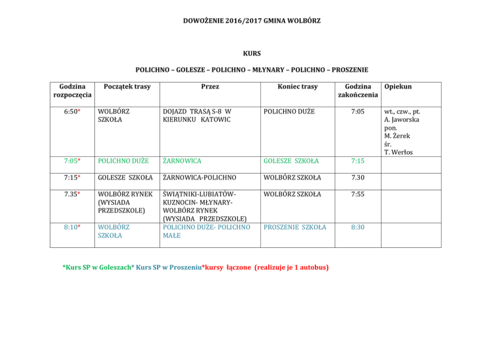 DOWOŻENIE 2016/2017 GMINA WOLBÓRZ KURS POLICHNO – GOLESZE – POLICHNO – MŁYNARY – POLICHNO – PROSZENIE Godzina rozpoczęcia Początek trasy Przez Koniec trasy Godzina Opiekun zakończenia 6:50* WOLBÓRZ SZKOŁA DOJAZD TRASĄ S-8 W KIERUNKU KATOWIC POLICHNO DUŻE 7:05 7:05* POLICHNO DUŻE ŻARNOWICA GOLESZE SZKOŁA 7:15 7:15* GOLESZE SZKOŁA ŻARNOWICA-POLICHNO WOLBÓRZ SZKOŁA 7.30 7.35* WOLBÓRZ RYNEK (WYSIADA PRZEDSZKOLE) WOLBÓRZ SZKOŁA 7:55 8:10* WOLBÓRZ SZKOŁA ŚWIĄTNIKI-LUBIATÓWKUZNOCIN- MŁYNARYWOLBÓRZ RYNEK (WYSIADA PRZEDSZKOLE) POLICHNO DUŻE- POLICHNO MAŁE PROSZENIE SZKOŁA 8:30 *Kurs SP w Goleszach* Kurs SP w Proszeniu*kursy łączone (realizuje je 1 autobus) wt., czw., pt. A. Jaworska pon. M. Żerek śr. T. Werłos KURS GOLESZE Godzina rozpoczęcia Początek trasy Przez Koniec trasy Godzina zakończenia Opiekun 6:30 SP GOLESZE GOLESZE-LUBIASZÓWSTANISŁAWÓW-STUDZIANKIMŁOSZÓW-MODRZEWEK WOLBÓRZ SZKOŁA 7:55 SP Golesze 14:00 WOLBÓRZ SZKOŁA WOLBÓRZ RYNEK (WSIADA PRZEDSZKOLE)-MODRZEWEKMŁOSZÓW –GOLESZE (SP)ŻARNOWICA-POLICHNO DUŻE WOLBÓRZ SZKOŁA 14:45 pon. A. Jaworska wt., śr. W. Gralińska czw., pt. K. SzelkaBłaszczyńska 15:00 WOLBÓRZ SZKOŁA POLICHNO-ŻARNOWICA-GOLESZE SP-LUBIASZÓW-STANISŁAWÓWSTUDZIANKI-MŁOSZÓWSWOLSZEWICE-BRONISŁAWÓW GOLESZE SZKOŁA 16.20 SP Golesze *Kursy realizuje autobus szkolny (Mandaryna) KURS MŁYNARY/BOGUSŁAWICE PSO Godzina rozpoczęcia Początek trasy Przez Koniec trasy Godzina zakończenia Opiekun 7.15 WOLBÓRZSZKOŁA ŚWIĄTNIKI-LUBIATÓWZAKRZEW-KUZNOCINMŁYNARY-WOLBÓRZ RYNEK (WYSIADA PRZEDSZKOLE) WOLBÓRZ SZKOŁA 7:45 pon. – pt. B. Kulińska 7.45 WOLBÓRZ SZKOŁA BOGUSŁAWICE PSO WOLBÓRZ SZKOŁA 8.00 13:00 WOLBÓRZ SZKOŁA BOGUSŁAWICE-ŚWIĄTNIKILUBIATÓW-KUZNOCINMŁYNARY WOLBÓRZ SZKOŁA 13.45 14:00 WOLBÓRZ SZKOŁA WOLBÓRZ RYNEK (WSIADA PRZEDSZKOLE)ŚWIĄTNIKI-LUBIATÓWZAKRZEW-KUZNOCINMŁYNARY WOLBÓRZ SZKOŁA 14:40 15:00 WOLBÓRZ SZKOŁA ŚWIĄTNIKI-LUBIATÓWZAKRZEW-KUZNOCINMŁYNARY WOLBÓRZ SZKOŁA 15.40 pon. – pt. B. Kulińska pon., pt. M. Żerek wt., śr., czw. L. Dąbrowska pon. M. Żerek wt., czw. L. Dąbrowska śr., pt. T. Werłos pon. M. Żerek wt., czw. L. Dąbrowska śr., pt. T. Werłos 7.15 i 7.45 – kursy realizuje 1 autobus KURS PSARY-PROSZENIE Godzina rozpoczęcia 7.10 Przez WOLBÓRZ SZKOŁA POLICHNO-PROSZENIE-PSARY LECHAWA-PSARY STAREPSARY WITOWSKIE WOLBÓRZ RYNEK (WSIADA PRZEDSZKOLE)PSARY WITOWSKIE- PSARY STARE- PSARY LECHAWAPROSZENIE (SP)-POLICHNO MAŁE-POLICHNO DUŻE WOLBÓRZ SZKOŁA WOLBÓRZ SZKOŁA 15:00 B. Kulińska PSARY WITOWSKIE- PSARY STARE- PSARY LECHAWAPROSZENIE (SP)-POLICHNO MAŁE WOLBÓRZ SZKOŁA 16:00 B. Kulińska 14:00 WOLBÓRZ SZKOŁA 15:00 WOLBÓRZ SZKOŁA Koniec trasy Opiekun Godzina zakończenia 8:10 B. Jasnowska Początek trasy KURS KOMORNIKI Początek trasy Godzina rozpoczęcia 6:55 WOLBÓRZ SZKOŁA 8:15 WOLBÓRZ RYNEK 8:30 KOMORNIKI(SP) 13:05 KOMORNIKI (SP) 14:00 WOLBÓRZ SZKOŁA 15:00 WOLBÓRZ SZKOŁA Przez KRZYKOWICE- DĄBROWABOGUSŁAWICE PSO-BRUDAKIBOGUSŁAWICE WIEŚ- KOMORNIKI (SP)- KOMORNIKI WIEŚ-ŻYWOCIN-NOWORYBIEKOMORNIKI (SP) WOLBÓRZ RYNEK (ZMIANA OPIEKUNA)- DĄBROWABOGUSŁAWICE PSO-BRUDAKIBOGUSŁAWICE WIEŚKOMORNIKI WIEŚ-ŻYWOCINNOWORYBIEI tura – ŻYWOCIN-NOWORYBIEKOMORNIKI SP II tura –BOGUSŁAWICE WIEŚBRUDAKI-BOGUSŁAWICE PSODĄBROWA DĄBROWA- BOGUSŁAWICE PSO BRUDAKI-BOGUSŁAWICE WIEŚKOMORNIKI (SP)-KOMORNIKI WIEŚ-ŻYWOCIN-NOWORYBIEKOMORNIKI (SP) KRZYKOWICE-DĄBROWABOGUSŁAWICE PSO- BRUDAKIBOGUSŁAWICE WIEŚKOMORNIKI (SP)-KOMORNIKI WIEŚ-ŻYWOCIN-NOWORYBIEKOMORNIKI (SP) Koniec trasy WOLBÓRZ SZKOŁA Godzina Opiekun zakończenia 8:10 M. Badek KOMORNIKI SZKOŁA 8:25 SP Komorniki KOMORNIKI SZKOŁA 8:55 SP Komorniki WOLBÓRZ SZKOŁA 13:55 SP Komorniki WOLBÓRZ SZKOŁA 15:00 WOLBÓRZ SZKOŁA 16:00 pon., śr. A. Szulc wt., czw. M. Pełka pt. M. Żerek pon., śr. A. Szulc wt., czw. M. Pełka pt. M. Żerek *kursy SP Komorniki Opracowała Agata Jaworska