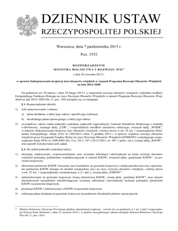 DZIENNIK USTAW RZECZYPOSPOLITEJ POLSKIEJ Warszawa, dnia 7 października 2015 r. Poz. 1552 RO ZPO R ZĄ D ZE N I E M INI S TR A R O L N IC T WA I RO ZW O J U W S I 1) z dnia 30 września 2015 r. w sprawie funkcjonowania krajowej sieci obszarów wiejskich w ramach Programu Rozwoju Obszarów Wiejskich na lata 2014–2020 Na podstawie art. 58 ustawy z dnia 20 lutego 2015 r. o wspieraniu rozwoju obszarów wiejskich z udziałem środków Europejskiego Funduszu Rolnego na rzecz Rozwoju Obszarów Wiejskich w ramach Programu Rozwoju Obszarów Wiejskich na lata 2014–2020 (Dz. U. poz. 349) zarządza się, co następuje: § 1. Rozporządzenie określa: 1) tryb opracowywania i zmiany: a) planu działania, a także jego zakres i sposób jego realizacji, b) dwuletniego planu operacyjnego, a także jego zakres; 2) szczegółowy zakres zadań jednostki centralnej, jednostek regionalnych, Centrum Doradztwa Rolniczego z siedzibą w Brwinowie, zwanego dalej „CDR”, i wojewódzkich ośrodków doradztwa rolniczego, zwanych dalej „WODR”, w zakresie funkcjonowania krajowej sieci obszarów wiejskich, o której mowa w art. 54 ust. 1 rozporządzenia Parlamentu Europejskiego i Rady (UE) nr 1305/2013 z dnia 17 grudnia 2013 r. w sprawie wsparcia rozwoju obszarów wiejskich przez Europejski Fundusz Rolny na rzecz Rozwoju Obszarów Wiejskich (EFRROW) i uchylającego rozporządzenie Rady (WE) nr 1698/2005 (Dz. Urz. UE L 347 z 20.12.2013, str. 487, z późn. zm.), zwanej dalej „KSOW”, oraz sposób wykonywania tych zadań. § 2. Do zadań jednostki centralnej należy: 1) zbieranie, analizowanie, rozpowszechnianie oraz wymiana informacji i doświadczeń na temat rozwoju obszarów wiejskich pomiędzy podmiotami współpracującymi w ramach KSOW, zwanymi dalej „partnerami KSOW”, na poziomie krajowym; 2) ułatwianie partnerom KSOW tworzenia sieci kontaktów na poziomie krajowym i międzynarodowym oraz zapewnienie partnerom KSOW dostępu do działań europejskiej sieci na rzecz rozwoju obszarów wiejskich, o której mowa w art. 52 ust. 1 rozporządzenia wymienionego w § 1 pkt 2, zwanej dalej „ESROW”; 3) administrowanie na poziomie krajowym stroną internetową KSOW, zwaną dalej „portalem KSOW”, oraz innymi internetowymi narzędziami umożliwiającymi wymianę informacji i prowadzenie dyskusji pomiędzy partnerami KSOW na poziomie krajowym; 4) promocja KSOW i informowanie o KSOW na poziomie krajowym; 5) realizacja planu działania na poziomie krajowym na podstawie dwuletnich planów operacyjnych; 1) Minister Rolnictwa i Rozwoju Wsi kieruje działem administracji rządowej – rozwój wsi, na podstawie § 1 ust. 2 pkt 2 rozporządzenia Prezesa Rady Ministrów z dnia 22 września 2014 r. w sprawie szczegółowego zakresu działania Ministra Rolnictwa i Rozwoju Wsi (Dz. U. poz. 1261). Dziennik Ustaw –2– Poz. 1552 6) opracowanie, we współpracy z podmiotami realizującymi dwuletnie plany operacyjne na poziomie krajowym, co pół roku informacji i co dwa lata sprawozdania z realizacji tych planów oraz co roku sprawozdania z realizacji planu działania; 7) obsługa organizacyjna i techniczna organu pomocniczego, o którym mowa w art. 57 ust. 1 ustawy z dnia 20 lutego 2015 r. o wspieraniu rozwoju obszarów wiejskich z udziałem środków Europejskiego Funduszu Rolnego na rzecz Rozwoju Obszarów Wiejskich w ramach Programu Rozwoju Obszarów Wiejskich na lata 2014–2020, zwanej dalej „ustawą”, oraz grup tematycznych, o których mowa w art. 57 ust. 3 pkt 3 ustawy; 8) koordynacja współpracy oraz współpraca z ESROW, w tym reprezentowanie Rzeczypospolitej Polskiej w Zgromadzeniu Sieci Obszarów Wiejskich, Grupie Sterującej Sieci Obszarów Wiejskich i podgrupach, o których mowa w decyzji wykonawczej Komisji 2014/825/UE z dnia 20 listopada 2014 r. określającej strukturę organizacyjną i zasady funkcjonowania europejskiej sieci na rzecz rozwoju obszarów wiejskich i sieci europejskiego partnerstwa innowacyjnego oraz uchylającej decyzję 2008/168/WE (Dz. Urz. UE L 334 z 21.11.2014, str. 98); 9) współpraca z KSOW funkcjonującą w innych państwach członkowskich Unii Europejskiej; 10) współpraca z jednostkami regionalnymi i CDR w zakresie realizacji planu działania i dwuletnich planów operacyjnych. § 3. Do zadań jednostek regionalnych należy: 1) zbieranie, analizowanie, rozpowszechnianie oraz wymiana informacji i doświadczeń na temat rozwoju obszarów wiejskich pomiędzy partnerami KSOW w województwie; 2) ułatwianie partnerom KSOW tworzenia sieci kontaktów w województwach i na obszarach odpowiadającym województwom w innych państwach; 3) administrowanie w województwie portalem KSOW oraz innymi internetowymi narzędziami umożliwiającymi wymianę informacji i prowadzenie dyskusji pomiędzy partnerami KSOW w województwie; 4) promocja KSOW i informowanie o KSOW w województwie; 5) współpraca z jednostką centralną i innymi jednostkami regionalnymi w zakresie realizacji planu działania i dwuletnich planów operacyjnych; 6) udział w opracowaniu, we współpracy z partnerami KSOW w województwie i organem opiniodawczo-doradczym, o którym mowa w art. 57 ust. 2 ustawy, zwanym dalej „wojewódzką grupą roboczą”, planu działania i dwuletnich planów operacyjnych w zakresie zadań realizowanych w województwie; 7) opracowanie, we współpracy z podmiotami realizującymi dwuletnie plany operacyjne w województwie, co pół roku informacji i co dwa lata sprawozdania z realizacji tych planów oraz co roku sprawozdania z realizacji planu działania w województwie; 8) obsługa organizacyjna i techniczna wojewódzkiej grupy roboczej i grup tematycznych, o których mowa w art. 57 ust. 4 pkt 3 ustawy; 9) współpraca z WODR w zakresie realizacji zadań Sieci na rzecz innowacji w rolnictwie i na obszarach wiejskich, zwanej dalej „SIR”, w tym zadań brokerów innowacji, o których mowa w Programie Rozwoju Obszarów Wiejskich na lata 2014–2020, zwanym dalej „Programem”; 10) 