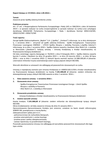 Raport bieżący nr 37/2016 z dnia 1.09.2016 r. Temat: Zawarcie przez Spółkę Zależną Emitenta umów. Podstawa prawna: Art. 17 ust. 1 Rozporządzenia Parlamentu Europejskiego i Rady (UE) nr 596/2014 z dnia 16 kwietnia 2014 r. w sprawie nadużyć na rynku (rozporządzenie w sprawie nadużyć na rynku) oraz uchylające dyrektywę 2003/6/WE Parlamentu Europejskiego i Rady i dyrektywy Komisji 2003/124/WE, 2003/125/WE i 2004/72/WE Treść raportu: Zarząd Spółki Elektrociepłownia „Będzin” S.A. („Spółka", „Emitent”) informuje, że w dniu dzisiejszym tj. 1 września 2016 r. otrzymał od spółki zależnej Emitenta - Spółki Energetyczne Towarzystwo Finansowo Leasingowe ENERGO – UTECH Spółka Akcyjna z siedzibą Poznaniu („Spółka Zależna”) informację, że w dniu 1 września 2016 r. Spółka Zależna zawarła z bankiem Alior Bank S.A. z siedzibą w Warszawie („Bankiem”) kolejną umowę – Umowę Kredytową o Kredyt nieodnawialny na finansowanie bieżącej działalności. Od daty ostatniego raportu bieżącego nr 76/2015 z dnia 9 listopada 2015 r. Spółka Zależna zawarła łącznie 5 umów z Bankiem (w dniu 22 grudnia 2015 r., w dniu 29 stycznia 2016 r., w dniu 18 lipca 2016 r. oraz w dniu 1 września 2016 r.), których łączna wartość wynosi 14.388.500,00 zł (słownie: czternaście milionów trzysta osiemdziesiąt osiem tysięcy pięćset złotych 00/100). Warunki określone w umowach nie odbiegają od powszechnie stosowanych na rynku. Umową o największej wartości jest Umowa Kredytowa nr U0003118111258 o Kredyt nieodnawialny na finansowanie bieżącej działalności na kwotę 7.191.000,00 zł (słownie: siedem milionów sto dziewięćdziesiąt tysięcy złotych 00/100) zawarta w dniu 1 września 2016 r. 1. 2. 3. Data zawarcia umowy - 1 września 2016 r. Oznaczenie stron umowy - Spółka Energetyczne Towarzystwo Finansowo-Leasingowe Energo – Utech Spółka Akcyjna z siedzibą w Poznaniu - Alior Bank S.A. z siedzibą w Warszawie Oznaczenie przedmiotu umowy Umowa Kredytowa o Kredyt nieodnawialny na finansowanie bieżącej działalności 4. Istotne warunki umowy Kwota kredytu: 7.191.000,00 zł (słownie: siedem milionów sto dziewięćdziesiąt tysięcy złotych 00/100) Okres kredytowania: od daty zawarcia Umowy do dnia 31 sierpnia 2021 r. Oprocentowanie: Oprocentowanie Kredytu jest zmienne, ustalone na bazie stawki referencyjnej WIBOR 3M, powiększone o marżę Banku. Zabezpieczeniem spłaty jest m.in.: - pełnomocnictwo do rachunków bieżących, - przelew wierzytelności z umów leasingu - przelew praw z polisy ubezpieczeniowej - zastaw rejestrowy na przedmiotach leasingu, Pozostałe postanowienia Umowy nie odbiegają od warunków powszechnie stosowanych dla tego typu umów. 5. Postanowienia dotyczące kar Umowa nie zawiera żadnych uregulowań dotyczących kar umownych. 6. Zastrzeżenia warunku lub terminu Umowa nie zawiera postanowień dot. warunku lub terminu. 7. Oznaczenie umowy Niniejsze umowy uznane zostały za znaczące z uwagi na ich wartość i znaczenie dla Spółki Zależnej oraz Emitenta. Podpisy: Krzysztof Kwiatkowski - Prezes Zarządu