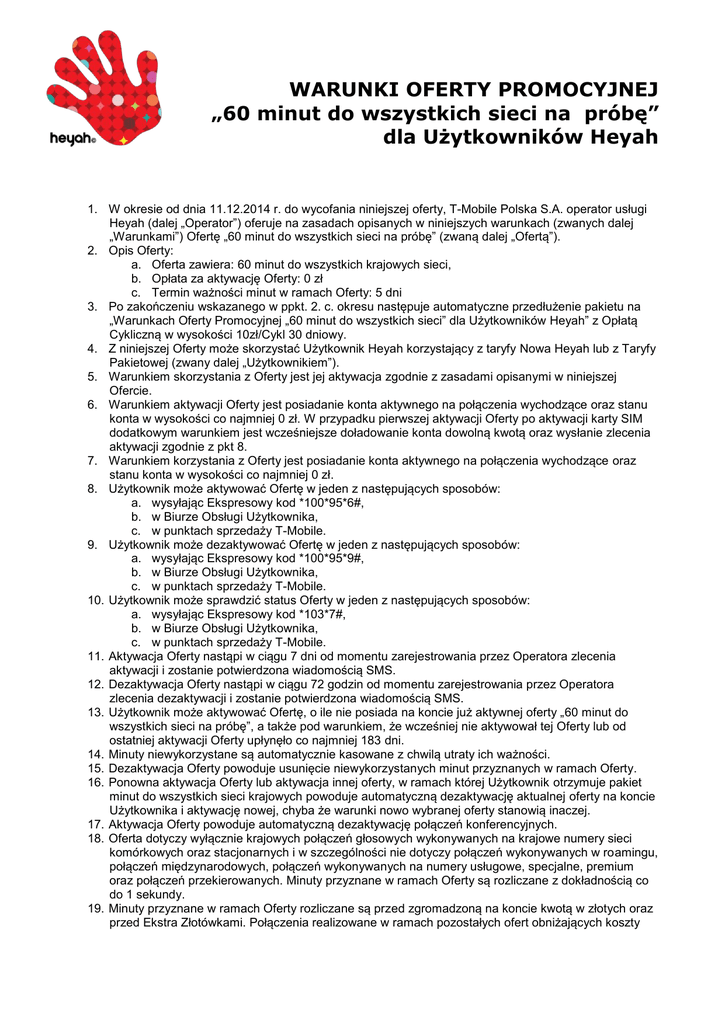WARUNKI OFERTY PROMOCYJNEJ „60 minut do wszystkich sieci na próbę” dla Użytkowników Heyah 1. W okresie od dnia 11.12.2014 r. do wycofania niniejszej oferty, T-Mobile Polska S.A. operator usługi Heyah (dalej „Operator”) oferuje na zasadach opisanych w niniejszych warunkach (zwanych dalej „Warunkami”) Ofertę „60 minut do wszystkich sieci na próbę” (zwaną dalej „Ofertą”). 2. Opis Oferty: a. Oferta zawiera: 60 minut do wszystkich krajowych sieci, b. Opłata za aktywację Oferty: 0 zł c. Termin ważności minut w ramach Oferty: 5 dni 3. Po zakończeniu wskazanego w ppkt. 2. c. okresu następuje automatyczne przedłużenie pakietu na „Warunkach Oferty Promocyjnej „60 minut do wszystkich sieci” dla Użytkowników Heyah” z Opłatą Cykliczną w wysokości 10zł/Cykl 30 dniowy. 4. Z niniejszej Oferty może skorzystać Użytkownik Heyah korzystający z taryfy Nowa Heyah lub z Taryfy Pakietowej (zwany dalej „Użytkownikiem”). 5. Warunkiem skorzystania z Oferty jest jej aktywacja zgodnie z zasadami opisanymi w niniejszej Ofercie. 6. Warunkiem aktywacji Oferty jest posiadanie konta aktywnego na połączenia wychodzące oraz stanu konta w wysokości co najmniej 0 zł. W przypadku pierwszej aktywacji Oferty po aktywacji karty SIM dodatkowym warunkiem jest wcześniejsze doładowanie konta dowolną kwotą oraz wysłanie zlecenia aktywacji zgodnie z pkt 8. 7. Warunkiem korzystania z Oferty jest posiadanie konta aktywnego na połączenia wychodzące oraz stanu konta w wysokości co najmniej 0 zł. 8. Użytkownik może aktywować Ofertę w jeden z następujących sposobów: a. wysyłając Ekspresowy kod *100*95*6#, b. w Biurze Obsługi Użytkownika, c. w punktach sprzedaży T-Mobile. 9. Użytkownik może dezaktywować Ofertę w jeden z następujących sposobów: a. wysyłając Ekspresowy kod *100*95*9#, b. w Biurze Obsługi Użytkownika, c. w punktach sprzedaży T-Mobile. 10. Użytkownik może sprawdzić status Oferty w jeden z następujących sposobów: a. wysyłając Ekspresowy kod *103*7#, b. w Biurze Obsługi Użytkownika, c. w punktach sprzedaży T-Mobile. 11. Aktywacja Oferty nastąpi w ciągu 7 dni od momentu zarejestrowania przez Operatora zlecenia aktywacji i zostanie potwierdzona wiadomością SMS. 12. Dezaktywacja Oferty nastąpi w ciągu 72 godzin od momentu zarejestrowania przez Operatora zlecenia dezaktywacji i zostanie potwierdzona wiadomością SMS. 13. Użytkownik może aktywować Ofertę, o ile nie posiada na koncie już aktywnej oferty „60 minut do wszystkich sieci na próbę”, a także pod warunkiem, że wcześniej nie aktywował tej Oferty lub od ostatniej aktywacji Oferty upłynęło co najmniej 183 dni. 14. Minuty niewykorzystane są automatycznie kasowane z chwilą utraty ich ważności. 15. Dezaktywacja Oferty powoduje usunięcie niewykorzystanych minut przyznanych w ramach Oferty. 16. Ponowna aktywacja Oferty lub aktywacja innej oferty, w ramach której Użytkownik otrzymuje pakiet minut do wszystkich sieci krajowych powoduje automatyczną dezaktywację aktualnej oferty na koncie Użytkownika i aktywację nowej, chyba że warunki nowo wybranej oferty stanowią inaczej. 17. Aktywacja Oferty powoduje automatyczną dezaktywację połączeń konferencyjnych. 18. Oferta dotyczy wyłącznie krajowych połączeń głosowych wykonywanych na krajowe numery sieci komórkowych oraz stacjonarnych i w szczególności nie dotyczy połączeń wykonywanych w roamingu, połączeń międzynarodowych, połączeń wykonywanych na numery usługowe, specjalne, premium oraz połączeń przekierowanych. Minuty przyznane w ramach Oferty są rozliczane z dokładnością co do 1 sekundy. 19. Minuty przyznane w ramach Oferty rozliczane są przed zgromadzoną na koncie kwotą w złotych oraz przed Ekstra Złotówkami. Połączenia realizowane w ramach pozostałych ofert obniżających koszty 20. 21. 22. 23. 24. połączeń nie powodują zmniejszenia salda minut zawartych w Ofercie, o ile warunki poszczególnych ofert nie stanowią inaczej. Operator może udostępnić inne sposoby aktywowania, dezaktywowania lub sprawdzenia statusu Oferty niż wskazane w niniejszych Warunkach. Informacje na ten temat dostępne są u Konsultanta w Biurze Obsługi Użytkownika oraz w punktach sprzedaży T-Mobile. Operator zastrzega sobie prawo do wycofania Oferty w każdym czasie bez podawania przyczyny. W przypadku Użytkownika, który skorzystał z Oferty wycofanie Oferty nie będzie powodować zaprzestania świadczenia usług na zasadach określonych w niniejszych Warunkach. W kwestiach nieuregulowanych niniejszymi Warunkami, zastosowanie mają postanowienia wiążącego Użytkownika regulaminu świadczenia usług telekomunikacyjnych przez Operatora oraz cennika. Podane ceny jednostkowe zawierają podatek VAT wyliczony według stawki 23 %. Stan konta oraz wartość poszczególnych połączeń, SMS-ów i usług są wyliczane w oparciu o ceny netto. Przy informowaniu Użytkownika o stanie konta podawana jest kwota obejmująca podatek VAT, zaokrąglona do pełnego grosza Użytkownik zobowiązuje się nie używać wydanych mu przez Operatora Kart SIM: a. do generowania automatycznego ruchu, w szczególności ruchu pomiędzy urządzeniami lub automatycznych połączeń pomiędzy urządzeniami a abonentem, b. do wspomagania lub budowania rozwiązań typu „call center”, w tym do wykonywania połączeń telefonicznych w takich rozwiązaniach (nie oznacza to zakazu wykonywania połączeń do call center), ani c. do masowego rozsyłania informacji (SMS lub MMS) przeznaczonych bezpośrednio lub pośrednio do promowania towarów, usług lub wizerunku Użytkownika lub innego podmiotu, jak również przeznaczonych do osiągnięcia jakiegokolwiek innego efektu handlowego (zakaz ten dotyczy Użytkownika działającego jako przedsiębiorca) oraz d. w inny sposób stanowiący rażące naruszenie przepisów prawa lub postanowień Umowy wskazany w wiążącym Użytkownika regulaminie świadczenia