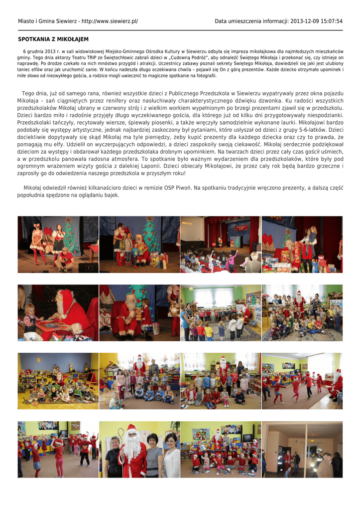 Miasto i Gmina Siewierz - http://www.siewierz.pl/ Data umieszczenia informacji: 2013-12-09 15:07:54 SPOTKANIA Z MIKOŁAJEM 6 grudnia 2013 r. w sali widowiskowej Miejsko-Gminnego Ośrodka Kultury w Siewierzu odbyła się impreza mikołajkowa dla najmłodszych mieszkańców gminy. Tego dnia aktorzy Teatru TRIP ze Świętochłowic zabrali dzieci w „Cudowną Podróż”, aby odnaleźć Świętego Mikołaja i przekonać się, czy istnieje on naprawdę. Po drodze czekało na nich mnóstwo przygód i atrakcji. Uczestnicy zabawy poznali sekrety Świętego Mikołaja, dowiedzieli się jaki jest ulubiony taniec elfów oraz jak uruchomić sanie. W końcu nadeszła długo oczekiwana chwila – pojawił się On z górą prezentów. Każde dziecko otrzymało upominek i miłe słowo od niezwykłego gościa, a rodzice mogli uwiecznić to magiczne spotkanie na fotografii. Tego dnia, już od samego rana, również wszystkie dzieci z Publicznego Przedszkola w Siewierzu wypatrywały przez okna pojazdu Mikołaja – sań ciągniętych przez renifery oraz nasłuchiwały charakterystycznego dźwięku dzwonka. Ku radości wszystkich przedszkolaków Mikołaj ubrany w czerwony strój i z wielkim workiem wypełnionym po brzegi prezentami zjawił się w przedszkolu. Dzieci bardzo miło i radośnie przyjęły długo wyczekiwanego gościa, dla którego już od kilku dni przygotowywały niespodzianki. Przedszkolaki tańczyły, recytowały wiersze, śpiewały piosenki, a także wręczyły samodzielnie wykonane laurki. Mikołajowi bardzo podobały się występy artystyczne, jednak najbardziej zaskoczony był pytaniami, które usłyszał od dzieci z grupy 5-6-latków. Dzieci dociekliwie dopytywały się skąd Mikołaj ma tyle pieniędzy, żeby kupić prezenty dla każdego dziecka oraz czy to prawda, że pomagają mu elfy. Udzielił on wyczerpujących odpowiedzi, a dzieci zaspokoiły swoją ciekawość. Mikołaj serdecznie podziękował dzieciom za występy i obdarował każdego przedszkolaka drobnym upominkiem. Na twarzach dzieci przez cały czas gościł uśmiech, a w przedszkolu panowała radosna atmosfera. To spotkanie było ważnym wydarzeniem dla przedszkolaków, które były pod ogromnym wrażeniem wizyty gościa z dalekiej Laponii. Dzieci obiecały Mikołajowi, że przez cały rok będą bardzo grzeczne i zaprosiły go do odwiedzenia naszego przedszkola w przyszłym roku! Mikołaj odwiedził również kilkanaścioro dzieci w remizie OSP Piwoń. Na spotkaniu tradycyjnie wręczono prezenty, a dalszą część popołudnia spędzono na oglądaniu bajek. Urząd Miasta i Gminy Siewierz, 42-470 Siewierz, ul. Żwirki i WIgury 16, tel. 32 64 99 400, e-mail: [email protected] Burmistrz Miasta i Gminy Siewierz mgr Zdzisław Banaś