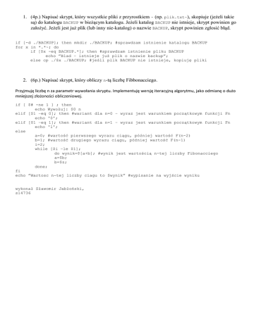 1. (4p.) Napisać skrypt, który wszystkie pliki z przyrostkiem ~ (np. plik.txt~), skopiuje (jeżeli takie są) do katalogu BACKUP w bieżącym katalogu. Jeżeli katalog BACKUP nie istnieje, skrypt powinien go założyć. Jeżeli jest już plik (lub inny nie-katalog) o nazwie BACKUP, skrypt powinien zgłosić błąd. if [-d ./BACKUP]; then mkdir ./BACKUP; #sprawdzam istnienie katalogu BACKUP for x in *.*~; do if [$x -eq BACKUP.*]; then #sprawdzam istnienie pliku BACKUP echo ”Blad – istnieje już plik o nazwie backup”; else cp ./$x ./BACKUP; #jeśli plik BACKUP nie istnieje, kopiuję pliki 2. (6p.) Napisać skrypt, który obliczy n-tą liczbę Fibbonacciego. Przyjmuję liczbę n za parametr wywołania skryptu. Implementuję wersję iteracyjną algorytmu, jako odmianę o dużo mniejszej złożoności obliczeniowej. if [ $# -ne 1 ] ; then echo Wywołuj: $0 n elif [$1 –eq 0]; then #wariant dla n=0 – wyraz jest warunkiem początkowym funkcji Fn echo '0'; elif [$1 –eq 1]; then #wariant dla n=1 – wyraz jest warunkiem początkowym funkcji Fn echo '1'; else a=0; #wartość pierwszego wyrazu ciągu, później wartość F(n-2) b=1; #wartość drugiego wyrazu ciągu, później wartość F(n-1) i=2; while [$i –le $1]; do wynik=$[a+b]; #wynik jest wartością n-tej liczby Fibonacciego a=$b; b=$z; done; fi echo ”Wartosc n-tej liczby ciagu to $wynik” #wypisanie na wyjście wyniku wykonał Sławomir Jabłoński, s14736