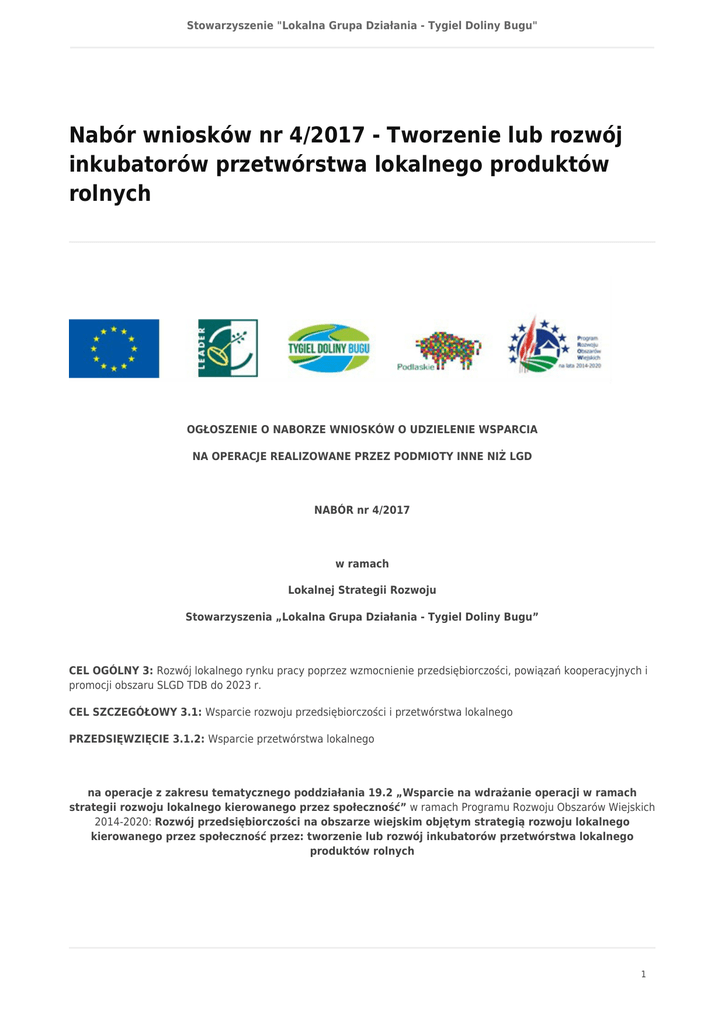 Stowarzyszenie "Lokalna Grupa Działania - Tygiel Doliny Bugu" Nabór wniosków nr 4/2017 - Tworzenie lub rozwój inkubatorów przetwórstwa lokalnego produktów rolnych OGŁOSZENIE O NABORZE WNIOSKÓW O UDZIELENIE WSPARCIA NA OPERACJE REALIZOWANE PRZEZ PODMIOTY INNE NIŻ LGD NABÓR nr 4/2017 w ramach Lokalnej Strategii Rozwoju Stowarzyszenia „Lokalna Grupa Działania - Tygiel Doliny Bugu” CEL OGÓLNY 3: Rozwój lokalnego rynku pracy poprzez wzmocnienie przedsiębiorczości, powiązań kooperacyjnych i promocji obszaru SLGD TDB do 2023 r. CEL SZCZEGÓŁOWY 3.1: Wsparcie rozwoju przedsiębiorczości i przetwórstwa lokalnego PRZEDSIĘWZIĘCIE 3.1.2: Wsparcie przetwórstwa lokalnego na operacje z zakresu tematycznego poddziałania 19.2 „Wsparcie na wdrażanie operacji w ramach strategii rozwoju lokalnego kierowanego przez społeczność” w ramach Programu Rozwoju Obszarów Wiejskich 2014-2020: Rozwój przedsiębiorczości na obszarze wiejskim objętym strategią rozwoju lokalnego kierowanego przez społeczność przez: tworzenie lub rozwój inkubatorów przetwórstwa lokalnego produktów rolnych 1 Stowarzyszenie "Lokalna Grupa Działania - Tygiel Doliny Bugu" I. Termin składania wniosków: Termin, od którego można składać wnioski: od 30 stycznia 2017 r. od godziny 8.00 Termin, do którego można składać wnioski: do 13 lutego 2017 r. do godziny 16.00 II. Miejsce składania wniosków: Stowarzyszenie „Lokalna Grupa Działania - Tygiel Doliny Bugu" ul. Warszawska 51 lok. 7 17-312 Drohiczyn III. Sposób składania wniosków o dofinansowanie: 1) Wniosek jest składany w terminie naboru bezpośrednio czyli: osobiście albo przez pełnomocnika albo przez osobę upoważnioną; 2) Wnioski nadsyłane drogą pocztową, faxem, pocztą e-mail lub w inny sposób nie będą uwzględniane; 3) Dokumenty należy złożyć w siedzibie biura LGD, w dniach trwania naboru, w poniedziałki w godzinach 8.00-16.00, wtorek - piątek w godzinach 7.30-15.30; 4) Wniosek składany jest w 2 egzemplarzach w wersji papierowej wraz z załącznikami. Do każdego egzemplarza wersji papierowej wniosku załącza się wersję elektroniczną wniosku na nośniku elektronicznym; 5) Złożenie wniosku o przyznanie pomocy w biurze LGD potwierdzane jest na kopii pierwszej strony tego wniosku. Potwierdzenie zawiera datę i godzinę złożenia wniosku o przyznanie pomocy, liczbę złożonych wraz z wnioskiem o przyznanie pomocy załączników oraz jest opatrzone pieczęcią LGD i podpisane przez osobę przyjmującą w biurze LGD ten wniosek; 6) O terminie złożenia wniosku decyduje data i godzina wpływu do biura LGD w terminie trwania naboru; 7) Kopia potwierdzona za zgodność z oryginałem powinna być: przez pracownika LGD, lub samorząd województwa, lub podmiot, który wydał dokument, lub w formie kopii poświadczonych za zgodność z oryginałem przez notariusza; 8) Za prawidłowe sporządzenie wniosku odpowiada Wnioskodawca; 9) Wnioski o przyznanie pomocy powinny być wypełniane w pliku typu EXCEL, natomiast BIZNESPLAN w pliku typu WORD zgodnie z dokumentami udostępnionymi w danym ogłoszeniu. IV. Formy wsparcia: 1) Pomoc przyznawana jest w formie refundacji kosztów kwalifikowanych. Pomoc ma charakter pomocy de minimis. 2) Pomoc jest przyznawana w wysokości określonej w LSR 2 Stowarzyszenie "Lokalna Grupa Działania - Tygiel Doliny Bugu" V. Warunki udzielenia wsparcia: 1. Wnioskodawca: O pomoc może ubiegać się podmiot będący: 1) osobą fizyczną, jeżeli: a) jest obywatelem państwa członkowskiego Unii Europejskiej; b) jest pełnoletnia; c) ma miejsce zamieszkania na obszarze wiejskim objętym LSR - w przypadku gdy osoba fizyczna nie wykonuje działalności gospodarczej, do której stosuje się przepisy ustawy z dnia 2 lipca 2004 r. o swobodzie działalności gospodarczej (Dz. U. z 2015 r. poz. 584 z późn. zm.); d) miejsce oznaczone adresem, pod którym wykonuje działalność gospodarczą, wpisanym do Centralnej Ewidencji i Informacji o Działalności Gospodarczej, znajduje się na obszarze wiejskim objętym LSR - w przypadku gdy osoba fizyczna wykonuje działalność gospodarczą, do której stosuje się przepisy ustawy z dnia 2 lipca 2004 r. o swobodzie działalności gospodarczej, albo 2) osobą prawną, z wyłączeniem województwa, jeżeli siedziba tej osoby lub jej oddziału znajduje się na obszarze wiejskim objętym LSR, albo 3) jednostką organizacyjną nieposiadającą osobowości prawnej, której ustawa przyznaje zdolność prawną, jeżeli siedziba tej jednostki lub jej oddziału znajduje się na obszarze wiejskim objętym LSR; 4) W przypadku gdy operacja będzie realizowana w ramach wykonywania działalności gospodarczej w formie spółki cywilnej warunki określone w ppkt. 1 powinny być spełnione przez wszystkich wspólników tej spółki; 5) W przypadku gdy podmiot ubiegający się o przyznanie pomocy wykonuje działalność gospodarczą, do której stosuje się przepisy ustawy z dnia 2 lipca 2004 r. o swobodzie działalności gospodarczej, pomoc jest przyznawana, jeżeli podmiot ten prowadzi mikroprzedsiębiorstwo albo małe przedsiębiorstwo w rozumieniu przepisów rozporządzenia Komisji (UE) nr 651/2014 z dnia 17 czerwca 2014 r. uznającego niektóre rodzaje pomocy za zgodne z rynkiem wewnętrznym w zastosowaniu art. 107 i 108 Traktatu (Dz. Urz. UE L 187 z 26.06.2014, str. 1). 2. Dofinansowanie można otrzymać na: tworzenie lub rozwój inkubatorów przetwórstwa lokalnego produktów rolnych będących przedsiębiorstwami spożywczymi w rozumieniu art. 3 pkt 2 rozporządzenia (WE) nr 178/2002 Parlamentu Europejskiego i Rady z dnia 28 stycznia 2002 r. ustanawiającego ogólne zasady i wymagania prawa żywnościowego, powołującego Europejski Urząd ds. Bezpieczeństwa Żywności oraz ustanawiającego procedury w zakresie bezpieczeństwa żywności (Dz. Urz. WE L 31 z 01.02.2002, str. 1, z późn. zm.; Dz. Urz. UE Polskie wydanie specjalne, rozdz. 15, t. 6, str. 463, z późn
