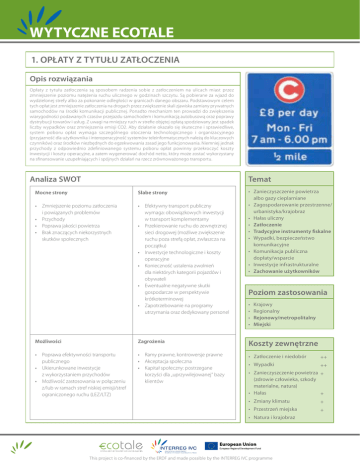 WYTYCZNE ECOTALE 1. OPŁATY Z TYTUŁU ZATŁOCZENIA Opis rozwiązania Opłaty z tytułu zatłoczenia są sposobem radzenia sobie z zatłoczeniem na ulicach miast przez zmniejszenie poziomu natężenia ruchu ulicznego w godzinach szczytu. Są pobierane za wjazd do wydzielonej strefy albo za pokonanie odległości w granicach danego obszaru. Podstawowym celem tych opłat jest zmniejszenie zatłoczenia na drogach przez zwiększenie skali zjawiska zamiany prywatnych samochodów na środki komunikacji publicznej. Ponadto mechanizm ten prowadzi do zwiększenia wiarygodności podawanych czasów przejazdu samochodem i komunikacją autobusową oraz poprawy dystrybucji towarów i usług. Z uwagi na mniejszy ruch w strefie objętej opłatą spodziewany jest spadek liczby wypadków oraz zmniejszenia emisji CO2. Aby działanie okazało się skuteczne i sprawiedliwe, system poboru opłat wymaga szczególnego otoczenia technologicznego i organizacyjnego (przyjazność dla użytkownika i interoperacyjność systemów teleinformatycznych należą do kluczowych czynników) oraz środków niezbędnych do egzekwowania zasad jego funkcjonowania. Niemniej jednak przychody z odpowiednio zdefiniowanego systemu poboru opłat powinny przekroczyć koszty inwestycji i koszty operacyjne, a zatem wygenerować dochód netto, który może zostać wykorzystany na sfinansowanie uzupełniających i spójnych działań na rzecz zrównoważonego transportu. Analiza SWOT Temat Mocne strony Słabe strony •• Zmniejszenie poziomu zatłoczenia i powiązanych problemów •• Przychody •• Poprawa jakości powietrza •• Brak znaczących niekorzystnych skutków społecznych •• Efektywny transport publiczny wymaga: obowiązkowych inwestycji w transport komplementarny •• Przekierowanie ruchu do zewnętrznej sieci drogowej (możliwe zwiększenie ruchu poza strefą opłat, zwłaszcza na początku) •• Inwestycje technologiczne i koszty operacyjne •• Konieczność ustalenia zwolnień dla niektórych kategorii pojazdów i obywateli •• Ewentualne negatywne skutki gospodarcze w perspektywie krótkoterminowej •• Zapotrzebowanie na programy utrzymania oraz dedykowany personel •• Zanieczyszczenie powietrza albo gazy cieplarniane •• Zagospodarowanie przestrzenne/ urbanistyka/krajobraz •• Hałas uliczny •• Zatłoczenie •• Tradycyjne instrumenty fiskalne •• Wypadki, bezpieczeństwo komunikacyjne •• Komunikacja publiczna dopłaty/wsparcie •• Inwestycje infrastrukturalne •• Zachowanie użytkowników Poziom zastosowania •• •• •• •• Krajowy Regionalny Rejonowy/metropolitalny Miejski Możliwości Zagrożenia Koszty zewnętrzne •• Poprawa efektywności transportu publicznego •• Ukierunkowane inwestycje z wykorzystaniem przychodów •• Możliwość zastosowania w połączeniu z/lub w ramach stref niskiej emisji/stref ograniczonego ruchu (LEZ/LTZ) •• Ramy prawne, kontrowersje prawne •• Akceptacja społeczna •• Kapitał społeczny: postrzegane korzyści dla „uprzywilejowanej” bazy klientów •• Zatłoczenie i niedobór ++ •• Wypadki ++ •• Zanieczyszczenie powietrza + (zdrowie człowieka, szkody materialne, natura) •• Hałas + •• Zmiany klimatu + •• Przestrzeń miejska + •• Natura i krajobraz This project is co-financed by the ERDF and made possible by the INTERREG IVC programme WYTYCZNE ECOTALE Sugestie metodologiczne Składnik kosztów Koszt zewnętrzny Elementy kosztów czas podróży (cel, środek transportu, długość przejazdów pasażerskich, środek transportu oraz rodzaj towaru do transportu) bezpieczeństwo uciążliwość Zatłoczenie i niedobór wydłużenie czasu podróży x wartość czasu x wielkość ruchu spadek wartości dodatkowe koszty paliwa koszty środowiskowe opóźnienie bezpośrednie i wywołane koszt alternatywny Wypadki Zanieczyszczenie powietrza Hałas Zmiana klimatu Przestrzeń miejska WTP/WTA w celu oszacowania wartości czasu w przypadku zatłoczenia rodzaj infrastruktury Potrzebne dane Istotne kwestie dot. wyceny stosunek prędkość/ przepływ stosunek prędkość/ przepływ wielkość i skład strumienia ruchu rodzaj sieci (miejska, międzymiastowa, metropolitalna - liczba pasów) elastyczność popytu wartość czasu poziom przepustowości w czasie WTP w celu oszacowania kosztów związanych z niedoborem marginalne koszty społeczne poziom ruchu koszt wzrasta nieznacznie wraz z ruchem i w zależności od sytuacji (czas-miejsce) koszt alternatywny przepustowość koszt zasobów w celu poprawy stanu zdrowia podejście do ryzyka utrata produktywności utrata życia ludzkiego Koszty zanieczyszczenia powietrza są powodowane przez emisję cząstek stałych (PM), NOx, SO2 i VOC. Koszty zanieczyszczenia powietrza są także generowane przez przemysł, rolnictwo i gospodarstwa domowe. Proponowane techniki szacowania natężenie ruchu koszty leczenia szkody materialne, koszty administracyjne i medyczne, straty produkcyjne i oszacowanie kosztów dla przyjaciół/ krewnych Funkcja/nośnik kosztów rodzaj infrastruktury rozkład prędkości WTP/WTA w celu oszacowania wartości statystycznego życia ludzkiego dzień/noc pogoda baza danych wypadków i ich skutków (obrażenia ciężkie/lekkie, ofiary śmiertelne...) szkody w budynkach poziom ruchu struktura pojazdów szkody w rolnictwie lokalizacja - narażenie szkody dla zdrowia człowieka gęstość zaludnienia i osiedli dane dotyczące emisji wg rodzaju zanieczyszczeń szkody w ekosystemach Hałas może być zdefiniowany jako niepożądany dźwięk, który powoduje fizjologiczne lub psychiczne szkody dla ludzi. Zaleca się wzięcie pod uwagę grupy wrażliwe, takie jak dzieci i osoby starsze. Zmiana klimatu to zagrożenie o charakterze długoterminowym i globalnym. Zróżnicowane podejście (uwzględniające zarówno szkody, jak i strategię ich unikania) jest konieczne. Ponadto należy uwzględnić ryzyka długoterminowe. Wpływ transportu w
