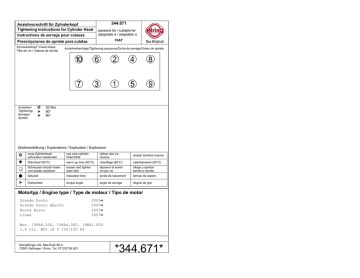 Anziehvorschrift für Zylinderkopf Tightening Instructions for Cylinder Head Instructions de serrage pour culasse 344.671 passend für / suitable for adaptable à / adaptable a FIAT Prescripciones de apriete para culatas Schraubenkopf / Head shape Tête de vis / Cabeza de tornillo Anziehen/ Tightening/ Serrage/ Apriete ❂ ➤ ➤ Anziehreihenfolge/Tightening sequence/Ordre de serrage/Orden de apriete 30 Nm 90° 90° Zeichenerklärung / Explanations / Explication / Explicacion ❂ neue Zylinderkopfschrauben verwenden use new cylinder head bolts utiliser des vis neuves emplar tornillos nuevos ✱ Warmlauf (80°C) warm up time (80°C) chauffage (80°C) calentamiento (80°C) ❏ Schrauben einzeln lösen und wieder anziehen loosen and tighten each bolt deserrer et serrer vis par vis aflojar y apretar tornillo a tornillo ● Setzzeit relaxation time durée de tassement tiempo de espera ➤ Drehwinkel torque angle angle de serrage ángulo de giro Motortyp / Engine type / Type de moteur / Tipo de motor Grande Punto Grande Punto Abarth Nuova Bravo Linea 2005® 2007® 2007® 2007® Mot. 199A8.000, 198A4.000, 198A1.000 1,4 Ltr. MPI 16 V 120/150 PS ElringKlinger AG, Max-Eyth-Str.2 72581 Dettingen / Erms. Tel. 07123/724 601 *344.671*