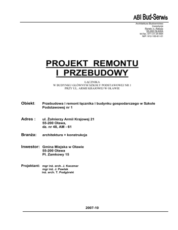 Architektura Budownictwo Inwestycje Rynek ¼ Ratusz 55-200 OŁAWA tel.fax. 071-31-34-664 NIP: 912-100-61-01 PROJEKT REMONTU I PRZEBUDOWY ŁĄCZNIKA W BUDYNKU GŁÓWNYM SZKOŁY PODSTAWOWEJ NR 1 PRZY UL. ARMII KRAJOWEJ W OŁAWIE Obiekt: Przebudowa i remont łącznika i budynku gospodarczego w Szkole Podstawowej nr 1 Adres : ul. Żołnierzy Armii Krajowej 21 55-200 Oława, dz. nr 48, AM - 61 Branża: architektura + konstrukcja Inwestor: Gmina Miejska w Oławie 55-200 Oława Pl. Zamkowy 15 Projektant: mgr inż. arch. J. Kaczmar mgr inż. J. Pawlak inż. arch. T. Podgórski 2007-10 ABI BUD-SERWIS Oława Inwestor: Gmina Miejska w Oławie Adres: pl. Zamkowy 15, 55-200 Oława Projekt Budowlany Przebudowa łącznika budynku szkolnego i budynku gospodarczego Zawartość opracowania 1.Część opisowa 1.1.Opis techniczny do projektu architektoniczno-budowlanego. 2.Część graficzna 2.1.Rysunki architektoniczne Projekt zagospodarowania terenu Rzut parteru – inwentaryzacja Rzut piętra – inwentaryzacja Przekrój - inwentaryzacja Elewacja boczna wschodnia i zachodnia - inwentaryzacja Projekt przebudowy parter Projekt przebudowy piętro Projekt przebudowy przekrój podłużny Projekt przebudowy przekrój poprzeczny Elewacja boczna zachodnia Elewacja boczna wschodnia Szczegół konstrukcyjny – przekrój poprzeczny Szczegół konstrukcyjny – przekrój podłużny AO A1 A2 A3 A4 A5 A6 A7 A8 A9 A10 A11 A12 ABI BUD-SERWIS Oława Inwestor: Gmina Miejska w Oławie Adres: pl. Zamkowy 15, 55-200 Oława Projekt Budowlany Przebudowa łącznika budynku szkolnego i budynku gospodarczego Opis techniczny do projektu architektoniczno-budowlanego 1.0.Dane ogólne. 1.1.Obiekt: Łącznik szkolny budynku Szkoły Podstawowej nr 1 – między klatką schodową, a budynkiem sali gimnastycznej, oraz budynek gospodarczy przybudowany do starej sali gimnastycznej. 1.2. Adres: ul. Żołnierzy Armii Krajowej 21, 55-200 Oława, dz.nr 48, AM – 61. 1.3.Inwestor: Gmina Miejska w Oławie, pl. Zamkowy 15, 55-200 Oława. 1.4.Przedmiot opracowania. Przedmiotem opracowania jest projekt architektoniczno-budowlany przebudowy łącznika szkolnego między salą gimnastyczną na parterze i salą lekcyjną na piętrze a klatką schodową w budynku głównym szkoły Podstawowej nr 1, w nawiązaniu do układu istniejących ścian gmachu szkoły oraz sali gimnastycznej. Przedmiotowa przebudowa i remont obiektu ma służyć: - poprawie bezpieczeństwa poruszających się przez łącznik uczniów - poprawie wyposażenia architektonicznego i estetyki obiektu W budynku gospodarczym projektuje się wzmocnienie ścian i nadproży w otworach drzwiowych. 1.5.Podstawa opracowania: Zlecenie inwestora Uzgodnienia funkcjonalno-materiałowe z inwestorem Wypis z rejestru gruntów. Obowiązujące normy i przepisy 1.5.Cel i zakres opracowania. Celem opracowania jest wykonanie projektu przebudowy łącznika szkolnego oraz projekt wzmocnienia nadproży drzwiowych w budynku gospodarczym. W zakres opracowania wchodzą przede wszystkim: - ocena aktualnego stanu technicznego elementów konstrukcyjnych obiektu poparta opisem, dokumentacją fotograficzną i zakończona wnioskami, - inwentaryzacja uszkodzeń konstrukcji budynku oraz określenie właściwych sposobów ich naprawy, - wnioski i zalecenia dotyczące zakresu remontu i naprawy przedmiotowych części budynku szkoły. 2.0.Przeznaczenie i program użytkowy obiektu budowlanego. 2.1.Przeznaczenie obiektu. Przebudowywany obiekt, to łącznik pomiędzy głównym budynkiem szkoły a salą gimnastyczną. Łącznik jest budynkiem dwukondygnacyjnym. Budynek sali gimnastycznej jest również dwukondygnacyjny: na parterze mieści się mała sala gimnastyczna, na piętrze sala lekcyjna. Przebudowa obiektu łącznika planowana jest w nawiązaniu do istniejących ścian budynku szkoły oraz sali gimnastycznej. W drugim obiekcie – budynku gospodarczym zaprojektowano sposób wzmocnienia nadproży w otworach drzwiowych. 2.2.Program użytkowy. Parter: Łącznik Sala gimnastyczna Pom.gospodarcze Pom.gospodarcze Pom.gospodarcze Pom.gospodarcze 5,4m2 52,5m2 17,3m2 8,3m2 4,0m2 3,2m2 ABI BUD-SERWIS Oława Inwestor: Gmina Miejska w Oławie Adres: pl. Zamkowy 15, 55-200 Oława Piętro: Łącznik Sala lekcyjna OGÓŁEM: 2.3.Charakterystyczne parametry obiektu. Powierzchnia użytkowa Powierzchnia całkowita Kubatura Projekt Budowlany Przebudowa łącznika budynku szkolnego i budynku gospodarczego 5,7m2 54,4m2 150,80m2 150,80m2 192,00m2 379,14m3 3.0.Forma i funkcja obiektu. 3.1.Bryła i forma architektoniczna Przebudowywany łącznik to obiekt dwukondygnacyjny, jedno bryłowy przykryty dachem płaskim połączonym z dachu budynku sali gimnastycznej. Budynek gospodarczy to obiekt parterowy przykryty również dachem płaskim. 3.2.Dostosowanie do otoczenia i krajobrazu. Projektowane obiekty wkomponowane są w istniejącą zabudowę szkoły i nawiązują kształtem do istniejącego budynku. 3.3.Spełnienie przepisów Prawa Budowlanego. Zaprojektowany obiekt spełnia wymagania dotyczące: A/ bezpieczeństwa konstrukcji B/ bezpieczeństwa pożarowego C/ bezpieczeństwa użytkowania D/ warunków higieniczno-zdrowotnych E/ warunków ochrony środowiska F/ ochrony przed hałasem i drganiami G/ oszczędności energii i odpowiedniej izolacyjności cieplnej przegród budowlanych H/ warunków użytkowych zgodnych z parametrami obiektu, w szczególności w zakresie oświetlenia, zaopatrzenia w wodę, odprowadzenia ścieków i usuwania odpadów, ogrzewania, wentylacji 4.0.Projektowany układ konstrukcyjny. 4.1.Zastosowane schematy konstrukcyjne. • Pod projektowane ściany proponuje się płytę żelbetową. • Ściany zewnętrzne wykonać z bloczków gazobetonowych. • Strop pomiędzy kondygnacjami zachować, podeprzeć trzema stalowymi dwuteownikami I 180mm. • Konstrukcje istniejącego dachu zachować i podeprzeć trzema stalowymi dwuteownikami I 180mm. • Projektowane nadproża proponuje się wykonać z dwóch stalowych dwuteowników