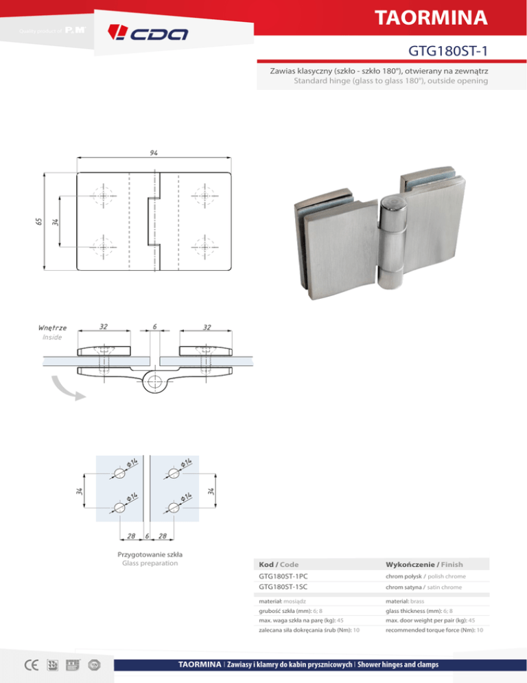TAORMINA GTG180ST-1 Zawias klasyczny (szkło - szkło 180°), otwierany na zewnątrz Standard hinge (glass to glass 180°), outside opening 34 32 Wnętrze Inside 6 32 4 4 ⌀1 4 ⌀1 34 ⌀1 4 ⌀1 28 6 34 65 94 28 Przygotowanie szkła Glass preparation Kod / Code Wykończenie / Finish GTG180ST-1PC GTG180ST-1SC chrom połysk / polish chrome materiał: mosiądz material: brass grubość szkła (mm): 6; 8 glass thickness (mm): 6; 8 max. waga szkła na parę (kg): 45 max. door weight per pair (kg): 45 zalecana siła dokręcania śrub (Nm): 10 recommended torque force (Nm): 10 chrom satyna / satin chrome TAORMINA І Zawiasy i klamry do kabin prysznicowych І Shower hinges and clamps