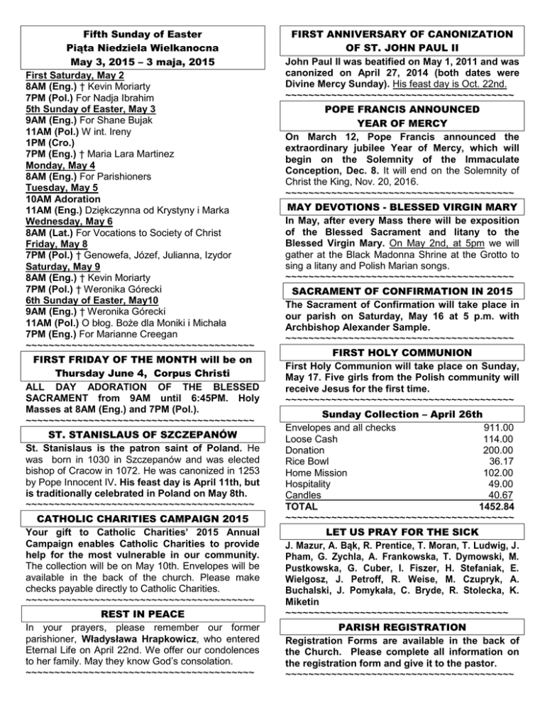Fifth Sunday of Easter Piąta Niedziela Wielkanocna May 3, 2015 – 3 maja, 2015 First Saturday, May 2 8AM (Eng.) † Kevin Moriarty 7PM (Pol.) For Nadja Ibrahim 5th Sunday of Easter, May 3 9AM (Eng.) For Shane Bujak 11AM (Pol.) W int. Ireny 1PM (Cro.) 7PM (Eng.) † Maria Lara Martinez Monday, May 4 8AM (Eng.) For Parishioners Tuesday, May 5 10AM Adoration 11AM (Eng.) Dziękczynna od Krystyny i Marka Wednesday, May 6 8AM (Lat.) For Vocations to Society of Christ Friday, May 8 7PM (Pol.) † Genowefa, Józef, Julianna, Izydor Saturday, May 9 8AM (Eng.) † Kevin Moriarty 7PM (Pol.) † Weronika Górecki 6th Sunday of Easter, May10 9AM (Eng.) † Weronika Górecki 11AM (Pol.) O błog. Boże dla Moniki i Michała 7PM (Eng.) For Marianne Creegan ~~~~~~~~~~~~~~~~~~~~~~~~~~~~~~~~~~~~~~~~ FIRST FRIDAY OF THE MONTH will be on Thursday June 4, Corpus Christi ALL DAY ADORATION OF THE BLESSED SACRAMENT from 9AM until 6:45PM. Holy Masses at 8AM (Eng.) and 7PM (Pol.). ~~~~~~~~~~~~~~~~~~~~~~~~~~~~~~~~~~~~~~~~ ST. STANISLAUS OF SZCZEPANÓW St. Stanislaus is the patron saint of Poland. He was born in 1030 in Szczepanów and was elected bishop of Cracow in 1072. He was canonized in 1253 by Pope Innocent IV. His feast day is April 11th, but is traditionally celebrated in Poland on May 8th. ~~~~~~~~~~~~~~~~~~~~~~~~~~~~~~~~~~~~~~~~ CATHOLIC CHARITIES CAMPAIGN 2015 Your gift to Catholic Charities’ 2015 Annual Campaign enables Catholic Charities to provide help for the most vulnerable in our community. The collection will be on May 10th. Envelopes will be available in the back of the church. Please make checks payable directly to Catholic Charities. ~~~~~~~~~~~~~~~~~~~~~~~~~~~~~~~~~~~~~~~~ REST IN PEACE In your prayers, please remember our former parishioner, Władysława Hrapkowicz, who entered Eternal Life on April 22nd. We offer our condolences to her family. May they know God’s consolation. ~~~~~~~~~~~~~~~~~~~~~~~~~~~~~~~~~~~~~~~~ FIRST ANNIVERSARY OF CANONIZATION OF ST. JOHN PAUL II John Paul II was beatified on May 1, 2011 and was canonized on April 27, 2014 (both dates were Divine Mercy Sunday). His feast day is Oct. 22nd. ~~~~~~~~~~~~~~~~~~~~~~~~~~~~~~~~~~~~~~~~ POPE FRANCIS ANNOUNCED YEAR OF MERCY On March 12, Pope Francis announced the extraordinary jubilee Year of Mercy, which will begin on the Solemnity of the Immaculate Conception, Dec. 8. It will end on the Solemnity of Christ the King, Nov. 20, 2016. ~~~~~~~~~~~~~~~~~~~~~~~~~~~~~~~~~~~~~~~~ MAY DEVOTIONS - BLESSED VIRGIN MARY In May, after every Mass there will be exposition of the Blessed Sacrament and litany to the Blessed Virgin Mary. On May 2nd, at 5pm we will gather at the Black Madonna Shrine at the Grotto to sing a litany and Polish Marian songs. ~~~~~~~~~~~~~~~~~~~~~~~~~~~~~~~~~~~~~~~~ SACRAMENT OF CONFIRMATION IN 2015 The Sacrament of Confirmation will take place in our parish on Saturday, May 16 at 5 p.m. with Archbishop Alexander Sample. ~~~~~~~~~~~~~~~~~~~~~~~~~~~~~~~~~~~~~~~~ FIRST HOLY COMMUNION First Holy Communion will take place on Sunday, May 17. Five girls from the Polish community will receive Jesus for the first time. ~~~~~~~~~~~~~~~~~~~~~~~~~~~~~~~~~~~~~~~~ Sunday Collection – April 26th Envelopes and all checks 911.00 Loose Cash 114.00 Donation 200.00 Rice Bowl 36.17 Home Mission 102.00 Hospitality 49.00 Candles 40.67 TOTAL 1452.84 ~~~~~~~~~~~~~~~~~~~~~~~~~~~~~~~~~~~~~~~~ LET US PRAY FOR THE SICK J. Mazur, A. Bąk, R. Prentice, T. Moran, T. Ludwig, J. Pham, G. Zychla, A. Frankowska, T. Dymowski, M. Pustkowska, G. Cuber, I. Fiszer, H. Stefaniak, E. Wielgosz, J. Petroff, R. Weise, M. Czupryk, A. Buchalski, J. Pomykała, C. Bryde, R. Stolecka, K. Miketin ~~~~~~~~~~~~~~~~~~~~~~~~~~~~~~~~~~~~~~~ PARISH REGISTRATION Registration Forms are available in the back of the Church. Please complete all information on the registration form and give it to the pastor. ~~~~~~~~~~~~~~~~~~~~~~~~~~~~~~~~~~~~~~~~ ROK MIŁOSIERDZIA Papież Franciszek ogłosił Rok Miłosierdzia, który rozpocznie się uroczystością Niepokalanego Poczęcia, 8 grudnia 2015 i zakończy się w uroczystość Chrystusa Króla, 20 listopada 2016. ~~~~~~~~~~~~~~~~~~~~~~~~~~~~~~~~~~~~~~~~ NABOŻEŃSTWA MAJOWE Przez miesiąc maj, po każdej Mszy św. Wystawienie Najśw. Sakramentu i litania Loretańska do N.M.P. Pierwsze nabożeństwo majowe w Grotto 2 maja godz. 17:00 a ostatnia majówka w niedzielę 31 maja w Grotto o godz. 17:00. ~~~~~~~~~~~~~~~~~~~~~~~~~~~~~~~~~~~~~~~~ ŚWIĘTY STANISŁAW ZE SZCZEPANOWA ur. ok. 1030 w Szczepanowie zm. 11 kwietnia 1079 w Krakowie Tradycyjnie wspomnienie św. Stanisława w kościele katolickim obchodzone jest 11 kwietnia (dzień śmierci), natomiast w polskim Kościele 8 maja. W roku 1963 papież Jan XXIII ustanowił św. Stanisława wraz ze św. Wojciechem i NMP Królową Polski głównymi patronami Polski. Jan Paweł II nazwał św. Stanisława “’patronem chrześcijańskiego ładu moralnego”. W ikonografii sposobem polskiego świętego przedstawia się w szatach pontyfikalnych. Jego atrybuty to orzeł, pastorał i umarły Piotrowin. Msza św. w piątek 8 maja o godz. 19:00, a w niedzielę 10 maja o godz. 11:00 uroczysta Msza ku czci naszego Patrona, Św. Stanisława. ~~~~~~~~~~~~~~~~~~~~~~~~~~~~~~~~~~~~~~~~ CATHOLIC CHARITY 2015 CAMPAIGN druga taca 10 maja Raz w roku Catholic Charity zwraca się z prośbą o pomoc w zebraniu środków na cele charytatywne, które świadczy ta organizacja – adopcja, pomoc szkołom, uchodźcom, głodnym, bezdomnym, samotnym matkom. Koperty są z tyłu kościoła; prosimy wystawiać czeki na Catholic Charity. Dziękujemy za wszystkie ofiary złożone na organizację Catholic Charity. ~~~~~~~~~~~~~~~~~~~~~~~~~~~~~~~~~~~~~~~~ Ś.P. KARDYNAŁ FRANCIS GEORGE 16 stycznia 1937 - 17 kwietnia 2015 Kardynał Francis George zmarł 17 kwietnia w Chicago w wieku 78 lat po długiej walce z chorobą nowotworową. Biskup George w 1996 r. został mianowany głową archidiecezji w Portland. Urząd ten s