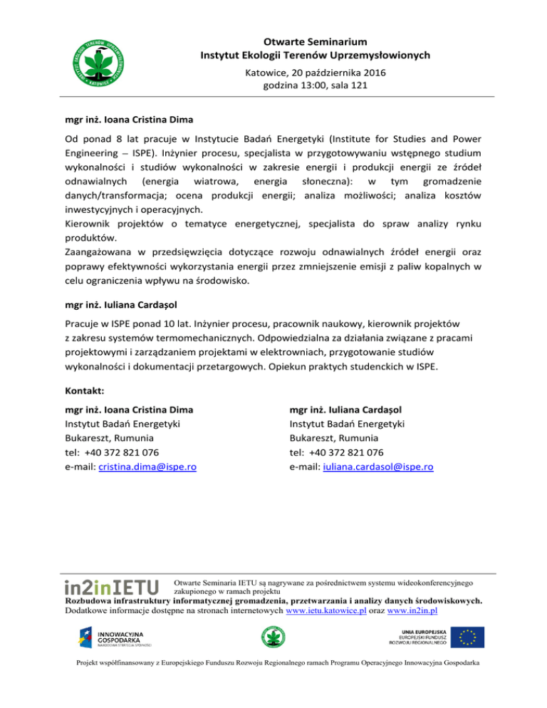 Otwarte Seminarium Instytut Ekologii Terenów Uprzemysłowionych Katowice, 20 października 2016 godzina 13:00, sala 121 mgr inż. Ioana Cristina Dima Od ponad 8 lat pracuje w Instytucie Badań Energetyki (Institute for Studies and Power Engineering – ISPE). Inżynier procesu, specjalista w przygotowywaniu wstępnego studium wykonalności i studiów wykonalności w zakresie energii i produkcji energii ze źródeł odnawialnych (energia wiatrowa, energia słoneczna): w tym gromadzenie danych/transformacja; ocena produkcji energii; analiza możliwości; analiza kosztów inwestycyjnych i operacyjnych. Kierownik projektów o tematyce energetycznej, specjalista do spraw analizy rynku produktów. Zaangażowana w przedsięwzięcia dotyczące rozwoju odnawialnych źródeł energii oraz poprawy efektywności wykorzystania energii przez zmniejszenie emisji z paliw kopalnych w celu ograniczenia wpływu na środowisko. mgr inż. Iuliana Cardașol Pracuje w ISPE ponad 10 lat. Inżynier procesu, pracownik naukowy, kierownik projektów z zakresu systemów termomechanicznych. Odpowiedzialna za działania związane z pracami projektowymi i zarządzaniem projektami w elektrowniach, przygotowanie studiów wykonalności i dokumentacji przetargowych. Opiekun praktych studenckich w ISPE. Kontakt: mgr inż. Ioana Cristina Dima Instytut Badań Energetyki Bukareszt, Rumunia tel: +40 372 821 076 e-mail: [email protected] mgr inż. Iuliana Cardașol Instytut Badań Energetyki Bukareszt, Rumunia tel: +40 372 821 076 e-mail: [email protected] Otwarte Seminaria IETU są nagrywane za pośrednictwem systemu wideokonferencyjnego zakupionego w ramach projektu Rozbudowa infrastruktury informatycznej gromadzenia, przetwarzania i analizy danych środowiskowych. Dodatkowe informacje dostępne na stronach internetowych www.ietu.katowice.pl oraz www.in2in.pl Projekt współfinansowany z Europejskiego Funduszu Rozwoju Regionalnego ramach Programu Operacyjnego Innowacyjna Gospodarka
