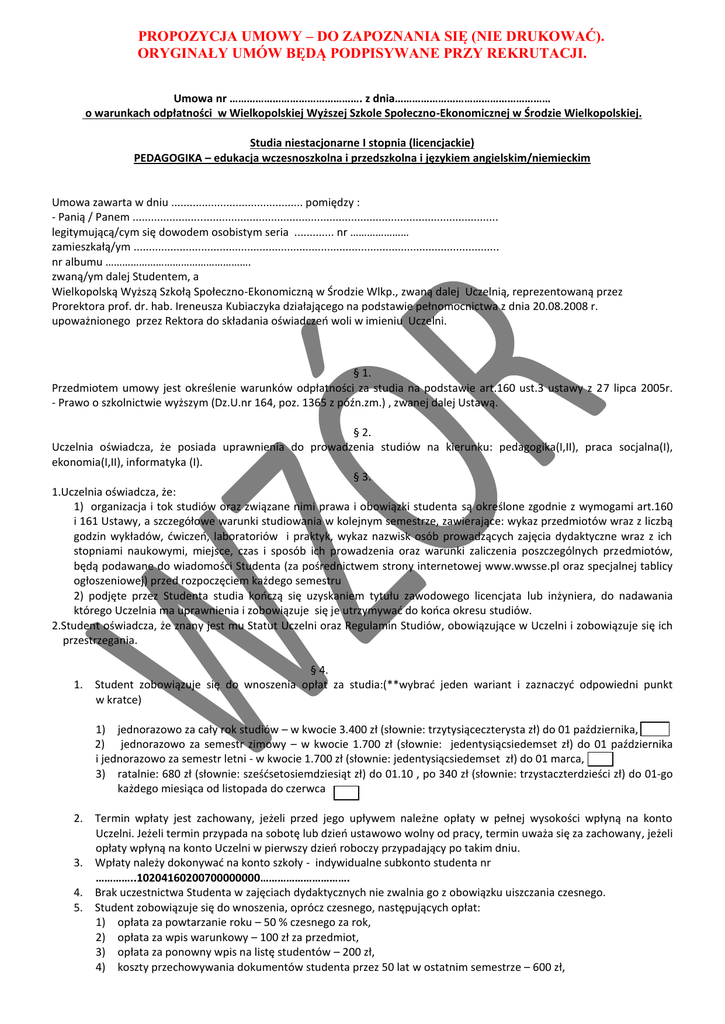 PROPOZYCJA UMOWY – DO ZAPOZNANIA SIĘ (NIE DRUKOWAĆ). ORYGINAŁY UMÓW BĘDĄ PODPISYWANE PRZY REKRUTACJI. Umowa nr ………………………………………. z dnia……………………………………………… o warunkach odpłatności w Wielkopolskiej Wyższej Szkole Społeczno-Ekonomicznej w Środzie Wielkopolskiej. Studia niestacjonarne I stopnia (licencjackie) PEDAGOGIKA – edukacja wczesnoszkolna i przedszkolna i językiem angielskim/niemieckim Umowa zawarta w dniu ........................................... pomiędzy : - Panią / Panem ....................................................................................................................... legitymującą/cym się dowodem osobistym seria ............. nr ………………… zamieszkałą/ym ....................................................................................................................... nr albumu ……………………………………………. zwaną/ym dalej Studentem, a Wielkopolską Wyższą Szkołą Społeczno-Ekonomiczną w Środzie Wlkp., zwaną dalej Uczelnią, reprezentowaną przez Prorektora prof. dr. hab. Ireneusza Kubiaczyka działającego na podstawie pełnomocnictwa z dnia 20.08.2008 r. upoważnionego przez Rektora do składania oświadczeń woli w imieniu Uczelni. § 1. Przedmiotem umowy jest określenie warunków odpłatności za studia na podstawie art.160 ust.3 ustawy z 27 lipca 2005r. - Prawo o szkolnictwie wyższym (Dz.U.nr 164, poz. 1365 z późn.zm.) , zwanej dalej Ustawą. § 2. Uczelnia oświadcza, że posiada uprawnienia do prowadzenia studiów na kierunku: pedagogika(I,II), praca socjalna(I), ekonomia(I,II), informatyka (I). § 3. 1.Uczelnia oświadcza, że: 1) organizacja i tok studiów oraz związane nimi prawa i obowiązki studenta są określone zgodnie z wymogami art.160 i 161 Ustawy, a szczegółowe warunki studiowania w kolejnym semestrze, zawierające: wykaz przedmiotów wraz z liczbą godzin wykładów, ćwiczeń, laboratoriów i praktyk, wykaz nazwisk osób prowadzących zajęcia dydaktyczne wraz z ich stopniami naukowymi, miejsce, czas i sposób ich prowadzenia oraz warunki zaliczenia poszczególnych przedmiotów, będą podawane do wiadomości Studenta (za pośrednictwem strony internetowej www.wwsse.pl oraz specjalnej tablicy ogłoszeniowej) przed rozpoczęciem każdego semestru 2) podjęte przez Studenta studia kończą się uzyskaniem tytułu zawodowego licencjata lub inżyniera, do nadawania którego Uczelnia ma uprawnienia i zobowiązuje się je utrzymywać do końca okresu studiów. 2.Student oświadcza, że znany jest mu Statut Uczelni oraz Regulamin Studiów, obowiązujące w Uczelni i zobowiązuje się ich przestrzegania. § 4. 1. Student zobowiązuje się do wnoszenia opłat za studia:(**wybrać jeden wariant i zaznaczyć odpowiedni punkt w kratce) 1) jednorazowo za cały rok studiów – w kwocie 3.400 zł (słownie: trzytysiąceczterysta zł) do 01 października, 2) jednorazowo za semestr zimowy – w kwocie 1.700 zł (słownie: jedentysiącsiedemset zł) do 01 października i jednorazowo za semestr letni - w kwocie 1.700 zł (słownie: jedentysiącsiedemset zł) do 01 marca, 3) ratalnie: 680 zł (słownie: sześćsetosiemdziesiąt zł) do 01.10 , po 340 zł (słownie: trzystaczterdzieści zł) do 01-go każdego miesiąca od listopada do czerwca 2. Termin wpłaty jest zachowany, jeżeli przed jego upływem należne opłaty w pełnej wysokości wpłyną na konto Uczelni. Jeżeli termin przypada na sobotę lub dzień ustawowo wolny od pracy, termin uważa się za zachowany, jeżeli opłaty wpłyną na konto Uczelni w pierwszy dzień roboczy przypadający po takim dniu. 3. Wpłaty należy dokonywać na konto szkoły - indywidualne subkonto studenta nr …………..10204160200700000000…………………………. 4. Brak uczestnictwa Studenta w zajęciach dydaktycznych nie zwalnia go z obowiązku uiszczania czesnego. 5. Student zobowiązuje się do wnoszenia, oprócz czesnego, następujących opłat: 1) opłata za powtarzanie roku – 50 % czesnego za rok, 2) opłata za wpis warunkowy – 100 zł za przedmiot, 3) opłata za ponowny wpis na listę studentów – 200 zł, 4) koszty przechowywania dokumentów studenta przez 50 lat w ostatnim semestrze – 600 zł, 6. Student obowiązany jest również do wniesienia opłat ustalonych przez ministra właściwego do spraw szkolnictwa wyższego za: 7. 8. 9. 10. 11. 12. 1) wydanie duplikatów legitymacji studenckiej – 7,50 zł (słownie: siedem zł 50/100), 2) wydanie duplikatu indeksu - 6,00 zł (słownie: sześć zł), 3) wydanie duplikatu dyplomu ukończenia studiów - 90 zł (słownie: dziewięćdziesiąt zł), 4) wydanie odpisu dyplomu w tłumaczeniu na język obcy – 40 zł (słownie: czterdzieści zł). Uczelnia nie pobiera opłat za: egzaminy, egzaminy poprawkowe, złożenie i recenzję prac dyplomowych, wydanie suplementu do dyplomu oraz procedurę wpisu na pierwszy i kolejne semestry, za wydanie legitymacji, indeksu, zaświadczeń o kontynuowaniu nauki. Wpłaty czesnego zawsze są naliczane w pierwszej kolejności na poczet najstarszego (najdłużej wymagalnego)długu. Do najstarszego długu nalicza się również odsetki. W przypadku, gdy Student opóźnia się z opłatą za studia dłużej niż 90 dni dziekan może wzywać go w sposób przyjęty na Wydziale, do uiszczenia opłaty czesnego powiększonego o odsetki ustawowe oraz opłaty manipulacyjne od dnia wymagalności w terminie 14 dni z pouczeniem, że po bezskutecznym upływie tego terminu może nastąpić skreślenie z listy studentów Uczelni na podstawie art. 190 ust. 2 pkt. 3 Ustawy. Wysokość opłat może ulec zmianie w razie zmiany kosztów kształcenia. Zmiany kosztów kształcenia będą należycie udokumentowane, a korekta opłat zostanie dokonana na poziomie zapewniającym Uczelni pokrycie ponoszonych kosztów. Zmiana zostanie wprowadzona aneksem do niniejszej umowy. O zmianie wysokości opłaty student