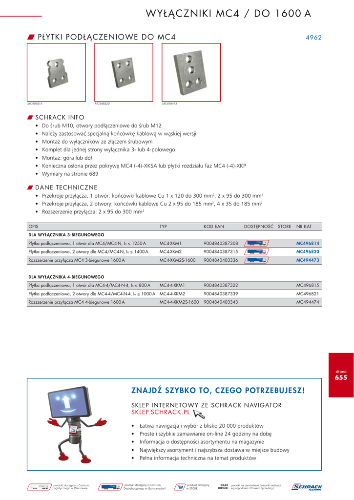 WYŁĄCZNIKI MC4 / DO 1600 A W PŁYTKI PODŁĄCZENIOWE DO MC4 MC496814 MC496820 4962 MC494473 W SCHRACK INFO • • • • • • • Do śrub M10, otwory podłączeniowe do śrub M12 Należy zastosować specjalną końcówkę kablową w wąskiej wersji Montaż do wyłączników ze złączem śrubowym Komplet dla jednej strony wyłącznika 3- lub 4-polowego Montaż: góra lub dół Konieczna osłona przez pokrywę MC4 (-4)-XKSA lub płytki rozdziału faz MC4 (-4)-XKP Wymiary na stronie 689 W DANE TECHNICZNE • Przekroje przyłącza, 1 otwór: końcówki kablowe Cu 1 x 120 do 300 mm2, 2 x 95 do 300 mm2 • Przekroje przyłącza, 2 otwory: końcówki kablowe Cu 2 x 95 do 185 mm2, 4 x 35 do 185 mm2 • Rozszerzenie przyłącza: 2 x 95 do 300 mm2 OPIS TYP KOD EAN DOSTĘPNOŚĆ STORE NR KAT. Płytka podłączeniowa, 1 otwór dla MC4/MC4-N, In ≤ 1250 A MC4-XKM1 9004840387308 MC496814 Płytka podłączeniowa, 2 otwory dla MC4/MC4-N, In ≤ 1400 A MC4-XKM2 9004840387315 MC496820 Rozszerzenie przyłącza MC4 3-biegunowe 1600 A MC4-XKM2S-1600 9004840403336 MC494473 Płytka podłączeniowa, 1 otwór dla MC4-4/MC4-N-4, In ≤ 800 A MC4-4-XKM1 9004840387322 MC496815 Płytka podłączeniowa, 2 otwory dla MC4-4/MC4-N-4, In ≤ 1000 A MC4-4-XKM2 9004840387339 MC496821 Rozszerzenie przyłącza MC4 4-biegunowe 1600 A MC4-4-XKM2S-1600 9004840403343 MC494474 DLA WYŁĄCZNIKA 3-BIEGUNOWEGO DLA WYŁĄCZNIKA 4-BIEGUNOWEGO strona 655 ZNAJDŹ SZYBKO TO, CZEGO POTRZEBUJESZ! SKLEP INTERNETOWY ZE SCHRACK NAVIGATOR SKLEP.SCHRACK.PL • • • • • produkt dostępny z Centrum Logistycznego w Warszawie Łatwa nawigacja i wybór z blisko 20 000 produktów Proste i szybkie zamawianie on-line 24 godziny na dobę Informacja o dostępności asortymentu na magazynie Największy asortyment i najszybsza dostawa w miejsce budowy Pełna informacja techniczna na temat produktów produkt dostępny z Centrum Dystrybucyjnego w Guntramsdorf produkt dostępny w STORE BRAK produkt na zamówienie (warunki realizacji IKONKI wg uzgodnień z Działem Sprzedaży)