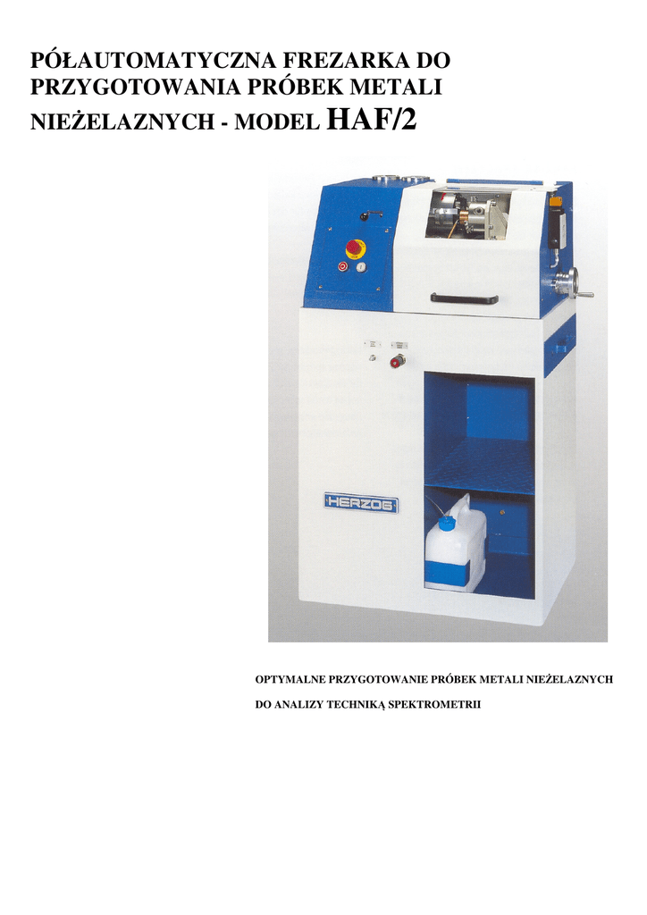 PÓŁAUTOMATYCZNA FREZARKA DO PRZYGOTOWANIA PRÓBEK METALI NIEŻELAZNYCH - MODEL HAF/2 OPTYMALNE PRZYGOTOWANIE PRÓBEK METALI NIEŻELAZNYCH DO ANALIZY TECHNIKĄ SPEKTROMETRII Optymalne dopasowanie do materiału próbki Przygotowanie próbek do precyzyjnej analizy Frezarka HAF/2 przygotowuje próbki metali nieżelaznych najróżniejszych form do analizy techniką spektrometrii. Po manualnym zamocowaniu próbki w uchwycie mocującym i zamknięciu pokrywy proces frezowania uruchomiony zostaje poprzez naciśnięcie przycisku start. Dzięki uprzednio ustawionym parametrom procesu frezowania takim jak głębokość frezowania, prędkość posuwu i prędkość obrotowa wrzeciona uzyskuje się wysoki stopień powtarzalności przygotowania powierzchni próbki. Precyzyjne frezowanie próbek o różnej formie Różne uchwyty mocujące, w które może być wyposażone urządzenie, umożliwiają dopasowanie uchwytu do kształtu próbki. Trzy różne prędkości obrotowe wrzeciona oraz regulowana w sposób stopniowy prędkość posuwu umożliwia uzyskanie optymalnej, z punktu widzenia planowanej analizy, powierzchni próbki. Bezpieczeństwo i czystość pracy Frezarka jest urządzeniem w pełni zamkniętym, pracującym przy ograniczonym (niskim) poziomie hałasu. Wykonanie urządzenia jest zgodne z obowiązującymi przepisami UVV i VDE DANE TECHNICZNE Wymiary, L x B x H ( długość x szerokość x wysokość) maszyna : 720 x 700 x 1190 mm Waga : Maszyna : 350 kg Zasilanie i zużycie energii elektrycznej : Napięcie : 400 V, 50 Hz, 3 fazy Pobór mocy: 2 kVA Liczba obrotów wrzeciona : 2.755 U/min, 3.330 U/min, 4.785 U/min. Ciśnienie i zużycie powietrza: Cisnienie: min. 5 bar, max. 10 bar Zużycie: ok. 100 dm3/N na Próbę Szafka sterowania elektrycznego (zintegrowana z obudową) : Sterowanie elektryczne. Napięcie sterujące: 24 V DC Sposób zabezpieczenia : IP 44 Klasa izolacji: B Zbiornik środka chłodzącego umieszczono, ze względu na oszczędność miejsca, w obudowie maszyny. Pojemnik na wióry, w celu opróżnienia, Parametry obróbki: wyjmowany jest manualnie w Czas obróbki : ok. 45 sek. sposób łatwy i wygodny. Parametry próbek : Materiał : metale nieżelazne Przekrój próbki : max. 70 mm Produkty firmy HERZOG, w tym oczywiście frezarka HAF/2, Opcja : skonstruowane zostały w celu przygotowania próbek do badań Odciąg mgły rozpylanego środka ____________________________ techniką analizy Zastrzegamy sobie możliwość spektrometrycznej. wprowadzenia zmian konstrukcyjnych Wysoki poziom techniczny urządzeń HERZOGA oraz niewielkie gabaryty czynią je bardzo przydatnymi do pracy w warunkach laboratoryjnych