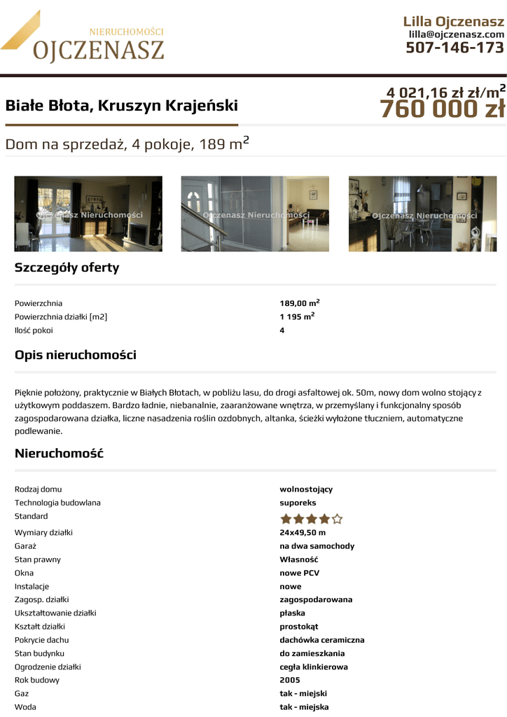 Lilla Ojczenasz [email protected] 507-146-173 4 021,16 zł zł/m2 760 000 zł Białe Błota, Kruszyn Krajeński Dom na sprzedaż, 4 pokoje, 189 m2 Szczegóły oferty Powierzchnia 189,00 m2 Powierzchnia działki [m2] 1 195 m2 Ilość pokoi 4 Opis nieruchomości Pięknie położony, praktycznie w Białych Błotach, w pobliżu lasu, do drogi asfaltowej ok. 50m, nowy dom wolno stojący z użytkowym poddaszem. Bardzo ładnie, niebanalnie, zaaranżowane wnętrza, w przemyślany i funkcjonalny sposób zagospodarowana działka, liczne nasadzenia roślin ozdobnych, altanka, ścieżki wyłożone tłuczniem, automatyczne podlewanie. Nieruchomość Rodzaj domu wolnostojący Technologia budowlana suporeks Standard Wymiary działki 24x49,50 m Garaż na dwa samochody Stan prawny Własność Okna nowe PCV Instalacje nowe Zagosp. działki zagospodarowana Ukształtowanie działki płaska Kształt działki prostokąt Pokrycie dachu dachówka ceramiczna Stan budynku do zamieszkania Ogrodzenie działki cegła klinkierowa Rok budowy 2005 Gaz tak - miejski Woda tak - miejska Dojazd asfalt Otoczenie działki zabudowane Ogrzewanie piec dwufunkcyjny Tarasy taras duzy Prąd tak Kanalizacja oczyszczalnia ekologiczna