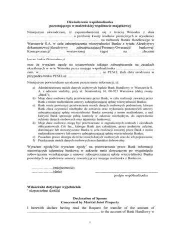 Oświadczenie współmałżonka pozostającego w małżeńskiej wspólnocie majątkowej Niniejszym oświadczam, iż zapoznałam(em) się z treścią Wniosku z dnia .................................................. o przelanie kwoty środków pieniężnych w wysokości ................................................................................ na rachunek Banku Handlowego w Warszawie S.A. w celu zabezpieczenia wierzytelności Banku z tytułu Akredytywy dokumentowej/Akredytywy zabezpieczającej/Promesy/Gwarancji bankowej/ 1 Kontrgwarancji wystawionej (ego) na zlecenie ........................................………………………………............................................. (nazwa i adres Zleceniodawcy) oraz że wyrażam zgodę na ustanowienie takiego zabezpieczenia na zasadach określonych w w/w Wniosku przez mojego współmałżonka ........................................., zam. w .................................................................., nr PESEL (lub data urodzenia w przypadku braku PESELa): ........................................ Niniejszym potwierdzam uzyskanie przeze mnie informacji, iż: a) Administratorem moich danych osobowych będzie Bank Handlowy w Warszawie S. A. z adresem siedziby, przy ul. Senatorskiej 16, 00-923 Warszawa (dalej zwany „Bank”); b) Moje dane osobowe będą przetwarzane przez Bank, w celu realizacji zawartej przez Bank z moim małżonkiem umowy zabezpieczającej spłatę wierzytelności Banku; c) Bank może powierzyć przetwarzanie moich danych osobowych podmiotom, którym Bank zleca czynności niezbędne do zawarcia oraz wykonania postanowień umowy zabezpieczającej spłatę wierzytelności Banku zawartej z moim małżonkiem, a nad którymi Bank sprawuje pełną kontrolę w zakresie niezbędnym, do zapewnienia ochrony danych osobowych oraz tajemnicy bankowej; d) Moje dane osobowe, mogą być przetwarzane w zagranicznych centrach i ośrodkach obliczeniowych Citi Inc., którego Bank jest członkiem, przez podmioty zależne, dominujące lub stowarzyszone Banku w celu realizacji zawartej przez Bank z moim małżonkiem umowy lub umowy zabezpieczającej spłatę wierzytelności Banku; e) Posiadam prawo dostępu do treści moich danych osobowych oraz do ich poprawiania; f) Przekazanie moich danych osobowych ma charakter dobrowolny. Wyrażam zgodę/Nie wyrażam zgody1 na przetwarzanie przez Bank informacji stanowiących tajemnicę bankową w zakresie mnie dotyczącym po wygaśnięciu zobowiązania wynikającego z umowy zabezpieczającej spłatę wierzytelności Banku powstałych na podstawie umowy zawartej przez mojego małżonka z Bankiem. ………………(miejscowość) ………………(dnia) ..................................................................... podpis współmałżonka ____________________________________ Wskazówki dotyczące wypełnienia 1 niepotrzebne skreślić Declaration of Spouse Concerned by Marital Joint Property I herewith declare having read the Request for transfer of the amount of ................................................................................ to the account of Bank Handlowy w 1 Warszawie S.A. in order to secure the receivables of the Bank under a Documentary Letter of Credit / stand-by Letter of Credit / Promise / Bank Guarantee / counterguarantee1 issued by order of ………..…………………………………………...……………..………………… (Applicant’s name and address) and approving the establishment of such collateral on terms set forth in the abovementioned Request by my spouse, ....................……...................., resident in .................................................., PESEL: ........................................ I hereby represent to have been informed that: a) Bank Handlowy w Warszawie S.A.with its registered office at ul. Senatorska 16, 00923 Warsaw (henceforth the “Bank”) will act as the administrator of my personal data; b) My personal data will be processed by the Bank for the purpose of performance of the agreement securing the repayment of the Bank’s receivables, entered into by and between the Bank and my spouse; c) The Bank shall have the right to delegate the task of processing my personal data to entities who the Bank commissions to perform activities required for the conclusion and performance of the provisions of the agreement securing the repayment of the Bank’s receivables, entered into by and between the Bank and my spouse, over which the Bank exercises full control to the extent required to ensure personal data protection and bank secrecy; d) My personal data may be processed in international computing centers of Citi Inc., whose member is the Bank, by the Bank’s subsidiaries, parents and associates for the purpose of performance of the agreement securing the repayment of the Bank’s receivables, entered into by and between the Bank and my spouse; e) I have the right to access and correct my personal data; f) My personal data is provided voluntarily. I hereby grant my consent / I do not grant my consent1 to the Bank’s processing of information regarded as bank secrecy to the extent such information concerns me, following the extinction of the obligation resulting from the agreement securing the repayment of the Bank’s receivables arising under the agreement entered into by and between my spouse and the bank. ................................... (place) …………………….. (date) ..................................................................... For the spouse _____________________ Filling guidelines 1 choose applicable 2