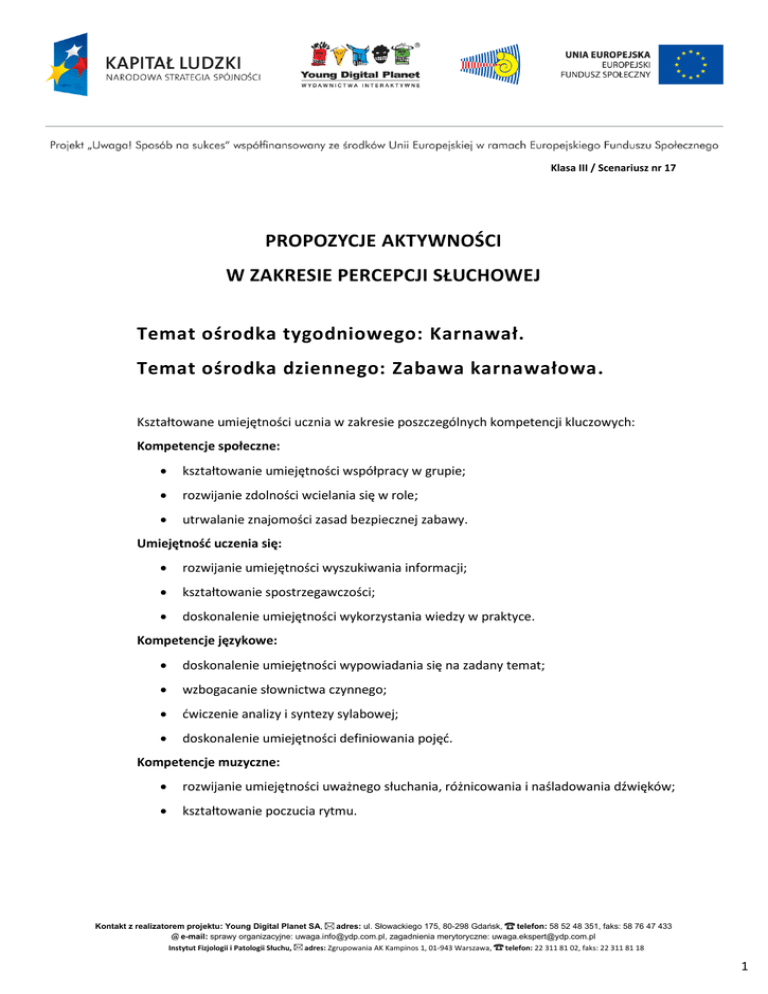 Klasa III / Scenariusz nr 17 PROPOZYCJE AKTYWNOŚCI W ZAKRESIE PERCEPCJI SŁUCHOWEJ Temat ośrodka tygodniowego: Karnawał. Temat ośrodka dziennego: Zabawa karnawałowa. Kształtowane umiejętności ucznia w zakresie poszczególnych kompetencji kluczowych: Kompetencje społeczne: kształtowanie umiejętności współpracy w grupie; rozwijanie zdolności wcielania się w role; utrwalanie znajomości zasad bezpiecznej zabawy. Umiejętność uczenia się: rozwijanie umiejętności wyszukiwania informacji; kształtowanie spostrzegawczości; doskonalenie umiejętności wykorzystania wiedzy w praktyce. Kompetencje językowe: doskonalenie umiejętności wypowiadania się na zadany temat; wzbogacanie słownictwa czynnego; ćwiczenie analizy i syntezy sylabowej; doskonalenie umiejętności definiowania pojęć. Kompetencje muzyczne: rozwijanie umiejętności uważnego słuchania, różnicowania i naśladowania dźwięków; kształtowanie poczucia rytmu. Kontakt z realizatorem projektu: Young Digital Planet SA, adres: ul. Słowackiego 175, 80-298 Gdańsk, telefon: 58 52 48 351, faks: 58 76 47 433 e-mail: sprawy organizacyjne: [email protected], zagadnienia merytoryczne: [email protected] Instytut Fizjologii i Patologii Słuchu, adres: Zgrupowania AK Kampinos 1, 01-943 Warszawa, telefon: 22 311 81 02, faks: 22 311 81 18 1 Klasa III / Scenariusz nr 17 PRZEBIEG ZAJĘĆ 1. Zajęcia wstępne a. Zajęcia porządkowe Powitanie Uczniowie stoją w kole, trzymając się za ręce. Wybrana osoba wchodzi do środka koła i zamyka oczy. Nauczyciel odtwarza nagranie z muzyką. Dzieci w kole poruszają się w jej rytm w prawą stronę. Kiedy muzyka cichnie, osoba w środku koła wskazuje ręką jednego z uczniów. Wita się z nim podaniem ręki i zaprasza do środka. Ustalenie daty Uczniowie wymieniają nazwy kolejnych dni tygodnia, rozpoczynając od aktualnego. Pierwsza osoba mówi szeptem, każda następna – coraz głośniej. Następnie uczniowie wypowiadają nazwy kolejnych miesięcy. Pierwsza osoba mówi głośno, każda następna – coraz ciszej. Na koniec wskazany uczeń zaznacza aktualną datę w kalendarzu. Przygotowanie do zajęć Uczniowie wyjmują z tornistrów i układają na ławkach przybory szkolne i podręczniki potrzebne podczas zajęć. Dziecko, które wykona zadanie najszybciej i najciszej, otrzyma pochwałę. Ustalenie listy obecności Nauczyciel sprawdza listę obecności. Wypowiada sylabami imiona i nazwiska dzieci. Wywołane dziecko podnosi rękę w górę. Na koniec wybrana osoba wypowiada głoskami imiona dzieci nieobecnych w klasie. Kontakt z realizatorem projektu: Young Digital Planet SA, adres: ul. Słowackiego 175, 80-298 Gdańsk, telefon: 58 52 48 351, faks: 58 76 47 433 e-mail: sprawy organizacyjne: [email protected], zagadnienia merytoryczne: [email protected] Instytut Fizjologii i Patologii Słuchu, adres: Zgrupowania AK Kampinos 1, 01-943 Warszawa, telefon: 22 311 81 02, faks: 22 311 81 18 2 Klasa III / Scenariusz nr 17 b. Obserwacja przyrody Wybrana osoba opisuje pogodę za oknem. Pozostali uczniowie na podstawie opisu przygotowują odpowiednie znaczki ilustrujące aktualną pogodę, na przykład: słońce, wiatr, śnieg, chmurę z deszczem. Przypinają je w kalendarzu pogody. c. Przedstawienie celu i tematu zajęć Uczniowie otrzymują karty pracy nr 1. Dzielą wyrazy na sylaby. Zapisują w tabeli pierwsze sylaby. Odczytują rozwiązanie: „Zabawa karnawałowa”. Nauczyciel przedstawia cel i temat zajęć. 2. Praca poznawcza a. Obserwacja Nauczyciel rozmawia z uczniami na temat szkolnych zabaw karnawałowych, odwołuje się do ich wspomnień. Uczniowie mogą udzielać odpowiedzi na pytania, np.: Jak w szkole obchodzimy karnawał? Jak zwykle przygotowujecie się do zabawy karnawałowej? W jakich przebraniach występowaliście na balu karnawałowym? Jakie korzyści płyną z wesołej i radosnej zabawy? Opiszcie wasz wymarzony strój. Uczniowie otrzymują karty pracy nr 2. Wybrana osoba odczytuje tekst na temat zwyczajów karnawałowych na świecie. Nauczyciel prezentuje zdjęcia przedstawiające zabawę karnawałową w Rio de Janeiro i w Wenecji. b. Kojarzenie Po uważnym wysłuchaniu tekstu uczniowie odpowiadają na pytania: Co oznacza słowo karnawał? Jaki nastrój panuje podczas karnawału? Gdzie odbywają się najbardziej znane zabawy karnawałowe na świecie? Opowiedz o nich. 3. Ekspresja Uczniowie otrzymują karty pracy nr 3 i 4. Odszukują i zaznaczają 10 szczegółów, którymi różnią się obrazki przedstawiające bal karnawałowy. Uzupełniają tekst nazwami zwyczajów i zabaw karnawałowych. Kontakt z realizatorem projektu: Young Digital Planet SA, adres: ul. Słowackiego 175, 80-298 Gdańsk, telefon: 58 52 48 351, faks: 58 76 47 433 e-mail: sprawy organizacyjne: [email protected], zagadnienia merytoryczne: [email protected] Instytut Fizjologii i Patologii Słuchu, adres: Zgrupowania AK Kampinos 1, 01-943 Warszawa, telefon: 22 311 81 02, faks: 22 311 81 18 3 Klasa III / Scenariusz nr 17 Nauczyciel proponuje zabawę „Kim jest ta maszkara?”. Wskazana osoba gestem i ruchem przedstawia wybraną postać. Pozostali uczniowie zgadują. Dla ułatwienia dzieci wspólnie z nauczycielem ustalają kategorie, na przykład: zwierzęta, postaci z bajek, instrumenty. Zabawa „Robimy faworki”. Nauczyciel dzieli uczniów na dwie grupy. Każda grupa otrzymuje po 20 pasków białego papieru. Dzieci rozcinają paski zgodnie z instrukcją: „złóż pasek na pół, zrób nacięcie po środku, rozłóż pasek”. W ten sposób powstaje nacięcie jak na faworku. Nauczyciel pokazuje, w jaki sposób trzeba przełożyć końcówkę paska przez nacięcie, tak aby powstał papierowy faworek. Zadaniem obu drużyn jest zrobienie w ciągu minuty jak największej liczby faworków. Nauczyciel proponuje zabawę ruchową „Wyścig kuligów”. Ustala trasę, ustawia na niej przeszkody, na przykład papierowe kule. Uczniowie dobierają się trójkami. Ustawiają się jeden za drugim, ch