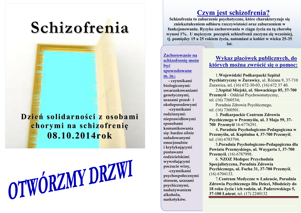Czym jest schizofrenia? Schizofrenia Schizofrenia to zaburzenie psychotyczne, które charakteryzuje się zniekształceniem odbioru rzeczywistości oraz zaburzeniem w funkcjonowaniu. Ryzyko zachorowania w ciągu życia na tą chorobę wynosi 1%. U mężczyzn początek schizofrenii zaczyna się wcześniej, tj. pomiędzy 15 a 25 rokiem życia, natomiast u kobiet w wieku 25-35 lat. Zachorowanie na schizofrenię może być spowodowane m. in.: Dzień solidarności z osobami chorymi na schizofrenię 08.10.2014rok - czynnikami biologicznymi: uwarunkowaniami genetycznymi, urazami przed- i okołoporodowymi -czynnikami rodzinnymi: nieprawidłowymi sposobami komunikowania się: bardzo silnie naładowanymi emocjonalnie i krytykującymi postawami rodzicielskimi wywołującymi poczucie winy, -czynnikami psychospołecznymi stresem, urazami psychicznymi, nadużywaniem alkoholu, narkotyków. Wykaz placówek publicznych, do których można zwrócić się o pomoc: 1.Wojewódzki Podkarpacki Szpital Psychiatryczny w Żurawicy, ul. Różana 9, 37-710 Żurawica, tel. (16) 672-30-03, (16) 672 37 40. 2.Szpital Miejski, ul. Słowackiego 85, 37-700 Przemyśl – Oddział Psychosomatyczny, tel. (16) 7360534; Poradnia Zdrowia Psychicznego, tel. (16) 7360501. 3. Podkarpackie Centrum Zdrowia Psychicznego w Przemyślu, ul. 3 Maja 59, 37700 Przemyśl 16-6776291. 4. Poradnia Psychologiczno-Pedagogiczna w Przemyślu, ul. Kapitulna 4, 37-700 Przemyśl, tel. (16) 6783794. 5.Poradnia Psychologiczno-Pedagogiczna dla Powiatu Przemyskiego, ul. Waygarta 1, 37-700 Przemyśl, (16) 6787998. 6. NZOZ Medspec Przychodnia Specjalistyczna, Poradnia Zdrowia Psychicznego, ul. Focha 31, 37-700 Przemyśl, (16) 6704133. 7.Centrum Medyczne w Łańcucie, Poradnia Zdrowia Psychicznego Dla Dzieci, Młodzieży do 18 roku życia i ich rodzin, ul. Paderewskiego 5, 37-100 Łańcut, tel. (17) 2240132