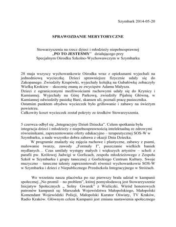 Szymbark 2014-05-20 SPRAWOZDANIE MERYTORYCZNE Stowarzyszenia na rzecz dzieci i młodzieży niepełnosprawnej „PO TO JESTEŚMY” działającego przy Specjalnym Ośrodku Szkolno-Wychowawczym w Szymbarku 28 maja wszyscy wychowankowie Ośrodka wraz z opiekunami wyjechali na jednodniową wycieczkę. Dzieci sprawniejsze fizycznie udały się do Zakopanego. Zwiedziły Krupówki, wyjechały kolejką na Gubałówkę zobaczyły Wielką Krokiew – skocznię znaną ze zwycięstw Adama Małysza. Dzieci z ograniczonymi możliwościami ruchowymi udały się do Krynicy i Kamiannej. Wyjechały na Górę Parkową, zwiedziły Pijalnię Główną, w Kamiannej odwiedziły pasiekę Barć, skansen uli, poznali pracę pasiecznika. Ostatnim punktem obydwu wycieczek było grillowanie i zabawy na świeżym powietrzu. Całkowity koszt wycieczek został pokryty ze środków Stowarzyszenia. 5 czerwca odbył się „Integracyjny Dzień Dziecka”. Celem spotkania była integracja dzieci i młodzieży z niepełnosprawnością intelektualną ze zdrowymi rówieśnikami, zaprezentowanie oferty edukacyjno – terapeutycznej SOS-W w Szymbarku, a nade wszystko dobra zabawa z okazji Dnia Dziecka. W programie znalazły się zajęcia ruchowe i plastyczne, zabawy z psami, malowanie twarzy, zawody „Formuły I”, puszczanie wielkich baniek mydlanych… Czas umilały występy małych i większych artystów – scholi z parafii pw. Królowej Jadwigi w Gorlicach, zespołu młodzieżowego z Zespołu Szkół w Szymbarku i grupy tanecznej z Gorlickiego Centrum Kultury. Swoje muzyczno – taneczne talenty zaprezentowali również wychowankowie SOS-W w Szymbarku i dzieci z Niepublicznego Przedszkola Integracyjnego w Stróżach. We wrześniu nasza placówka po raz pierwszy brała udział w kampanii społecznej „No promil – no problem”, której pomysłodawcą jest Stowarzyszenie Inicjatyw Społecznych ,, Solny Gwarek” z Wieliczki. Wśród honorowych patronów kampanii są: Marszałek Województwa Małopolskiego, Małopolski Komendant Wojewódzki Policji, Małopolski Kurator Oświaty, TV Kraków, Radio Kraków. Głównym celem Kampanii jest zmiana nastawienia społecznego do pijanych kierowców i tym samym ograniczenie osób prowadzących samochód pod wpływem środków psychoaktywnych. Kampania w naszej placówce trwa nadal. Mamy nadzieję, że dzięki niej, każde dziecko będzie miało odwagę odmówić jazdy z pijanym kierowcą, a nawet go powstrzymać, a dorośli przedłożą zdrowie i życie swoje i innych nad chwilową, promilową przyjemność. Pamiętajmy, że ofiarą pijanego kierowcy może być każdy z nas lub bliska nam osoba! W okresie jesiennym Stowarzyszenie organizuje wycieczki piesze po najbliższej okolicy. W ten sposób młodzież poznaje piękno krajobrazu Beskidu Niskiego. Podczas wędrówek wychowankowie hartują organizm, podnoszą wytrzymałość fizyczną i wzmacniają kondycję . 24 października sześciu uczniów klasy I ZSZ, wraz ze swoim wychowawcą "wyspindrało" się na szczyt Jaworze - szlakiem niebieskim, stromym podejściem, prowadzącym od strony Boguszy. Jest to szczyt położony w północno-zachodniej części Beskidu Niskiego w grupie Gór Grybowskich. Jaworze leży na południowy – wschód od Grybowa, na zachód od drogi Krynica – Grybów oraz doliny Białej. Południowe stoki góry opadają ku wsi Bogusza. Na szczycie góry została wybudowana wieża widokowa o wysokości 29 m, dzięki czemu stała się ona atrakcyjnym celem podróży dla turystów. Ze szczytu wieży można zobaczyć panoramę Grybowa 15 października wychowankowie Ośrodka wraz z nauczycielami wybrali się do Pawilonu Informacji Turystycznej i Historii Miasta Gorlice – gdzie obejrzeli bardzo ciekawą prezentację pt. „Piękno Beskidu Gorlickiego”. Pokazane w niej zostały atrakcje turystyczne najbliższej okolicy. W pawilonie oglądali ponadto wystawę prac plastycznych przedstawiają zabytki Gorlic. Największą atrakcją było jednak wejście na wieżę ratuszową gdzie po pokonaniu 66 drewnianych krętych schodów, z wysokości 22 metrów uczniowie podziwiali panoramę miasta i okolic. W dniach od 4 do 29 listopada 2013 roku w Pawilonie Informacji Turystycznej i Historii Miasta Gorlice zaprezentowana została wystawa prac plastyczno – technicznych dzieci i młodzieży z naszego Ośrodka. Podopieczni Stowarzyszenia wraz z wychowawcami przygotowali prace o tematyce jesienno -zimowej z wykorzystaniem różnorodnych technik. W miesiącu grudniu podobna wystawa miała miejsce w Małopolskim Centrum Doskonalenia Nauczycieli w Nowym Sączu. W miesiącach listopad – grudzień podopieczni Stowarzyszenia wyjeżdżali na krytą pływalnię „Fala” do Gorlic oraz do Parku Wodnego w Wysowej - Zdroju. Pływanie i kontakt z wodą przynoszą szereg korzyści zdrowotnych: dotleniają i uodparniają organizm, zwiększają jego wytrzymałość, usprawniają krążenie, pracę serca i płuc, zapobiegają i korygują wady postawy. Działają odprężająco i relaksują, co jest szczególnie ważne w rewalidacji osób niepełnosprawnych bez względu na rodzaj niepełnosprawności. W dniach 12 – 16.12.2013 r. Stowarzyszenie na rzecz Dzieci i Młodzieży Niepełnosprawnej „Po To Jesteśmy” zorganizowało świąteczną zbiórkę żywności. Celem akcji było zebranie produktów żywnościowych, a następnie rozdysponowanie ich wśród rodzin wychowanków Specjalnego Ośrodka Szkolno – Wychowawczego w Szymbarku znajdujących się w szczególnie trudnej sytuacji materialnej i życiowej. Zbiórka żywności została przeprowadzona w 2 placówkach handlowych tj. Sklepie Spożywczo – Przemysłowym „Arka” w Ropicy Polskiej oraz „Delikatesach Centrum” w Ropie. Najwięcej zebrano takich produktów jak: cukier, mąka, makaron, olej, ryż, kasza, konserwy, słodycze. Zgodnie z ideą/zamysłem/planem akcji zebrane artykuły zostały przekazane, w formie paczek świątecznych do 21 rodzin potrzebujących takiej pomo