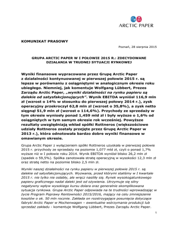 KOMUNIKAT PRASOWY Poznań, 28 sierpnia 2015 GRUPA ARCTIC PAPER W I POŁOWIE 2015 R.: ZDECYDOWANE DZIAŁANIA W TRUDNEJ SYTUACJI RYNKOWEJ Wyniki finansowe wypracowane przez Grupę Arctic Paper z działalności kontynuowanej w pierwszej połowie 2015 r. są lepsze w porównaniu z osiągniętymi w analogicznym okresie roku ubiegłego. Niemniej, jak komentuje Wolfgang Lübbert, Prezes Zarządu Arctic Paper, „wyniki działalności na rynku papieru są dalekie od satysfakcjonujących”. Wynik EBITDA wyniósł 116,9 mln zł (wzrost o 14% w stosunku do pierwszej połowy 2014 r.), zysk operacyjny przekroczył 62,8 mln zł (wzrost o 35,8%), a zysk netto sięgnął 51,9 mln zł (wzrost o 114,6%). Przychody ze sprzedaży w tym okresie wyniosły ponad 1,459 mld zł i były wyższe o 1,6% od osiągniętych w tym samym okresie rok wcześniej. Powyższe rezultaty uwzględniają wkład spółki Rottneros (większościowe udziały Rottneros zostały przejęte przez Grupę Arctic Paper w 2013 r.), która odnotowała bardzo dobre wyniki finansowe w omawianym okresie. Grupa Arctic Paper z wyłączeniem spółki Rottneros uzyskała w pierwszej połowie 2015 r. przychody ze sprzedaży na poziomie 1,077 mld zł, czyli o ponad 1,7% wyższe niż w I połowie roku 2014. Wynik EBITDA wyniósł blisko 26,2 mln zł (spadek o 59,5%). Spółka zanotowała stratę operacyjną w wysokości 12,3 mln zł oraz stratę netto na poziomie blisko 2,5 mln zł. Wyniki naszej działalności na rynku papieru w pierwszej połowie 2015 r. są dalekie od satysfakcjonujących. Wyzwania, przed którymi staliśmy w I kwartale 2015 r. nie tylko nie osłabły, ale wręcz nasiliły się. Rynek wysokogatunkowego papieru graficznego nadal daleki jest od ożywienia. Utrzymuje się silny negatywny wpływ wysokiego kursu dolara oraz generalnie skomplikowana sytuacja rynkowa. Grupa Arctic Paper odpowiada na te trudności wprowadzając w życie Program Poprawy Rentowności 2015/2016, mający na celu zmniejszenie kosztów o ok. 50 mln rocznie. Zakłada on rozstrzygające posunięcia dotyczące fabryki Arctic Paper w Mochenwagen – ewentualne wstrzymanie produkcji lub sprzedaż zakładu - komentuje Wolfgang Lübbert, Prezes Zarządu Arctic Paper. 1 Na wyniki Grupy w segmencie papieru negatywnie rzutował wzrost kosztów zakupu celulozy wyrażonych w złotych o 18,5% w ujęciu rok do roku (o 2,1% w porównaniu do I kw. 2015 r.). Było to głównie związane z niekorzystną relacją kursu euro do dolara, która odnotowała spadek o 19,5% w porównaniu do II kw. 2014 r. (oraz 1,8% w stosunku do I kw. 2015 r.) Ponadto, z powodu przeprowadzanych inwestycyji, przez 10 dni wstrzymana była produkcja w papierni Arctic Paper w Kostrzynie. Spowodowało to spadek wolumenu produkcji o 4.300 ton, co miało wpływ na wyniki w omawianym okresie. Na koniec pierwszej połowy 2015 r. utrzymana została rezerwa w wysokości 14,2 mln zł (z rezerwy w wysokości 15,3 mln utworzonej w I kwartale), w związku z przewidywanym brakiem spłaty należności handlowych na rzecz fabryk Arctic Paper ze strony spółek PaperlinX UK, w których wszczęto procedury naprawcze. Utrzymanie w tym czasie udziału w rynku brytyjskim, jak również krótki czas, w którym sytuacja Arctic Paper na rynku brytyjskim się polepszyła są nieznacznym, choć istotnym potwierdzeniem atrakcyjności produktów Arctic Paper oraz skuteczności działu sprzedaży. Na koniec pierwszej połowy 2015 r. średnie ceny papierów wysokogatunkowych w Europie w porównaniu do analogicznego okresu ub.r. były wyższe o 2,6% dla niepowlekanych papierów bezdrzewnych i niższe o 1,7% w przypadku papierów powlekanych bezdrzewnych. Z kolei w porównaniu z I kwartałem 2015 r. ceny te - odpowiednio – wzrosły o 2,6% dla niepowlekanego papieru bezdrzewnego oraz spadły o 2,8% dla powlekanego papieru bezdrzewnego (dane na podstawie RISI). Na dobre wyniki Rottneros, poza mocnym kursem dolara, wpływ miały również zdecydowane działania wewnętrzne. Plan działania Focus 15 skutkuje zarówno wzrostem produktywności, jak też wzrostem zysków i aktualnie zostaje przekształcony w nowy program – Action 500. Na trudnym rynku reagujemy cierpliwością, wytrwałością i szybkością działania, by jak najlepiej zaspokoić potrzeby naszych klientów. Większościowy udział w Rottneros jest naszym atutem, który pozwala konsekwentnie działać na rzecz wzmocnienia elastyczności, mobilności i stabilności Arctic Paper, czego istotnym elementem są podjęte kroki związane z papiernią Arctic Paper w Mochenwagen – podsumowuje Wolfgang Lübbert. 2 Wybrane wyniki finansowe Grupy Arctic Paper (w tym wyniki Rottneros) w I połowie 2015 r. W TYS. ZŁ I połowa 2015 I połowa 2014 zmiana (%) Przychody ze sprzedaży 1 459 352 1 436 062 1,6 Zysk EBITDA 116 898 102 562 14,0 Zysk EBIT 62 825 46 257 35,8 Zysk netto* 51 890 24 178 114,6 Zysk netto 25 944 22 383 15,9 Wybrane wyniki finansowe Grupy Arctic Paper (z wyłączeniem wyników Rottneros) w I połowie 2015 r. W TYS. ZŁ I połowa 2015 I połowa 2014 zmiana (%) Przychody ze sprzedaży 1 076 702 1 058 889 1,7 Zysk EBITDA 26 189 64 668 -59,5 Zysk EBIT -12 254 23 511 - Zysk netto* -2 489 7 164 - Zysk netto -28 435 5 369 - *wyniki z działalności kontynuowanej - Zarząd w raporcie bieżącym nr 10/2015 z 28 lipca poinformował, iż - w wyniku aktywnych poszukiwań nabywcy dla fabryki papieru Arctic Paper w Mochenwagen - jej wyniki zostały wyłączone ze skonsolidowanego rachunku zysków i strat oraz, zgodnie z wymogami Międzynarodowych Standardów Rachunkowości, wykazane odrębnie, jako działalność niekontynuowana. 3 Dalszych informacji mediom udzielają: Magda Kołodziejczyk M+G tel. +48 22 416 01 02, +48 501 168 807 e-mail: [email protected] ARCTIC PAPER S.A. zalicza się do czołowych europejskich producentów wysokogatunkowego papieru graficznego. Spółka produkuje powlekany i niepowlekany papier bezdrzewny oraz niepowlekany papier drzewny dla wymagających 