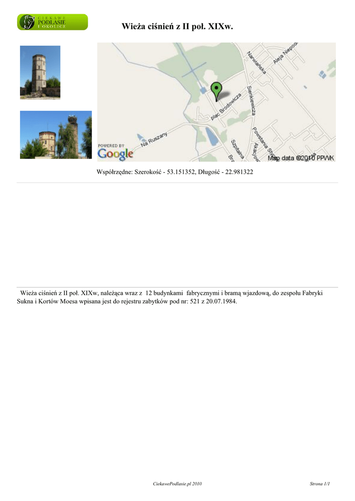 Wieża ciśnień z II poł. XIXw. Współrzędne: Szerokość - 53.151352, Długość - 22.981322 Wieża ciśnień z II poł. XIXw, należąca wraz z 12 budynkami fabrycznymi i bramą wjazdową, do zespołu Fabryki Sukna i Kortów Moesa wpisana jest do rejestru zabytków pod nr: 521 z 20.07.1984. CiekawePodlasie.pl 2010 Strona 1/1