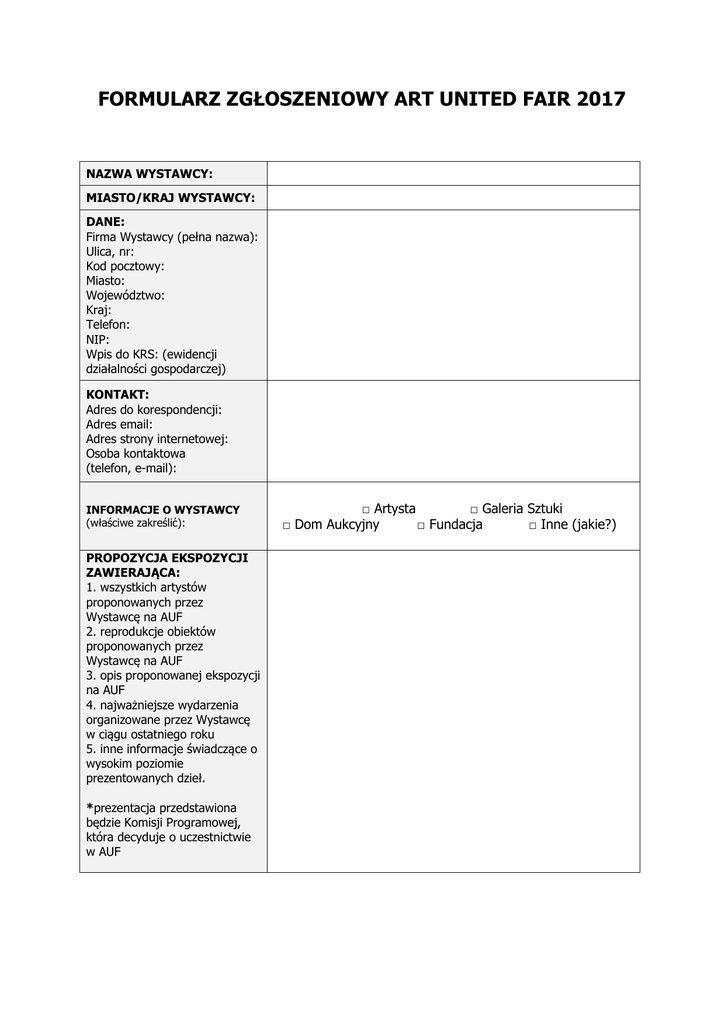 FORMULARZ ZGŁOSZENIOWY ART UNITED FAIR 2017 NAZWA WYSTAWCY: MIASTO/KRAJ WYSTAWCY: DANE: Firma Wystawcy (pełna nazwa): Ulica, nr: Kod pocztowy: Miasto: Województwo: Kraj: Telefon: NIP: Wpis do KRS: (ewidencji działalności gospodarczej) KONTAKT: Adres do korespondencji: Adres email: Adres strony internetowej: Osoba kontaktowa (telefon, e-mail): INFORMACJE O WYSTAWCY (właściwe zakreślić): PROPOZYCJA EKSPOZYCJI ZAWIERAJĄCA: 1. wszystkich artystów proponowanych przez Wystawcę na AUF 2. reprodukcje obiektów proponowanych przez Wystawcę na AUF 3. opis proponowanej ekspozycji na AUF 4. najważniejsze wydarzenia organizowane przez Wystawcę w ciągu ostatniego roku 5. inne informacje świadczące o wysokim poziomie prezentowanych dzieł. *prezentacja przedstawiona będzie Komisji Programowej, która decyduje o uczestnictwie w AUF □ Artysta □ Galeria Sztuki □ Dom Aukcyjny □ Fundacja □ Inne (jakie?) Ze względu na prekursorski charakter naszego Wydarzenia (I edycja ART UNITED FAIR) mamy przyjemność zaoferować Państwu powierzchnię wystawienniczą wolną od opłat! Pieczęć firmy Wystawcy Podpis osoby uprawnionej do reprezentowania firmy ….......................................................... Miejsce i data ……………………………………………………………