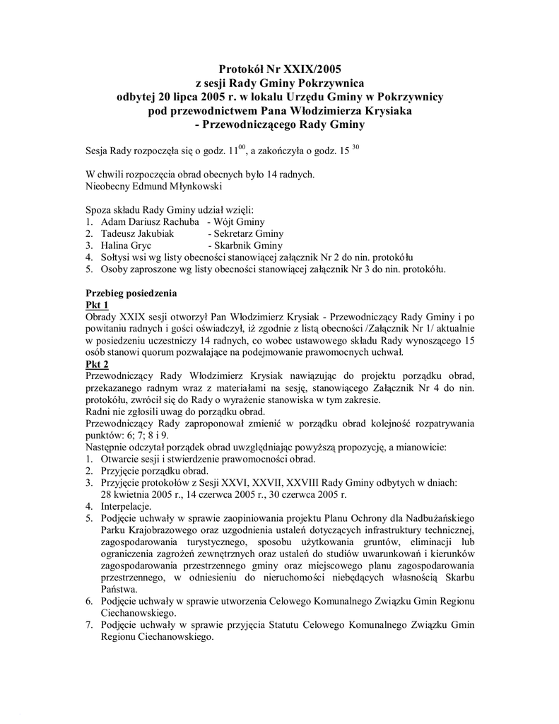 Protokół Nr XXIX/2005 z sesji Rady Gminy Pokrzywnica odbytej 20 lipca 2005 r. w lokalu Urzędu Gminy w Pokrzywnicy pod przewodnictwem Pana Włodzimierza Krysiaka - Przewodniczącego Rady Gminy Sesja Rady rozpoczęła się o godz. 1100, a zakończyła o godz. 15 30 W chwili rozpoczęcia obrad obecnych było 14 radnych. Nieobecny Edmund Młynkowski Spoza składu Rady Gminy udział wzięli: 1. Adam Dariusz Rachuba - Wójt Gminy 2. Tadeusz Jakubiak - Sekretarz Gminy 3. Halina Gryc - Skarbnik Gminy 4. Sołtysi wsi wg listy obecności stanowiącej załącznik Nr 2 do nin. protokółu 5. Osoby zaproszone wg listy obecności stanowiącej załącznik Nr 3 do nin. protokółu. Przebieg posiedzenia Pkt 1 Obrady XXIX sesji otworzył Pan Włodzimierz Krysiak - Przewodniczący Rady Gminy i po powitaniu radnych i gości oświadczył, iż zgodnie z listą obecności /Załącznik Nr 1/ aktualnie w posiedzeniu uczestniczy 14 radnych, co wobec ustawowego składu Rady wynoszącego 15 osób stanowi quorum pozwalające na podejmowanie prawomocnych uchwał. Pkt 2 Przewodniczący Rady Włodzimierz Krysiak nawiązując do projektu porządku obrad, przekazanego radnym wraz z materiałami na sesję, stanowiącego Załącznik Nr 4 do nin. protokółu, zwrócił się do Rady o wyrażenie stanowiska w tym zakresie. Radni nie zgłosili uwag do porządku obrad. Przewodniczący Rady zaproponował zmienić w porządku obrad kolejność rozpatrywania punktów: 6; 7; 8 i 9. Następnie odczytał porządek obrad uwzględniając powyższą propozycję, a mianowicie: 1. Otwarcie sesji i stwierdzenie prawomocności obrad. 2. Przyjęcie porządku obrad. 3. Przyjęcie protokołów z Sesji XXVI, XXVII, XXVIII Rady Gminy odbytych w dniach: 28 kwietnia 2005 r., 14 czerwca 2005 r., 30 czerwca 2005 r. 4. Interpelacje. 5. Podjęcie uchwały w sprawie zaopiniowania projektu Planu Ochrony dla Nadbużańskiego Parku Krajobrazowego oraz uzgodnienia ustaleń dotyczących infrastruktury technicznej, zagospodarowania turystycznego, sposobu użytkowania gruntów, eliminacji lub ograniczenia zagrożeń zewnętrznych oraz ustaleń do studiów uwarunkowań i kierunków zagospodarowania przestrzennego gminy oraz miejscowego planu zagospodarowania przestrzennego, w odniesieniu do nieruchomości niebędących własnością Skarbu Państwa. 6. Podjęcie uchwały w sprawie utworzenia Celowego Komunalnego Związku Gmin Regionu Ciechanowskiego. 7. Podjęcie uchwały w sprawie przyjęcia Statutu Celowego Komunalnego Związku Gmin Regionu Ciechanowskiego. 2 8. Podjęcie uchwały w sprawie Planu gospodarki odpadami dla Gminy Pokrzywnica na lata 2005-2012. 9. Informacja nt. sytuacji ekonomicznej Gminnej Spółdzielni „SCh” w Pokrzywnicy. 10. Podjęcie uchwały w sprawie sprostowania oczywistej omyłki pisarskiej w części tekstowej Miejscowego Planu Ogólnego Zagospodarowania Przestrzennego gminy Pokrzywnica. 11. Podjęcie uchwały w sprawie wygaśnięcia mandatu radnego. 12. Podjęcie uchwały w sprawie odwołania Kierownika USC. 13. Podjęcie uchwały w sprawie powołania Kierownika USC. 14. Podjęcie uchwały w sprawie zaciągnięcia pożyczki. 15. Podjęcie uchwały w sprawie zmian w budżecie gminy na 2005 rok. 16. Odpowiedzi na interpelacje . 17. Sprawozdanie Wójta z działalności w okresie międzysesyjnym. 18. Wolne wnioski i oświadczenia. 19. Zamknięcie sesji. Radni nie zgłosili uwag do powyższej propozycji. Przewodniczący Rady Gminy zarządził głosowanie nad porządkiem obrad: - za przyjęciem porządku obrad głosowało - 14 radnych (jednogłośnie). Rada Gminy porządek obrad przyjęła. Ad 3 Pani Władysława Sztreja - Wiceprzewodnicząca Rady Gminy odczytała wniosek w sprawie przyjęcia Protokółu Nr XXVI/2005 z sesji Rady Gminy Pokrzywnica odbytej w dniu 28 kwietnia 2005 r., który stanowi Załącznik Nr 5 do nin. protokółu. W/w protokół został wyłożony do wglądu. Radni nie wnieśli uwag do Protokółu Nr XXVI/2005. Przewodniczący Rady Włodzimierz Krysiak zarządził głosowanie wniosku: - za przyjęciem Protokółu głosowało - 14 radnych (jednogłośnie). Rada Gminy przyjęła Protokół Nr XXVI/2005. Ponownie głos zabrała Pani Władysława Sztreja - Wiceprzewodnicząca Rady Gminy, która odczytała wniosek w sprawie przyjęcia Protokółu Nr XXVII/2005 z sesji Rady Gminy Pokrzywnica odbytej w dniu 14 czerwca 2005 r., który stanowi Za łącznik Nr 6 do nin. protokółu. W/w protokół został wyłożony do wglądu. Radni nie wnieśli uwag do Protokółu Nr XXVII/2005. Przewodniczący Rady Włodzimierz Krysiak zarządził głosowanie wniosku: - za przyjęciem Protokółu głosowało - 14 radnych (jednogłośnie). Rada Gminy przyjęła Protokół Nr XXVII/2005. Wiceprzewodnicząca Rady Gminy odczytała wniosek w sprawie przyjęcia Protokółu Nr XXVIII/2005 z sesji Rady Gminy Pokrzywnica odbytej w dniu 30 czerwca 2005 r., który stanowi Załącznik Nr 7 do nin. protokółu. W/w protokół został wyłożony do wglądu. Radni nie wnieśli uwag do Protokółu Nr XXVIII/2005. Przewodniczący Rady Włodzimierz Krysiak zarządził głosowanie wniosku: - za przyjęciem Protokółu głosowało - 14 radnych (jednogłośnie). Rada Gminy przyjęła Protokół Nr XXVIII/2005. 3 Ad. 4 Interpelacje: 1. Radny Wiesław Król – zwrócił się o wyrównanie dróg: Dzbanice – Piskornia i Dzbanice – Gzowo. 2. Radna Grażyna Leleń zgłosiła następujące interpelacje: 1/ Ponowiła interpelację w sprawie udrożnienia rowu przy drodze powiatowej Kacice – Pokrzywnica naprzeciwko Szkoły Podstawowej w Nowym Niestępowie. 2/ Zwróciła się o wyrównanie drogi żwirowej Niestępowo – Płocochowo. 3/ Pytała jakie czynności podjęto celem naprawy mostu w Niestępowie. 3. Radny Henryk Staśkiewicz postulował o: - usunięcie uskoku na moście na rzece Pokrzywnica w Pokrzywnicy (w kierunku kościoła), - usunięcie zakrzaczenia na zakręcie przy wyjeździe z drogi powiatowej Pokrzywnica – Kacice. 4. Radny Marian Stańczak w