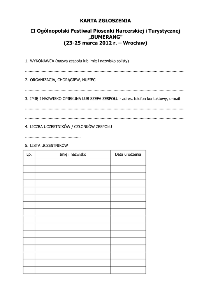 KARTA ZGŁOSZENIA II Ogólnopolski Festiwal Piosenki Harcerskiej i Turystycznej „BUMERANG” (23-25 marca 2012 r. – Wrocław) 1. WYKONAWCA (nazwa zespołu lub imię i nazwisko solisty) ........................................................................................................................................ 2. ORGANIZACJA, CHORĄGIEW, HUFIEC ........................................................................................................................................ 3. IMIĘ I NAZWISKO OPIEKUNA LUB SZEFA ZESPOŁU - adres, telefon kontaktowy, e-mail ........................................................................................................................................ ........................................................................................................................................ 4. LICZBA UCZESTNIKÓW / CZŁONKÓW ZESPOŁU ............................................... 5. LISTA UCZESTNIKÓW Lp. Imię i nazwisko Data urodzenia 6. KATEGORIA ........................................................................................................................................ 7. UTWORY ZGŁASZANE DO KONKURSU* LP RODZAJ UTWORU 1. Piosenka harcerska 2. Piosenka turystyczna TYTUŁ UTWORU CZAS WYKONANIA AUTOR SŁÓW AUTOR MUZYKI 8. KRÓTKA CHARAKTERYSTYKA WYKONAWCY (dla konferansjera) ........................................................................................................................................ ........................................................................................................................................ ........................................................................................................................................ ........................................................................................................................................ ........................................................................................................................................ ........................................................................................................................................ ...................................................................................................................................... 9. WYMAGANIA TECHNICZNE NA SCENIE (ILOŚĆ MIKROFONÓW I WEJŚĆ LINIOWYCH, ILOŚĆ KRZESEŁ ITP.) ........................................................................................................................................ ........................................................................................................................................ ........................................................................................................................................ 10. SKŁAD INSTRUMENTALNY ZESPOŁU ........................................................................................................................................ ........................................................................................................................................ ........................................................................................................................................ ........................................................................................................................................ * do karty zgłoszeniowej należy załączyć teksty piosenek zgłaszane do konkursu