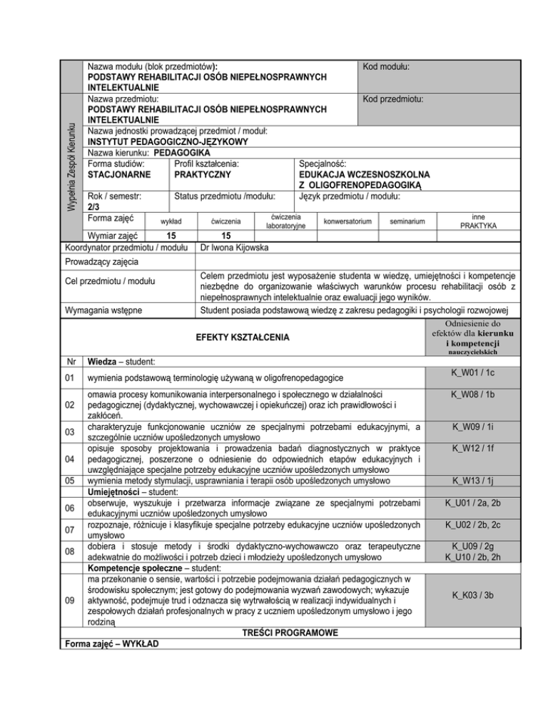 Wypełnia Zespół Kierunku Nazwa modułu (blok przedmiotów): Kod modułu: PODSTAWY REHABILITACJI OSÓB NIEPEŁNOSPRAWNYCH INTELEKTUALNIE Nazwa przedmiotu: Kod przedmiotu: PODSTAWY REHABILITACJI OSÓB NIEPEŁNOSPRAWNYCH INTELEKTUALNIE Nazwa jednostki prowadzącej przedmiot / moduł: INSTYTUT PEDAGOGICZNO-JĘZYKOWY Nazwa kierunku: PEDAGOGIKA Forma studiów: Profil kształcenia: Specjalność: STACJONARNE PRAKTYCZNY EDUKACJA WCZESNOSZKOLNA Z OLIGOFRENOPEDAGOGIKĄ Rok / semestr: Status przedmiotu /modułu: Język przedmiotu / modułu: 2/3 ćwiczenia Forma zajęć wykład ćwiczenia konwersatorium seminarium laboratoryjne Wymiar zajęć 15 Koordynator przedmiotu / modułu inne PRAKTYKA 15 Dr Iwona Kijowska Prowadzący zajęcia Cel przedmiotu / modułu Wymagania wstępne Celem przedmiotu jest wyposażenie studenta w wiedzę, umiejętności i kompetencje niezbędne do organizowanie właściwych warunków procesu rehabilitacji osób z niepełnosprawnych intelektualnie oraz ewaluacji jego wyników. Student posiada podstawową wiedzę z zakresu pedagogiki i psychologii rozwojowej EFEKTY KSZTAŁCENIA Odniesienie do efektów dla kierunku i kompetencji nauczycielskich Nr Wiedza – student: 01 wymienia podstawową terminologię używaną w oligofrenopedagogice omawia procesy komunikowania interpersonalnego i społecznego w działalności 02 pedagogicznej (dydaktycznej, wychowawczej i opiekuńczej) oraz ich prawidłowości i zakłóceń. charakteryzuje funkcjonowanie uczniów ze specjalnymi potrzebami edukacyjnymi, a 03 szczególnie uczniów upośledzonych umysłowo opisuje sposoby projektowania i prowadzenia badań diagnostycznych w praktyce 04 pedagogicznej, poszerzone o odniesienie do odpowiednich etapów edukacyjnych i uwzględniające specjalne potrzeby edukacyjne uczniów upośledzonych umysłowo 05 wymienia metody stymulacji, usprawniania i terapii osób upośledzonych umysłowo Umiejętności – student: obserwuje, wyszukuje i przetwarza informacje związane ze specjalnymi potrzebami 06 edukacyjnymi uczniów upośledzonych umysłowo rozpoznaje, różnicuje i klasyfikuje specjalne potrzeby edukacyjne uczniów upośledzonych 07 umysłowo dobiera i stosuje metody i środki dydaktyczno-wychowawczo oraz terapeutyczne 08 adekwatnie do możliwości i potrzeb dzieci i młodzieży upośledzonych umysłowo Kompetencje społeczne – student: ma przekonanie o sensie, wartości i potrzebie podejmowania działań pedagogicznych w środowisku społecznym; jest gotowy do podejmowania wyzwań zawodowych; wykazuje 09 aktywność, podejmuje trud i odznacza się wytrwałością w realizacji indywidualnych i zespołowych działań profesjonalnych w pracy z uczniem upośledzonym umysłowo i jego rodziną TREŚCI PROGRAMOWE Forma zajęć – WYKŁAD K_W01 / 1c K_W08 / 1b K_W09 / 1i K_W12 / 1f K_W13 / 1j K_U01 / 2a, 2b K_U02 / 2b, 2c K_U09 / 2g K_U10 / 2b, 2h K_K03 / 3b - Podstawowe założenia pracy rehabilitacyjnej z osobami upośledzonymi umysłowo. Zasady rehabilitacji. Dobór i stosowanie w praktyce kształcenia osób upośledzonych umysłowo efektywnych metod rehabilitacji (rewalidacji). - Zakres działalności korekcyjnej, wzmacniającej, usprawniającej, kompensującej, diagnostycznej i profilaktycznej. - Koncepcje oddziaływania na osoby upośledzone umysłowo. - Opieka i edukacja specjalna osób upośledzonych umysłowo. Forma zajęć – ĆWICZENIA 1. Klasa jako środowisko rehabilitacyjne: - oddziaływania (relacje) „nauczyciel – uczeń” - oddziaływania (relacje) „uczeń – uczeń” - struktura klasy. 2. Szkoła jako środowisko rehabilitacyjne. 3. Jakość życia osób z upośledzeniem umysłowym jako wskaźnik efektywności procesu ich rehabilitacji. Metody kształcenia wykład, prezentacja multimedialna, dyskusja, samodzielne dochodzenie do wiedzy, film, metoda projektów, metody samokształceniowe Metody weryfikacji efektów kształcenia Nr efektu kształcenia z sylabusa Egzamin pisemny Analiza treści i formy wypowiedzi studentów i ich odbioru przez grupę w trakcie dyskusji Obserwacja działań studenta w trakcie pracy w grupach Przeprowadzenie diagnozy, opracowanie i przygotowanie prezentacji wyników Forma i warunki zaliczenia Egzamin pisemny Literatura podstawowa 1. Dykcik, W., (2001), Pedagogika specjalna, Poznań: Wyd. Naukowe UAM 2. Sadowska, S., (2006), Jakość życia uczniów z niepełnosprawnością intelektualną Kraków: Oficyna Wydawnicza Impuls, 3. Sowa, J., Wojciechowski, F., (2002), Proces rehabilitacji w kontekście edukacyjnym, Rzeszów: Wyd. Oświatowe FOSZE 4. Wyczesany, J. (2002), Pedagogika upośledzonych umysłowo. Wybrane zagadnienia, Kraków: Oficyna Wyd. Impuls Literatura uzupełniająca 1. Dykcik, W., Szychowiak, B., ( 2001), Nowatorskie i alternatywne metody w teorii i praktyce pedagogiki specjalnej, Poznań: Wyd. Naukowe UAM 2. Kowalik, S. (1989), Upośledzenie umysłowe. Teoria i praktyka rehabilitacji Warszawa: PWN 3. Włodarski, Z., (1996), Psychologia uczenia się, Warszawa: PWN NAKŁAD PRACY STUDENTA: Liczba godzin Udział w wykładach 15 Samodzielne studiowanie tematyki wykładów 5 Udział w ćwiczeniach audytoryjnych i laboratoryjnych* 15 Samodzielne przygotowywanie się do ćwiczeń* 5 Przygotowanie projektu/eseju/ itp. * 10 Przygotowanie się do egzaminu / zaliczenia 5 Udział w konsultacjach Inne ŁĄCZNY nakład pracy studenta w godz. 55 Liczba punktów ECTS za przedmiot 2 01- 05 06, 07, 09 07, 08 04 Obciążenie studenta związane z zajęciami praktycznymi* Obciążenie studenta na zajęciach wymagających bezpośredniego udziału nauczycieli akademickich 30 1,2 ECTS 30 1,2 ECTS
