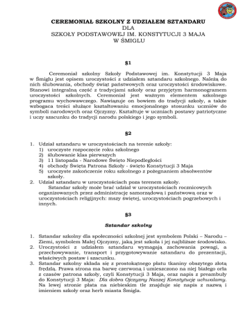 CEREMONIAŁ SZKOLNY Z UDZIAŁEM SZTANDARU DLA SZKOŁY PODSTAWOWEJ IM. KONSTYTUCJI 3 MAJA W ŚMIGLU §1 Ceremoniał szkolny Szkoły Podstawowej im. Konstytucji 3 Maja w Śmiglu jest opisem uroczystości z udziałem sztandaru szkolnego. Należą do nich ślubowania, obchody świąt państwowych oraz uroczystości środowiskowe. Stanowi integralną część z tradycjami szkoły oraz przyjętym harmonogramem uroczystości szkolnych. Ceremoniał jest ważnym elementem szkolnego programu wychowawczego. Nawiązuje on bowiem do tradycji szkoły, a także wzbogaca treści służące kształtowaniu emocjonalnego stosunku uczniów do symboli narodowych oraz Ojczyzny. Kształtuje w uczniach postawy patriotyczne i uczy szacunku do tradycji narodu polskiego i jego symboli. §2 1. Udział sztandaru w uroczystościach na terenie szkoły: 1) uroczyste rozpoczęcie roku szkolnego 2) ślubowanie klas pierwszych 3) 11 listopada - Narodowe Święto Niepodległości 4) obchody Święta Patrona Szkoły - święto Konstytucji 3 Maja 5) uroczyste zakończenie roku szkolnego z pożegnaniem absolwentów szkoły. 2. Udział sztandaru w uroczystościach poza terenem szkoły. Sztandar szkoły może brać udział w uroczystościach rocznicowych organizowanych przez administrację samorządową i państwową oraz w uroczystościach religijnych: mszy świętej, uroczystościach pogrzebowych i innych. §3 Sztandar szkolny 1. Sztandar szkolny dla społeczności szkolnej jest symbolem Polski – Narodu – Ziemi, symbolem Małej Ojczyzny, jaką jest szkoła i jej najbliższe środowisko. 2. Uroczystości z udziałem sztandaru wymagają zachowania powagi, a przechowywanie, transport i przygotowywanie sztandaru do prezentacji, właściwych postaw i szacunku. 3. Sztandar szkolny składa się z prostokątnego płatu tkaniny obszytego złotą frędzlą. Prawa strona ma barwę czerwoną i umieszczono na niej białego orła z czasów patrona szkoły, czyli Konstytucji 3 Maja, oraz napis z preambuły do Konstytucji 3 Maja: Dla dobra Ojczyzny Naszej Konstytucję uchwalamy. Na lewej stronie płata na niebieskim tle znajduje się napis z nazwą i imieniem szkoły oraz herb miasta Śmigla. CEREMONIAŁ SZKOLNY Z UDZIAŁEM SZTANDARU Szkoła Podstawowa im. Konstytucji 3 Maja w Śmiglu §4 Przechowywanie sztandaru szkolnego 1. Sztandar jest przechowywany na terenie szkoły w zamkniętej gablocie. 2. W tej samej gablocie znajdują się insygnia pocztu sztandarowego: białoczerwone szarfy, białe rękawiczki. §5 Poczet sztandarowy w szkole 1. Sztandarem opiekuje się nauczyciel wyznaczony przez Dyrektora Szkoły Podstawowej, zwany opiekunem pocztu sztandarowego i poczet sztandarowy. 2. Poczet sztandarowy składa się z 3 osób w obsadzie: chorąży (sztandarowy) uczeń i asysta – 2 uczennice. 3. Uczestnictwo w poczcie sztandarowym to najbardziej zaszczytna i honorowa funkcja uczniowska w szkole, dlatego w jego składzie winni sie znajdować uczniowie godni takiego zaszczytu wyróżniający się właściwą postawą i zachowaniem wybrani spośród uczniów klas IV, V lub VI szkoły podstawowej. 4. Obok zasadniczego składu wybiera się skład „rezerwowy” w obsadzie zgodnej z ust. 2. 5. Kandydatury uczniów do składu pocztu sztandarowego mogą być przedstawiane przez dyrektora lub wicedyrektora szkoły, opiekuna pocztu sztandarowego, wychowawców klas lub Samorząd Uczniowski na posiedzeniu Rady Pedagogicznej. i przez nią zatwierdzone. 6. Rada Pedagogiczna, po zapoznaniu się z kandydaturami, w drodze głosowania zatwierdza skład pocztu sztandarowego w obsadzie zasadniczej i rezerwowej. 7. W uzasadnionych przypadkach Rada Pedagogiczna może odwołać ucznia/ uczennicę ze składu pocztu sztandarowego. W takim przypadku dokonuje się wyboru uzupełniającego. 8. Kadencja każdego członka pocztu trwa do momentu ukończenia przez niego szkoły. 9. Chorąży i asysta powinni być ubrani odświętnie: Uczeń - garnitur lub ciemne spodnie, biała koszula, ciemne obuwie Uczennice - biała bluzka i ciemne spódnice tej samej długości lub ciemne sukienki, ciemne obuwie. 10. Insygnia pocztu sztandarowego: - biało-czerwone szarfy przewieszone przez prawe ramię, zwrócone kolorem białym w stronę kołnierza, spięte na lewym biodrze, - białe rękawiczki. 11. Zadaniem opiekuna pocztu sztandarowego jest zajmowanie się całością spraw organizacyjnych pocztu oraz dbałość o właściwą celebrację sztandaru i zgodny z ceremoniałem przebieg uroczystości na terenie szkoły. 2 CEREMONIAŁ SZKOLNY Z UDZIAŁEM SZTANDARU Szkoła Podstawowa im. Konstytucji 3 Maja w Śmiglu §6 1. Sztandar uczestniczy w najważniejszych uroczystościach szkolnych, wymienionych w § 2 ust.1, a poza szkołą na zaproszenie innych szkół i instytucji oraz w uroczystościach państwowych, kościelnych i regionalnych. 2. W przypadku, gdy poczet sztandarowy uczestniczy w uroczystościach pogrzebowych lub ogłoszono żałobę narodową, sztandar powinien być ozdobiony czarnym kirem. Na sztandarze wstążkę kiru przywiesza się w miejscu jego zamocowania na drzewcu od lewej górnej strony do prawej. 3. Podczas dłuższych przemarszów dopuszcza się możliwość trzymania sztandaru na ramieniu. Jednak przy wchodzeniu na salę lub plac uroczystości zawsze należy pochylić go do przodu. 4. W czasie uroczystości kościelnych sztandar jest wprowadzany i wyprowadzany bez podawania komend. W czasie wprowadzania sztandaru wszyscy wstają. Poczet przechodzi przez kościół, trzymając sztandar pod kątem 45% do przodu i staje po lewej lub po prawej stronie, bokiem do ołtarza i do zgromadzonych wiernych, podnosząc sztandar do pionu. W trakcie mszy św. lub innej uroczystości członkowie pocztu sztandarowego nie klękają, nie przekazują znaku pokoju i nie wykonują żadnych innych gestów, stojąc cały czas w pozycji „Baczność” lub „Spocznij”. Pochylenie sztandaru pod kątem 45% do przodu w pozycji „Baczność” następuje w następujących sytuacjac