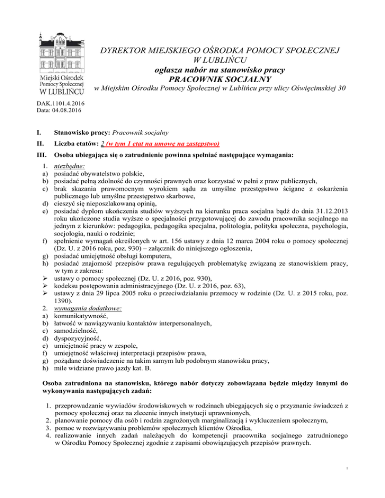 DYREKTOR MIEJSKIEGO OŚRODKA POMOCY SPOŁECZNEJ W LUBLIŃCU ogłasza nabór na stanowisko pracy PRACOWNIK SOCJALNY w Miejskim Ośrodku Pomocy Społecznej w Lublińcu przy ulicy Oświęcimskiej 30 DAK.1101.4.2016 Data: 04.08.2016 I. Stanowisko pracy: Pracownik socjalny II. Liczba etatów: 2 (w tym 1 etat na umowę na zastępstwo) III. Osoba ubiegająca się o zatrudnienie powinna spełniać następujące wymagania: 1. a) b) c) d) e) f) g) h) 2. a) b) c) d) e) f) g) h) niezbędne: posiadać obywatelstwo polskie, posiadać pełną zdolność do czynności prawnych oraz korzystać w pełni z praw publicznych, brak skazania prawomocnym wyrokiem sądu za umyślne przestępstwo ścigane z oskarżenia publicznego lub umyślne przestępstwo skarbowe, cieszyć się nieposzlakowaną opinią, posiadać dyplom ukończenia studiów wyższych na kierunku praca socjalna bądź do dnia 31.12.2013 roku ukończone studia wyższe o specjalności przygotowującej do zawodu pracownika socjalnego na jednym z kierunków: pedagogika, pedagogika specjalna, politologia, polityka społeczna, psychologia, socjologia, nauki o rodzinie; spełnienie wymagań określonych w art. 156 ustawy z dnia 12 marca 2004 roku o pomocy społecznej (Dz. U. z 2016 roku, poz. 930) – załącznik do niniejszego ogłoszenia, posiadać umiejętność obsługi komputera, posiadać znajomość przepisów prawa regulujących problematykę związaną ze stanowiskiem pracy, w tym z zakresu: ustawy o pomocy społecznej (Dz. U. z 2016, poz. 930), kodeksu postępowania administracyjnego (Dz. U. z 2016, poz. 63), ustawy z dnia 29 lipca 2005 roku o przeciwdziałaniu przemocy w rodzinie (Dz. U. z 2015 roku, poz. 1390). wymagania dodatkowe: komunikatywność, łatwość w nawiązywaniu kontaktów interpersonalnych, samodzielność, dyspozycyjność, umiejętność pracy w zespole, umiejętność właściwej interpretacji przepisów prawa, pożądane doświadczenie na takim samym lub podobnym stanowisku pracy, mile widziane prawo jazdy kat. B. Osoba zatrudniona na stanowisku, którego nabór dotyczy zobowiązana będzie między innymi do wykonywania następujących zadań: 1. przeprowadzanie wywiadów środowiskowych w rodzinach ubiegających się o przyznanie świadczeń z pomocy społecznej oraz na zlecenie innych instytucji uprawnionych, 2. planowanie pomocy dla osób i rodzin zagrożonych marginalizacją i wykluczeniem społecznym, 3. pomoc w rozwiązywaniu problemów społecznych klientów Ośrodka, 4. realizowanie innych zadań należących do kompetencji pracownika socjalnego zatrudnionego w Ośrodku Pomocy Społecznej zgodnie z zapisami obowiązujących przepisów prawnych. 1 IV. 1. 2. 3. 4. 5. VI. Informacja o warunkach pracy na danym stanowisku: praca z wykorzystaniem komputera i innych urządzeń biurowych, praca przy monitorze ekranowym poniżej 4 godzin na dobę, praca wewnątrz pomieszczenia, praca w terenie, biuro położone na parterze budynku nie wyposażonym w ciągi komunikacyjne dostosowane do potrzeb osób niepełnosprawnych. Informacja o wskaźniku zatrudnienia osób niepełnosprawnych: Wskaźnik zatrudnienia osób niepełnosprawnych w jednostce, w rozumieniu przepisów o rehabilitacji zawodowej i społecznej oraz zatrudnianiu osób niepełnosprawnych w miesiącu poprzedzającym datę upublicznienia ogłoszenia wynosił więcej niż 6%. VII. Osoby ubiegające się o zatrudnienie powinny złożyć niżej wymienione dokumenty: 1. 2. 3. 4. 5. 6. CV, list motywacyjny, własnoręcznie podpisane oświadczenie kandydata o posiadaniu obywatelstwa polskiego, własnoręcznie podpisane oświadczenie kandydata posiadaniu pełnej zdolności do czynności prawnych, własnoręcznie podpisane oświadczenie kandydata o korzystaniu z pełni praw publicznych, własnoręcznie podpisane oświadczenie kandydata o nie skazaniu prawomocnym wyrokiem sądu za umyślne przestępstwo ścigane z oskarżenia publicznego lub umyślne przestępstwo skarbowe, 7. kserokopię dokumentu potwierdzającego wykształcenie, 8. kserokopię dokumentów potwierdzających doświadczenie zawodowe. Składane oferty pracy muszą być opatrzone następującą klauzulą: „Wyrażam zgodę na przetwarzanie moich danych osobowych zawartych w ofercie pracy, zgodnie z ustawą z dnia 29 sierpnia 1997 roku o ochronie danych osobowych (Dz. U. z 2016 roku, poz. 922) i własnoręcznie podpisane. VIII. Termin i miejsce składania dokumentów: 1. wymagane dokumenty należy składać w siedzibie Ośrodka lub za pośrednictwem poczty: Miejski Ośrodek Pomocy Społecznej w Lublińcu, ul. Oświęcimska 30, w pokoju nr 12 lub 11 w terminie do dnia: 19 sierpnia 2016 roku do godziny 1000, 2. dokumenty należy składać w zamkniętych kopertach z dopiskiem: „Nabór na stanowisko pracy PRACOWNIK SOCJALNY”, 3. dokumenty, które wpłyną do Ośrodka po wyżej wykazanym terminie nie będą rozpatrywane. IX. Informacje dodatkowe: Osoby podejmujące zatrudnienie nie mogą naruszać przepisów art. 26 ustawy z dnia 21 listopada 2008 roku o pracownikach samorządowych (Dz. U. z 2016 roku, poz. 902). 2 Załącznik do ogłoszenia nabór na wolne stanowisko pracy pracownik socjalny Art. 156. 1. Osoby, które przed dniem wejścia w życie niniejszej ustawy były zatrudnione na stanowisku pracownika socjalnego na podstawie dotychczasowych przepisów, zachowują uprawnienia do wykonywania zawodu. 1a. Osoby, które przed dniem 1 maja 2004 roku ukończyły studia wyższe na kierunkach: pedagogika, psychologia, politologia, politologia i nauki społeczne lub socjologia, mogą wykonywać zawód pracownika socjalnego. 2. Osoby kierujące placówkami opiekuńczo-wychowawczymi i ośrodkami adopcyjno-opiekuńczymi powinny ukończyć specjalizację nie później niż do końca 2005 roku; osobom tym zalicza się staż pracy w placówkach opiekuńczo-wychowawczych i ośrodkach adopcyjno-opiekuńczych. 3. Osoby, które w okresie 3,5 roku od dnia wejścia w życie ustawy ukończą studia wyższe magisterskie na kier