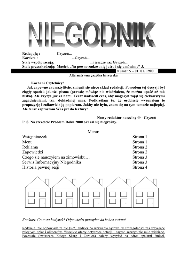 Redagują : Gryzoń... Korekta : ...Gryzoń... Stale współpracują: ...i jeszcze raz Gryzoń... Stale przeszkadzają: Maciek „Na pewno zadzwonię jutro i się umówimy” J. Numer 5 – 01. 01. 1900 Alternatywna gazetka harcerska Kochani Czytelnicy! Jak zapewne zauważyliście, zmienił się nieco skład redakcji. Powodem tej decyzji był ciągły spadek jakości pisma (prawdę mówiąc nie wiedziałem, że można upaść aż tak nisko). Ale kryzys już za nami. Teraz nadszedł czas, aby magazyn zajął się ciekawszymi zagadnieniami, tzn. dokładniej mną. Podkreślam tu, że osobiście wysunąłem tę propozycję i całkowicie ją popieram. Jakby nie było, znam się na tym temacie najlepiej. Ale teraz zapraszam Was już do lektury! Nowy redaktor naczelny / - Gryzoń P. S. Na szczęście Problem Roku 2000 okazał się niegroźny. Menu: Wstępniaczek Menu Reklama Zapowiedzi Czego się nauczyłem na zimowisku… Serwis Informacyjny Niegodnika Historia pewnej sesji Strona 1 Strona 1 Strona 2 Strona 2 Strona 3 Strona 3 Strona 4 Konkurs: Co to za budynek? Odpowiedzi przesyłać do końca świata! Redakcja nie odpowiada za nic (sic!), tudzież na wezwania sądowe, w szczególności zaś dotyczące zaległych opłat i alimentów. Wszelkie oferty dotyczące dotacji i nagród szczególnie mile widziane. Pozostałe (zwłaszcza Księgę Skarg i Zażaleń) należy wysyłać na adres spalarni śmieci. **************************************************************** REKLAMA Okazja! Tylko teraz wielka poświąteczna promocja! Zapraszamy do zakupów w naszym supermarkecie! Oto fragment naszej oferty: Nazwa art. Opis / promocja Cena W ilości powyżej 1 mln sztuk mrowisko gratis!!! Wanna dwudrzwiowa w wersji sedan Elektrycznie podnoszone szyby, lub coupe napęd na dwie nogi, pojemność 200l, ABC, poduszki wodne także płyty Discman z obsługą płyt winylowych Obsługuje chodnikowe Okazja! Kupując dwie sztuki za Uniwersalna taśma samoodlepna trzecią zapłacisz podwójną cenę!!! „Plastusiowy pamiętnik znaleziony w Światowy klasyk literatury Saragossie” wyposażenie Suszarka z miotaczem ognia firmy Dodatkowe obejmuje również wyrzutnię „Brałn” pocisków ziemia – komenda Betoniarka samobieżna z napędem Gratis wieża Dolby Stereo z 1 głośnikiem na 4 gąsienice Pasta do zębów (ew. butów) 83,5% polskiego stomatologa zaleca pastę Blind-a-med. Blind-a-med. Doskonałe auto Renault „Mowane” Gratis zamrażarka do naczyń firmy „Tombson” Tresowane mrówki obronne • • • 0,99 gr. / szt. + VAT 25.646.644,99 + podatek od luksusu 432,99 + akcyza 35.99 + podatek dochodowy 432.99 + koszt uzyskania przychodu 43,99 + podatek od wydatków 3.142,99 + koszty transportu 747,99 + cło 18.614,99 + podatek od podatków REGULAMIN ZAKUPÓW Do każdego zakupu dołączamy firmowy krótkopis gratis! Dodajemy również dwugodzinną gwarancję na uszkodzenia paranormalne! Uwaga! Każdy kupujący bierze jednocześnie udział w konkursie, którego główną nagrodą jest luksusowa, dwutygodniowa wycieczka na Hawaje! (przelot, wyżywienie, zakwaterowanie, zwiedzanie, rozrywki i opłaty manipulacyjne na koszt własny) Bezpłatna infolinia !!! 0-700-24-300 18,99 pln / min + VAT ---Kupon rabatowy!--Niniejszy kupon, drukowany na łamach „Niegodnika” uprawnia do zwyżki 20% przy każdym zakupie. Można okazywać dowolną ilość kuponów rabatowych. Nie przegap okazji! **************************************************************** W następnym numerze „Niegodnika”: • • „Gryzonie w dzisiejszych czasach – rola i znaczenie” – otwarta dyskusja. „Gryzoniowy horoskop” – przedruk oryginału z podpisem autora! • „Wywiad z Gryzoniem” – najpopularniejsza osobistość świata tylko w „Niegodniku”. • „Gryzoniowe przepowiednie” – nareszcie w Polsce! • „Gryzoń jako symbol naszych czasów – gotowce do wypracowań szkolnych. oraz być może coś o Gryzoniach… NIEGODNIK – EPIZOD V Czego nauczyłem się na zimowisku (całkiem serio i uczciwie) 1. Podczas wchodzenia pod górę należy uważać aby nie rozlać wody. 2. Woda po zamarznięciu staje się śliska. 3. Zsuwające się ciało harcerza, który poślizgnął się na lodzie trudno zatrzymać 4. Nawet kolejka ok. 30 narciarzy nie zatrzyma zsuwającego się ciała harcerza, który poślizgnął się na lodzie. 5. Jeszcze trudniej powstrzymać 31 ześlizgujących się ludzi. 6. Nie powinno się zjeżdżać na nartach, jeśli się nie sprawdziło trasy. 7. Narty łatwo pękają na kamieniach. 8. Kości także. 9. Zjeżdżając zawsze patrz przed siebie. 10. Uderzenie w wystającą gałąź może zamroczyć. 11. Sępy jedzą nie tylko padlinę. 12. Wbrew powszechnym opiniom wilki nie boją się ludzi. 13. Podobnież niedźwiedzie. Serwis informacyjny Niegodnika Jak wszyscy wiedzą, w dzisiejszych czasach czas to pieniądz i komu w drogę temu kopa na rozpęd. Dlatego też redakcja z dumą otwiera serwis informacyjny. Oto najważniejsze wydarzenia minionych tygodni: ---------------------------------------------------• Wobec narastających sygnałów o nadużywaniu alkoholu w niektórych drużynach Zarząd Główny postanowił "rozwiązać" problem. Właściwie to "rozwiązał" od razu dwa problemy: starszy męski i starszy żeński. ---------------------------------------------------członkowie drużyny • Niektórzy zdecydowali się na odejście. Jeden z nich to Maciej R. ps. „Toczka” lub „Baryła". Postanowił on przystąpić do jednej z młodzieżowych subkultur. Zapytany o powód decyzji odpowiedział: "Maciek mówi punkowy!". ---------------------------------------------------- 14. Nigdy nie stawaj na zamarzniętym jeziorze. 15. Woda w lutym jest lodowata. 16. Staraj się nie krzyczeć zbyt głośno i nie bawić petardami. 17. Ratownicy przyjeżdżają po ok. 10 min. od zejścia lawiny. 18. Pod śniegiem nie da się oddychać. 19. Słowa „Idźcie się czymś zająć” i „Narty” nie powin