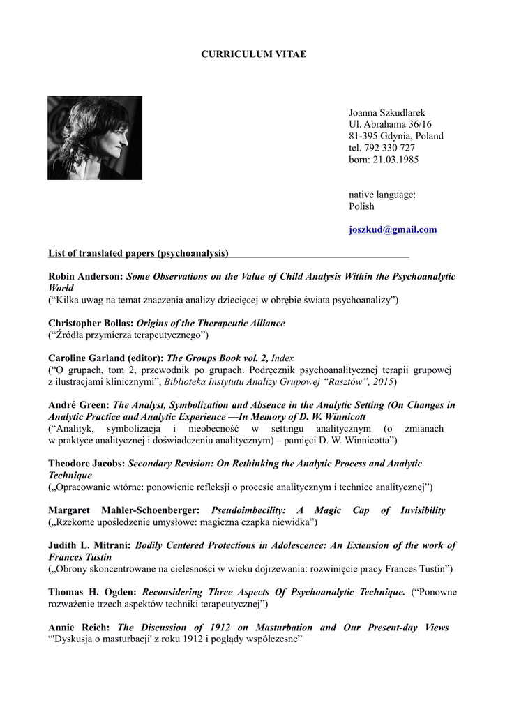 CURRICULUM VITAE Joanna Szkudlarek Ul. Abrahama 36/16 81-395 Gdynia, Poland tel. 792 330 727 born: 21.03.1985 native language: Polish [email protected] List of translated papers (psychoanalysis) Robin Anderson: Some Observations on the Value of Child Analysis Within the Psychoanalytic World (“Kilka uwag na temat znaczenia analizy dziecięcej w obrębie świata psychoanalizy”) Christopher Bollas: Origins of the Therapeutic Alliance (“Źródła przymierza terapeutycznego”) Caroline Garland (editor): The Groups Book vol. 2, Index (“O grupach, tom 2, przewodnik po grupach. Podręcznik psychoanalitycznej terapii grupowej z ilustracjami klinicznymi”, Biblioteka Instytutu Analizy Grupowej “Rasztów”, 2015) André Green: The Analyst, Symbolization and Absence in the Analytic Setting (On Changes in Analytic Practice and Analytic Experience —In Memory of D. W. Winnicott (“Analityk, symbolizacja i nieobecność w settingu analitycznym (o zmianach w praktyce analitycznej i doświadczeniu analitycznym) – pamięci D. W. Winnicotta”) Theodore Jacobs: Secondary Revision: On Rethinking the Analytic Process and Analytic Technique („Opracowanie wtórne: ponowienie refleksji o procesie analitycznym i technice analitycznej”) Margaret Mahler-Schoenberger: Pseudoimbecility: A Magic („Rzekome upośledzenie umysłowe: magiczna czapka niewidka”) Cap of Invisibility Judith L. Mitrani: Bodily Centered Protections in Adolescence: An Extension of the work of Frances Tustin („Obrony skoncentrowane na cielesności w wieku dojrzewania: rozwinięcie pracy Frances Tustin”) Thomas H. Ogden: Reconsidering Three Aspects Of Psychoanalytic Technique. (“Ponowne rozważenie trzech aspektów techniki terapeutycznej”) Annie Reich: The Discussion of 1912 on Masturbation and Our Present-day Views “'Dyskusja o masturbacji' z roku 1912 i poglądy współczesne” Frank Summers: The Analyst's Vision of the Patient („Wyobrażenie analityka o pacjencie i działanie terapeutyczne”) and Therapeutic Action Donald Winnicott: - The Depressive Position in Normal Emotional Development - Dissociation Revealed in a Therapeutic Consultation (- „Pozycja depresyjna w prawidłowym rozwoju emocjonalnym”, - „Dysocjacja ujawniona podczas konsultacji terapeutycznej”) Other translations____________________ - „The Swedish Third Sector. Histrory, Development and Impact on Society” [In]: „Animacja współpracy środowiskowej”, edited by Prof. M. Mendel, Adam Marszałek Publishing House, Toruń, 2007 - „Home as the Child's Own Space” [In]: „Pedagogika miejsca”, edited by Prof. M. Mendel, Academic Publishing House of Dolnośląska Szkoła Wyższa, Wrocław, 2006 - Cooperation with Interling translation agency (technical translations), 2014-2015 Other Experience 4 Arts Foundation Foundation's VP (since 2014) The Gdansk Shakespeare Theatre Department of Education (Second Coordinator of an international project „Shakesploring Culture”, and „Teatralny Pasjans” - since 2013), Two Windows Theatre (Second Coordinator of Artistic Performances - 2010 - 2012) Pomeranian Psychotraumatology Center Foundation, clinical centre for youth (2012 - 2013) Coach of artistic and vocational development, co-leader of therapeutic community Polish-Japanese College of Computer Techniques (2012/2013) Philosophy lecturer Top English School (2005 - 2006) English language lecturer (Callan's Method) Edukacja Gdansk Medical University (2012/2013) Postgraduate studies – Art Therapy University of Gdansk, Social Department (2004 - 2009) Master's Degree in Philosophy (thesis: Studies Psychoanalytical and Cognitive Approach to Hysteria and its Example in Literature) University of Cambridge Advanced Certificate in English (2002) grade A Additional education and experience Training under „Trauma. Living through” project „Leading Therapeutic Community” – specialists from The Clinic of Personality Disorders and Neurosis in Krakow (16 hrs) and Tina Heede – child psychotherapy specialist (16 hrs) LP School (2010) Corel Draw & Adobe Photoshop as DTP Tools Living and working in London July – September 2006