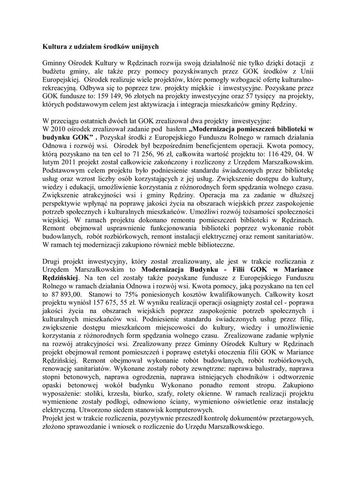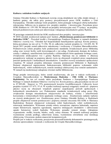 Kultura z udziałem środków unijnych Gminny Ośrodek Kultury w Rędzinach rozwija swoją działalność nie tylko dzięki dotacji z budżetu gminy, ale także przy pomocy pozyskiwanych przez GOK środków z Unii Europejskiej. Ośrodek realizuje wiele projektów, które pomogły wzbogacić ofertę kulturalnorekreacyjną. Odbywa się to poprzez tzw. projekty miękkie i inwestycyjne. Pozyskane przez GOK fundusze to: 159 149, 96 złotych na projekty inwestycyjne oraz 57 tysięcy na projekty, których podstawowym celem jest aktywizacja i integracja mieszkańców gminy Rędziny. W przeciągu ostatnich dwóch lat GOK zrealizował dwa projekty inwestycyjne: W 2010 ośrodek zrealizował zadanie pod hasłem „Modernizacja pomieszczeń biblioteki w budynku GOK” . Pozyskał środki z Europejskiego Funduszu Rolnego w ramach działania Odnowa i rozwój wsi. Ośrodek był bezpośrednim beneficjentem operacji. Kwota pomocy, którą pozyskano na ten cel to 71 256, 96 zł, całkowita wartość projektu to: 116 429, 04. W lutym 2011 projekt został całkowicie zakończony i rozliczony z Urzędem Marszałkowskim. Podstawowym celem projektu było podniesienie standardu świadczonych przez bibliotekę usług oraz wzrost liczby osób korzystających z jej usług. Zwiększenie dostępu do kultury, wiedzy i edukacji, umożliwienie korzystania z różnorodnych form spędzania wolnego czasu. Zwiększenie atrakcyjności wsi i gminy Rędziny. Operacja ma za zadanie w dłuższej perspektywie wpłynąć na poprawę jakości życia na obszarach wiejskich przez zaspokojenie potrzeb społecznych i kulturalnych mieszkańców. Umożliwi rozwój tożsamości społeczności wiejskiej. W ramach projektu dokonano remontu pomieszczeń biblioteki w Rędzinach. Remont obejmował usprawnienie funkcjonowania biblioteki poprzez wykonanie robót budowlanych, robót rozbiórkowych, remont instalacji elektrycznej oraz remont sanitariatów. W ramach tej modernizacji zakupiono również meble biblioteczne. Drugi projekt inwestycyjny, który został zrealizowany, ale jest w trakcie rozliczania z Urzędem Marszałkowskim to Modernizacja Budynku - Filii GOK w Mariance Rędzińskiej. Na ten cel zostały także pozyskane fundusze z Europejskiego Funduszu Rolnego w ramach działania Odnowa i rozwój wsi. Kwota pomocy, jaką pozyskano na ten cel to 87 893,00. Stanowi to 75% poniesionych kosztów kwalifikowanych. Całkowity koszt projektu wyniósł 157 675, 55 zł. W wyniku realizacji operacji osiągnięty został cel - poprawa jakości życia na obszarach wiejskich poprzez zaspokojenie potrzeb społecznych i kulturalnych mieszkańców wsi. Podniesienie standardu świadczonych usług przez filię, zwiększenie dostępu mieszkańcom miejscowości do kultury, wiedzy i umożliwienie korzystania z różnorodnych form spędzania wolnego czasu. Zrealizowane zadanie wpłynie na rozwój atrakcyjności wsi. Zrealizowany przez Gminny Ośrodek Kultury w Rędzinach projekt obejmował remont pomieszczeń i poprawę estetyki otoczenia filii GOK w Mariance Rędzińskiej. Remont obejmował wykonanie robót budowlanych, robót rozbiórkowych, renowację sanitariatów. Wykonane zostały roboty zewnętrzne: naprawa balustrady, naprawa stopni betonowych, naprawa ogrodzenia, naprawa istniejących chodników i odtworzenie opaski betonowej wokół budynku Wykonano ponadto remont stropu. Zakupiono wyposażenie: stoliki, krzesła, biurko, szafy, rolety okienne. W ramach realizacji projektu wymienione zostały podłogi, odnowiono ściany, wymieniono oświetlenie oraz instalację elektryczną. Utworzono siedem stanowisk komputerowych. Projekt jest w trakcie rozliczenia, pozytywnie przeszedł kontrolę dokumentów przetargowych, złożono sprawozdanie i wniosek o rozliczenie do Urzędu Marszałkowskiego. Oprócz projektów inwestycyjnych GOK ma na swoim koncie szereg rozpoczętych projektów miękkich w ramach tzw Małych Projektów z Europejskiego Funduszu Rolnego. Oto te projekty: 1. Impreza bożonarodzeniowa, której głównym celem jest zachowanie lokalnego dziedzictwa kulturowego i historycznego, miejscowych tradycji, obrzędów i zwyczajów. Przewodnim motywem projektu jest hasło „Pamiętajmy o tradycji”. Na ten cel Gminny Ośrodek Kultury pozyskał dotację unijną w wysokości 17 022, 59, całkowita wartość projektu obliczona została na około 28 000,00 zł. Projekt jest w trakcie realizacji. GOK podpisał już stosowną umowę z Urzędem Marszałkowskim. 2. Szkolna Liga szachowa, to cykl turniejów szachowych. Projekt jest realizowany w gminach: Rędziny, Kłomnice, Kruszyna, Mykanów, Miedźno. Celem projektu jest podniesienie jakości życia społeczności lokalnej, popularyzacja gry szachowej w środowiskach gminnych i wiejskich oraz wyrobienie u dzieci zdolności planowania działań, logicznego myślenia poprzez grę w szachy. Zadaniem projektu jest także integracja młodzieży szkolnej z gmin biorących udział w projekcie. Gminny Ośrodek Kultury pozyskał kwotę 6 143, 49 zł, natomiast całkowity koszt projektu wynosi 8775, 42 zł. Projekt jest w trakcie realizacji. Do kwietnia 2012 roku ośrodek musi dokonać rozliczenia. 3. Piknik Rodzinny „Barwy Lata 2012”. Na przygotowanie tej imprezy plenerowej została podpisana stosowana umowa. Gminny Ośrodek Kultury pozyskał kwotę pomocy w wysokości 19 269, 62 zł, natomiast całkowity koszt projektu to 27 528,03. Projekt będzie realizowany w lipcu 2012 roku.. 4. Wniosek na realizację zadania pt. „Wyposażenie w sprzęt multimedialny Filii Gminnego Ośrodka Kultury w Mariance Rędzińskiej” pełniącego funkcję świetlicy wiejskiej przeszedł pozytywnie formalną ocenę. Jest w trakcie merytorycznej oceny. Ośrodek jest już po drugich poprawkach i oczekuje na podpisanie umowy. Koszt dofinansowania, o który stara się GOK to 14 640, 50 zł, całkowity koszt projektu to 25 724, 75 zł. Gminny Ośrodek Kultury jest także beneficjentem wniosku z Europejskiego Funduszu Społecznego. - Z