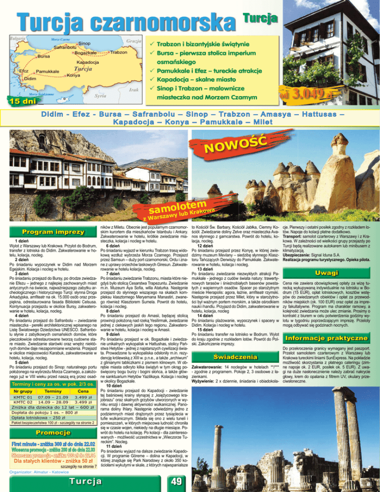 Turcja czarnomorska Turcja Bułgaria Morze Czarne Bursa Gruzja Sinop Safranbolu Bogazkale Trabzon Kapadocja Efcz Turcja Pamukkale Konya Didim Irak Morze Morzze ŚŚródziemne ród 15 dni Syria 3 Trabzon i bizantyjskie ćwiðtynie 3 Bursa - pierwsza stolica imperium osmaýskiego 3 Pamukkale i Efez – tureckie atrakcje 3 Kapadocja – skalne miasto 3 Sinop i Trabzon – malownicze miasteczka nad Morzem Czarnym od 3.049 zá C D i d i m - E f e z - B u r s a – S a f r a n b o l u – S i n o p – Tr a b z o n – A m a s y a – H a t t u s a s – Kapadocja – Konya – Pamukkale – Milet ĝû NOWO olobtKeram kowa sasm zawy lu z War Program imprezy 1 dzieĕ Wylot z Warszawy lub Krakowa. Przylot do Bodrum, transfer z lotniska do Didim. Zakwaterowanie w hotelu, kolacja, nocleg. 2 dzieĕ Po Ğniadaniu wypoczynek w Didim nad Morzem Egejskim. Kolacja i nocleg w hotelu. 3 dzieĕ Po Ğniadaniu przejazd do Bursy, po drodze zwiedzanie Efezu – jednego z najlepiej zachowanych miast antycznych na Ğwiecie, najwaĪniejszego zabytku archeologicznego i historycznego Turcji: sáynna Droga Arkadyjska, am¿teatr na ok. 15.000 osób oraz przepiĊkna, odrestaurowana fasada Biblioteki Celsusa. Kontynuacja przejazdu w okolice Bursy, zakwaterowanie w hotelu, kolacja, nocleg. 4 dzieĕ Po Ğniadaniu przejazd do Safranbolu – zwiedzanie miasteczka - pereáki architektonicznej wpisanego na ListĊ ĝwiatowego Dziedzictwa UNESCO. Safranbolu sáynie z zabytkowych osmaĔskich domów, które pieczoáowicie odrestaurowane tworzą cudowne stare miasto. Zwiedzanie starówki oraz wnĊtrz niektórych domów daje niezapomniane wraĪenia. Przejazd w okolice miejscowoĞci Karabuk, zakwaterowanie w hotelu, kolacja, nocleg. 5 dzieĕ Po Ğniadaniu przejazd do Sinop: naturalnego portu poáoĪonego na wybrzeĪu Morza Czarnego, a zaáoĪonego juĪ w VIII wieku przed naszą erą przez osad- Terminy i ceny za os. w pok. 2/3 os. Nr grupy Terminy Cena KMTC 01 KMTC 02 07.09 – 21.09 14.09 – 28.09 3.499 zá 3.499 zá ZniĪka dla dziecka do 12 lat – 600 zá Dopáata do pokoju 1 os. – 800 zá Opáata lotniskowa – 250 zá Pakiet bezpieczeĔstwa 100 zá - szczegóáy na stronie 2 Promocje First minute - zniīka 300 zâ do dnia 22.02 Wiosenna promocja - zniīka 200 zâ do dnia 22.03 Sâoneczna promocja - zniīka 100 zâ do 22.04 Dla staâych klientów - zniīka 50 zâ szczegóáy na stronie 7 ników z Miletu. Obecnie jest popularnym czarnomorskim kurortem dla mieszkaĔców Istanbulu i Ankary. Zakwaterowanie w hotelu, krótkie zwiedzanie miasteczka, kolacja i nocleg w hotelu. 6 dzieĕ Po Ğniadaniu wyjazd w kierunku Trabzon trasą widokową wzdáuĪ wybrzeĪa Morza Czarnego. Przejazd przez Samsun – duĪy port czarnomorski, Ordu i znane z uprawy orzechów laskowych Giresun. Zakwaterowanie w hotelu kolacja, nocleg. 7 dzieĕ Po Ğniadaniu zwiedzanie Trabzonu, miasta które niegdyĞ byáo stolicą Cesarstwa Trapezuntu. Zwiedzanie m.in. Muzeum Aya So¿a, willa Ataturka. NastĊpnie przejazd do sáynnego wiszącego na skaáach kompleksu klasztornego Meryemana Manastiri, zwanego równieĪ Klasztorem Sumela. Powrót do hotelu, kolacja i nocleg. 8 dzieĕ Po Ğniadaniu przejazd do Amasii, bĊdącej stolicą prowincji poáoĪoną nad rzeką Yesilirmak, zwiedzanie jednej z ciekawych jaskiĔ tego regionu. Zakwaterowanie w hotelu, kolacja i nocleg w Amasii. 9 dzieĕ Po Ğniadaniu przejazd w ok. Bogazkale i zwiedzanie unikalnych wykopalisk w Hattushas, stolicy PaĔstwa Hetytów - jednej z najstarszych cywilizacji Ğwiata. Prowadzone tu wykopaliska odsáoniáy m.in. rezydencjĊ królewską z XIII w. p.n.e., a takĪe „archiwum” z glinianymi tabliczkami z pismem klinowym. W obrĊbie miasta odkryto kilka ĞwiątyĔ w tym okrąg poĞwiĊcony bogu burzy i bogini sáoĔca, a takĪe gáówne sanktuarium Hetytów Yazilikaya. Kolacja i nocleg w okolicy Bogazkale. 10 dzieĕ Po Ğniadaniu przejazd do Kapadocji - zwiedzanie tej baĞniowej krainy sáynącej z „ksiĊĪycowego krajobrazu” oraz skalnych grzybów utworzonych w wyniku erozji i dawnej aktywnoĞci wulkanicznej. Panorama doliny Ihlary. NastĊpnie odwiedzimy jedno z podziemnych miast drąĪonych przez tysiąclecia w tu¿e wulkanicznym. Skáada siĊ ono z wielu tuneli i pomieszczeĔ, w których miejscowa ludnoĞü chroniáa siĊ w czasie wojen, niekiedy na dáugie miesiące. Powrót do hotelu na kolacjĊ. Po kolacji - dla zainteresowanych - moĪliwoĞü uczestnictwa w „Wieczorze Tureckim”. Nocleg. 11 dzieĕ Po Ğniadaniu wyjazd na dalsze zwiedzanie Kapadocji. W programie Göreme – dolina w Kapadocji, w której znajduje siĊ Park Narodowy z okoáo 350 koĞcioáami wykutymi w skale, z których najwspanialsze Organizator: Almatur - Katowice Turcja 49 to KoĞcióá ĝw. ĝ Barbary, KoĞcióá Jabáka, Ciemny KoĞcióá. Zwiedzanie doliny Zelve oraz miasteczka Avanos sáynnego z garncarstwa. Powrót do hotelu, kolacja, nocleg. 12 dzieĕ Po Ğniadaniu przejazd przez KonyĊ, w której zwiedzimy muzeum Mevlany – siedzibĊ sáynnego Klasztoru TaĔczących Derwiszy do Pamukkale. Zakwaterowanie w hotelu, kolacja i nocleg. 13 dzieĕ Po Ğniadaniu zwiedzanie niezwykáych atrakcji Pamukkale - jednego z cudów Ğwiata natury: trawertynowych tarasów i ĞnieĪnobiaáych basenów powstaáych z wapiennych osadów. Spacer po staroĪytnym mieĞcie Hierapolis: agora, áaĨnie, am¿teatr rzymski. NastĊpnie przejazd przez Milet, który w staroĪytnoĞci byá waĪnym portem morskim, a takĪe oĞrodkiem nauki i handlu. Przyjazd do Didim, zakwaterowanie w hotelu, kolacja, nocleg 14 dzieĕ Po Ğniadaniu plaĪowanie, wypoczynek i spacery w Didim. Kolacja i nocleg w hotelu. 15 dzieĕ Po Ğniadaniu transfer na lotnisko w Bodrum. Wylot do kraju zgodnie z rozkáadem lotów. Powrót do Polski. ZakoĔczenie imprezy. cje. Pierwszy i ostatni posiáek zgodny z rozkáadem lotów. Napoje do kolacji páatne dodatkowo. Transport: samolot czarterowy z Warszawy i z Krakowa. W zaleĪnoĞci od wielkoĞci grupy przejazdy po Turc
