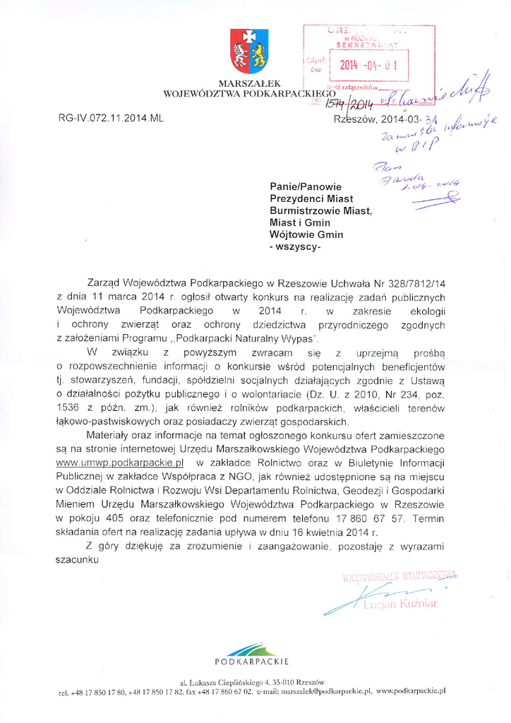 -/, /:? RG-|V.072.1 1 2014 ML Pa n ie/Pa nowie Prezydenci Miast Burmistrzowie Miast, Miast i Gmin Wójtowie Gmin - wszyscy- z a? ,>-"Lt ' '/- cłź '"' " Zarząd V'l ojewÓ d ztwa Podkarpackiego w Rzeszowie Uchwała Nr 32\fiB12l14 dnia 11 marca 2014 r ' ogłosiłotwańy konkurs na realizaĄę zadań publicznych Województwa Podkarpackiego w 2014 T. W zakresie eko|ogii i ochrony zwierząt oraz ochrony dziedzictwa przyrodniczego zgodnych z załoŻeniami Programu ,,Podkarpacki Naturalny Wypas''. o W związku z powyŻszym zwracam sje z uprzejmą prośbą rozpowsZechnienie informacji o konkursie wśrÓd potenc]aInych beneficjentÓw t1' stowarzyszeń, fundacji' spółdzielni soc1aInych działających zgodnie Z UStaWą o działalnośclpoŹytku pub|icznego i o wolontariacie (Dz' U' z 2010, Nr 234, poz' 1536 z poŹn. zm.), 1ak rÓwnież roIników podkarpackich, właścjcjeliterenóW łąkowo-pastwiskowych oraz posiadaczy zwierząt gospodarskich. Materiały oraz informacje na temat ogłoszonego konkursu ofeń zamieszczone są na stronie jnternetowej Urzędu Marszałkowskiego Województwa Podkarpackiego www' umwp' podkarpackie. p| w zakładce Ro|nictwo oraz w Biu|etynie lnformacji Pub|icznej w zakładce WspÓłpraca z NGo, jak również udostępnione są na miejscu w oddziale Rolnictwa i Rozwoju Wsi Depańamentu RoInictwa' Geodezji iGospodarki Mieniem Urzędu Marszałkowskiego Województwa Podkarpackiego W RZeSZoWie w pokoju 405 oraz telefonicznie pod numerem telefonu 17 860 67 57. Termin składania ofert na realizaqę zadania upływa w dniu 16 kwietnia 2014 r. Z gory dziękuję za zrozumienie i zaangazowanie, pozostaję z wyrazami szacunku -f* PODKARPACKIE al. Łukasza Cieplińskiego 4' 35-0l0 Rzeszów tcl. +48 17 850 17 80. +48 17 850 17 82, fax +48 I7 860 6'1 02, e-mail: [email protected], www.podkarpackie.pl