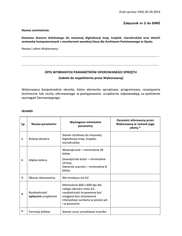 Znak sprawy: DAG.26.20.2014 Załącznik nr 2 do SIWZ Nazwa zamówienia: Dostawa skanera dziełowego do masowej digitalizacji map, książek, starodruków oraz dwóch zestawów komputerowych z monitorami wysokiej klasy dla Archiwum Państwowego w Opolu Nazwa i adres Wykonawcy: …………………………………………………………………………………………………………………………………………………………… …………………………………………………………………………………………………………………………………………………………… OPIS WYBRANYCH PARAMETRÓW OFEROWANEGO SPRZĘTU (tabele do wypełnienia przez Wykonawcę) Wykonawca bezpośrednio określa, które elementy sprzętowe, programowe, rozwiązania techniczne lub cechy oferowanego w postępowaniu urządzenia odpowiadają za spełnienie wymagań Zamawiającego. SKANER Lp. 1. Nazwa parametru Rodzaj skanera Wymagane minimalne parametry Skaner dziełowy do masowej digitalizacji map, książek, starodruków Wewnętrznie – minimalnie 36 bitów 2. Głębia koloru Zewnętrznie kolor – minimalnie 24 bity, Odcienie szarości – minimalnie 8 bitów 3. Obszar skanowania Nie mniejszy niż A2 Rozdzielczość optyczna urządzenia Minimalnie 600 x 600 dpi dla całego obszaru stołu A2, rozdzielczość ta powinna być osiągana bez stosowania interpolacji zarówno w pionie jak i w poziomie. Formaty plików wynikowych Skaner musi umożliwiać transfer zeskanowanych obrazów do stacji 4. 5. Parametr oferowany przez Wykonawcę w ramach jego oferty * wynikowych zeskanowanych obrazów do stacji skanującej w postaci plików o formatach co najmniej TIFF i JPEG. Skaner musi zapewniać oświetlenie oryginału zimnym światłem LED nie zawierającym promieniowania IR oraz UV. 6. Oświetlenie obiektu W celu minimalizacji czasu naświetlania oryginału, oświetlany powinien być wyłącznie skanowany w danym momencie fragment obiektu. Oświetlenie nie powinno powodować zaciemnień w miejscu zszycia lub łączenia dokumentów. 7. Skanowanie dzieł zwartych Skaner musi umożliwiać skanowanie dzieł zwartych (głęboko zszytych) o grzbiecie o grubości 15 cm. Skaner musi być wyposażony w szybę dociskową. 8. Szyba dociskowa Skaner musi mieć możliwość pracy z i bez użycia szyby dociskowej. Wymagana jest możliwość szybkiego przejścia między trybami skanowania z szybą i bez, bez użycia narzędzi. Kopie wykonane bez użycia szyby nie mogą odbiegać jakościowo od tych wykonanych z szybą. 9. Stół dokumentowy Skaner musi być wyposażony w kołyskę elektryczną lub pneumatyczną umożliwiającą skanowanie dzieł zwartych, sterowaną za pomocą przycisków dostępnych na panelu sterującym urządzenia. Pozycjonowanie szalek automatycznie i manualnie. Strona 2 Skaner musi skanować obiekty nie dłużej niż 10. Szybkość skanowania - 4 sekund (dla A2+ w 300 dpi) - 10 sekund (dla A2+ w 600 dpi) 11. Kadrowanie Skaner musi automatycznie rozpoznawać format skanowanego obiektu i kadrować obraz ze zdefiniowanym przez operatora marginesem. 12. Interfejs fizyczny 1 Gigabit Ethernet (TCP/IP) , IEEE 1394 lub USB 2.0 13. Sposób obsługi Skaner musi umożliwiać uruchomienie procesu skanowania za pomocą przycisku ręcznego lub/i pedału nożnego oraz komputera. 14. Dedykowany stół Jeżeli skaner wymaga stołu musi on zostać dostarczony w zestawie Skaner musi być dostarczony wraz z oprogramowaniem. Wymagane cechy i funkcje oprogramowania (pojedynczy program lub zestaw programów): 15. · interfejs użytkownika w języku polskim, · wybór rozdzielczości i trybu skanowania (kolorowy, monochromatyczny), · możliwość predefiniowania wielu obszarów do skanowania i zapisywania ich skanów w postaci odrębnych plików · możliwość kompresji plików, · automatyczne rozpoznawanie skanowanego formatu wraz z odpowiednim kadrowaniem, · możliwość ręcznego kadrowania i podziału obrazu, · możliwość automatycznego lub ręcznego podziału na prawą i lewą stronę Oprogramowanie Strona 3 z usunięciem marginesu wewnętrznego, · możliwość korekcji obrazu: jasność, kontrast, prostowanie, maskowanie zadanych obszarów · możliwość dodawania metadanych do zeskanowanych obiektów · zapis obrazów w formatach min.: TIFF, JPEG. · możliwość wykonywania operacji obróbki zadań równolegle (w tle) z procesem skanowania, · możliwość importowania plików z obrazami w formatach TIFF i JPEG, · możliwość zapisywania plików wynikowych z profilem oraz bez profilu ICC wygenerowanego dla danego typu skanera Skaner musi być objęty co najmniej 24 miesięczną gwarancją, w ramach której Wykonawca zapewni bez jakichkolwiek dodatkowych opłat: 16. · wsparcie techniczne realizowane przez telefon oraz e-mail w godzinach pracy Wykonawcy (bez ograniczeń co do ilości), · naprawy sprzętu w miejscu instalacji – przy czym czas reakcji na zgłoszenie usterki nie może przekraczać 3 dni roboczych, a czas naprawy urządzenia nie może przekraczać 14 dni, · kalibrację skanera Gwarancja Strona 4 (w razie konieczności jej wykonania) bez ograniczeń co do ilości – w miejscu instalacji lub zdalnie. · 17. Dostawa możliwość bezpłatnego wygenerowania profilu ICC dla urządzenia przez cały okres gwarancji (w miejscu instalacji lub zdalnie). Dostawa urządzenia musi obejmować: montaż, instalację i konfigurację sprzętu (łącznie z kalibracją skanera, monitora – dostarczonego przez Archiwum – oraz oprofilowania monitora), instalację oprogramowania oraz instruktaż dla wskazanych 4 operatorów Zamawiającego (czas minimalny – 8 godzin) w zakresie obsługi sprzętu i oprogramowania. Urządzenie zostanie dostarczone wraz z dokumentacją w języku polskim (komplet instrukcji oraz podręcznik użytkownika oprogramowania). Uczestnicy instruktażu muszą otrzymać materiały w języku polskim, opisujące czynności operatorskie niezbędne d