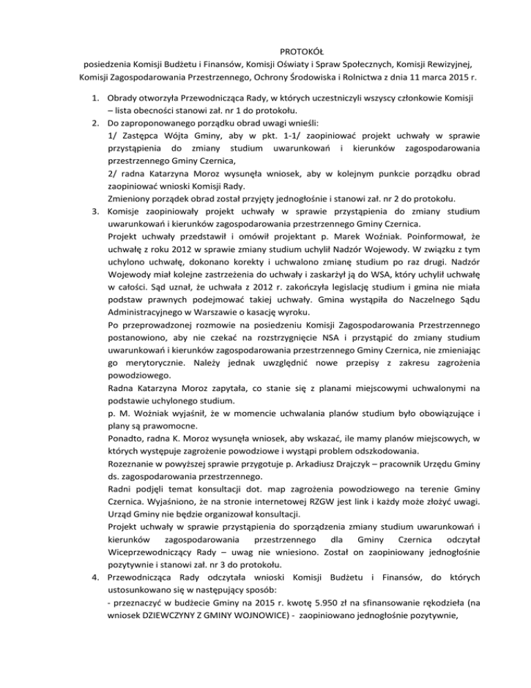 PROTOKÓŁ posiedzenia Komisji Budżetu i Finansów, Komisji Oświaty i Spraw Społecznych, Komisji Rewizyjnej, Komisji Zagospodarowania Przestrzennego, Ochrony Środowiska i Rolnictwa z dnia 11 marca 2015 r. 1. Obrady otworzyła Przewodnicząca Rady, w których uczestniczyli wszyscy członkowie Komisji – lista obecności stanowi zał. nr 1 do protokołu. 2. Do zaproponowanego porządku obrad uwagi wnieśli: 1/ Zastępca Wójta Gminy, aby w pkt. 1-1/ zaopiniować projekt uchwały w sprawie przystąpienia do zmiany studium uwarunkowań i kierunków zagospodarowania przestrzennego Gminy Czernica, 2/ radna Katarzyna Moroz wysunęła wniosek, aby w kolejnym punkcie porządku obrad zaopiniować wnioski Komisji Rady. Zmieniony porządek obrad został przyjęty jednogłośnie i stanowi zał. nr 2 do protokołu. 3. Komisje zaopiniowały projekt uchwały w sprawie przystąpienia do zmiany studium uwarunkowań i kierunków zagospodarowania przestrzennego Gminy Czernica. Projekt uchwały przedstawił i omówił projektant p. Marek Woźniak. Poinformował, że uchwałę z roku 2012 w sprawie zmiany studium uchylił Nadzór Wojewody. W związku z tym uchylono uchwałę, dokonano korekty i uchwalono zmianę studium po raz drugi. Nadzór Wojewody miał kolejne zastrzeżenia do uchwały i zaskarżył ją do WSA, który uchylił uchwałę w całości. Sąd uznał, że uchwała z 2012 r. zakończyła legislację studium i gmina nie miała podstaw prawnych podejmować takiej uchwały. Gmina wystąpiła do Naczelnego Sądu Administracyjnego w Warszawie o kasację wyroku. Po przeprowadzonej rozmowie na posiedzeniu Komisji Zagospodarowania Przestrzennego postanowiono, aby nie czekać na rozstrzygnięcie NSA i przystąpić do zmiany studium uwarunkowań i kierunków zagospodarowania przestrzennego Gminy Czernica, nie zmieniając go merytorycznie. Należy jednak uwzględnić nowe przepisy z zakresu zagrożenia powodziowego. Radna Katarzyna Moroz zapytała, co stanie się z planami miejscowymi uchwalonymi na podstawie uchylonego studium. p. M. Wożniak wyjaśnił, że w momencie uchwalania planów studium było obowiązujące i plany są prawomocne. Ponadto, radna K. Moroz wysunęła wniosek, aby wskazać, ile mamy planów miejscowych, w których występuje zagrożenie powodziowe i wystąpi problem odszkodowania. Rozeznanie w powyższej sprawie przygotuje p. Arkadiusz Drajczyk – pracownik Urzędu Gminy ds. zagospodarowania przestrzennego. Radni podjęli temat konsultacji dot. map zagrożenia powodziowego na terenie Gminy Czernica. Wyjaśniono, że na stronie internetowej RZGW jest link i każdy może złożyć uwagi. Urząd Gminy nie będzie organizował konsultacji. Projekt uchwały w sprawie przystąpienia do sporządzenia zmiany studium uwarunkowań i kierunków zagospodarowania przestrzennego dla Gminy Czernica odczytał Wiceprzewodniczący Rady – uwag nie wniesiono. Został on zaopiniowany jednogłośnie pozytywnie i stanowi zał. nr 3 do protokołu. 4. Przewodnicząca Rady odczytała wnioski Komisji Budżetu i Finansów, do których ustosunkowano się w następujący sposób: - przeznaczyć w budżecie Gminy na 2015 r. kwotę 5.950 zł na sfinansowanie rękodzieła (na wniosek DZIEWCZYNY Z GMINY WOJNOWICE) - zaopiniowano jednogłośnie pozytywnie, - przeznaczyć w budżecie Gminy na 2015 r. kwotę 6.000 zł na realizację zadania – „Kultura fizyczna i sport” dla Ludowego Uczniowskiego Klubu Sportowego Hansu w Chrząstawie Wlk. zaopiniowano jednogłośnie pozytywnie. 5. Komisje zaopiniowały projekty uchwał w sprawie : 1/ zmiany budżetu Gminy Czernica na 2015 rok Projekt zmian budżetu przedstawiła i omówiła p. Skarbnik. Poinformowała, że zmian dokonano w zakresie: - pomniejszenia dochodów budżetu o kwotę 164.543 zł z tytułu pomniejszenia subwencji oświatowej, - powiększenia dochodów o łączną kwotę 215.400 zł z tytułu odzyskania podatku VAT od działalności Urzędu Gminy - 75.400 zł oraz przez ZGK od działalności inwestycyjnej w roku 2014 - 140.000 zł, - zaplanowania refundacji środków w wysokości 48.000 zł na nowy projekt, który będzie złożony do Urzędu Marszałkowskiego w kwietniu br. dotyczący zakupu materiałów i sprzętu dla zespołów ludowych działających w Nadolicach Wlk., Gajkowie i Ratowicach, - przeniesienia środków z Funduszu Sołeckiego wsi Gajków w wysokości 4.000 zł przeznaczonych na remont świetlicy - na zakupy sprzętu do tej świetlicy oraz z Funduszu Sołeckiego wsi Krzyków w wysokości 4.000 zł przeznaczonych na promocję - na zakupy wyposażenia do świetlicy, - powiększenia wydatków o łączną kwotę 28.354 zł z przeznaczeniem na: budowę parkingu przy parku w Kamieńcu r. – 14.000 zł (kwota konieczna do wykonania zadania wraz z nadzorem wyniesie 114.000 zł), zatrudnienie 10 osób w ramach prac społecznie użytecznych – 13.454 zł ( zadanie będzie dofinansowane przez Urząd Pracy we Wrocławiu), dotację dla Towarzystwa Przyjaciół Chrząstawy na zadanie w zakresie dziedzictwa kulturalnego – 900 zł. Określono na kwotę 17.000 zł maksymalną kwotę pożyczek udzielanych przez Wójta Gminy w ciągu roku budżetowego stowarzyszeniom. Budżet po zmianach wyniesie: dochody – 47.093.576,30 zł, w tym dochody bieżące – 42.007.982,30 zł, dochody majątkowe – 5.085.594 zł. Wydatki – 50.302.278 zł, w tym wydatki bieżące – 38.376.334 zł, wydatki majątkowe – 11.926.044 zł. Przychody – 5.373.801,70 zł, rozchody – 2.165.000 zł. W trakcie dalszej dyskusji p. Piotr Golus poinformował o wynikach przetargu na wykonanie parkingu przy parku w Kamieńcu Wr. Było 3 oferty i wygrała firma z Brzegu. Przewodnicząca Komisji Budżetu i Finansów stwierdziła, że powyższe zmiany budżetu Gminy Czernica nie były przedstawione do zaopiniowania Komisji Budżetu. Projekt uchwały w sprawie zmiany budżetu Gminy Czernica na 2015 r. odczytała Przewodnicząca Rady. Pozytywnie projekt ten zaopiniowało 6 radny