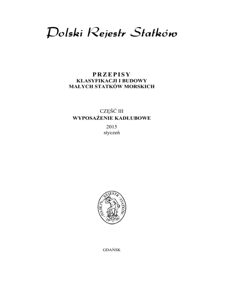 PRZEPISY KLASYFIKACJI I BUDOWY MAŁYCH STATKÓW MORSKICH CZĘŚĆ III WYPOSAŻENIE KADŁUBOWE 2015 styczeń GDAŃSK PRZEPISY KLASYFIKACJI I BUDOWY MAŁYCH STATKÓW MORSKICH opracowane i wydane przez Polski Rejestr Statków S.A., zwany dalej PRS, składają się z następujących części: Część I Część II Część III Część IV Część V Część VI Część VII – – – – – – – Zasady klasyfikacji Kadłub Wyposażenie kadłubowe Stateczność i wolna burta Ochrona przeciwpożarowa Urządzenia maszynowe i instalacje rurociągów Instalacje elektryczne i systemy sterowania Część III – Wyposażenie kadłubowe – styczeń 2015 została zatwierdzona przez Zarząd PRS w dniu 29 grudnia 2014 r. i wchodzi w życie z dniem 1 ztycznia 2015 r. Z dniem wejścia w życie niniejszej Części III jej wymagania mają zastosowanie – w pełnym zakresie – do statków nowych. W odniesieniu do statków istniejących wymagania niniejszej Części III mają zastosowanie w zakresie wynikającym z postanowień Części I – Zasady klasyfikacji. Rozszerzeniem i uzupełnieniem Części III – Wyposażenie Kadłubowe są następujące publikacje: Publikacja Nr 76/P – Stateczność, niezatapialność i wolna burta statków pasażerskich uprawiających żeglugę krajową © Copyright by Polski Rejestr Statków S.A., 2015 PRS/OP, 12/2014 ISBN 978-83-7664-276-5 SPIS TREŚCI str. 1 Postanowienia ogólne...................................................................................................................................... 5 1.1 Zakres zastosowania ................................................................................................................................. 5 1.2 Określenia i objaśnienia............................................................................................................................ 5 1.3 Zakres nadzoru ......................................................................................................................................... 7 1.4 Dokumentacja techniczna......................................................................................................................... 8 1.5 Naprężenia rzeczywiste i dopuszczalne.................................................................................................... 9 1.6 Wskaźnik wyposażenia............................................................................................................................. 9 2 Urządzenia sterowe ......................................................................................................................................... 10 2.1 Wymagania ogólne ................................................................................................................................... 10 2.2 Główne urządzenia sterowe...................................................................................................................... 10 2.3 Rezerwowe urządzenie sterowe................................................................................................................ 11 2.4 Stanowiska sterowania ............................................................................................................................. 11 2.5 Wyjściowe parametry obliczeniowe......................................................................................................... 11 2.6 Trzon steru................................................................................................................................................ 14 2.7 Płetwa steru .............................................................................................................................................. 14 2.8 Sprzęgło łączące trzon z płetwą steru ....................................................................................................... 16 2.9 Czop steru................................................................................................................................................. 16 2.10 Łożyska trzonu ......................................................................................................................................... 17 2.11 Sterownice i sektory ................................................................................................................................. 17 2.12 Urządzenia sterowe z cięgnami i łańcuchami........................................................................................... 17 2.13 Ograniczniki wychylenia steru ................................................................................................................. 18 2.14 Części zapasowe ....................................................................................................................................... 18 3 Urządzenia kotwiczne ..................................................................................................................................... 18 3.1 Postanowienia ogólne ............................................................................................................................... 18 3.2 Kotwice główne........................................................................................................................................ 19 3.3 Łańcuchy kotwic głównych...................................................................................................................... 20 3.4 Wyposażenie kotwiczne ........................................................................................................................... 21 3.5 Komory łańcuchowe................................................................................................................................. 22 3.6 Wciągarki kotwiczne ................................................................................................................................ 22 3.7 Części zapasowe .......................................