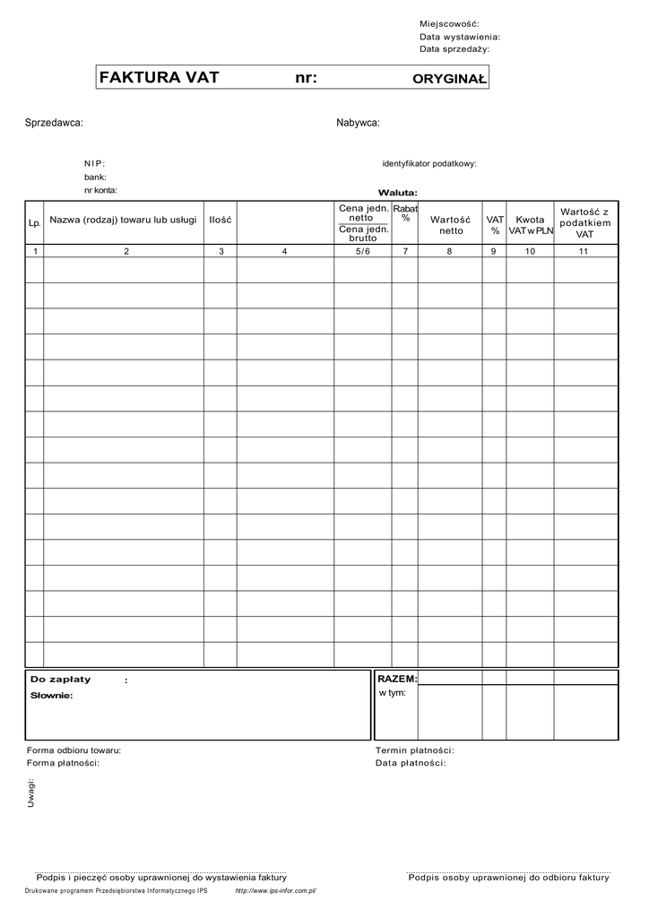 Miejscowość: Data wystawienia: Data sprzedaŜy: FAKTURA VAT nr: Sprzedawca: ORYGINAŁ Nabywca: NI P: identyfikator podatkowy: bank: nr konta: Waluta: Lp. Nazwa (rodzaj) towaru lub usługi 1 Do zapłaty 2 Cena jedn. Rabat % netto Cena jedn. brutto Ilość 3 4 5/ 6 Wartość netto 7 8 Wartość z VAT Kwota podat kiem % VAT w PLN VAT 9 10 11 RAZEM: w tym: : Słownie: Termin płatności: Forma płatności: Dat a pł at nośc i: Uwagi: Forma odbioru towaru: Podpis i pieczęć osoby uprawnionej do wystawienia faktury Drukowane programem Przedsiębiorstwa Informatycznego IPS http://www.ips-infor.com.pl/ Podpis osoby uprawnionej do odbioru faktury