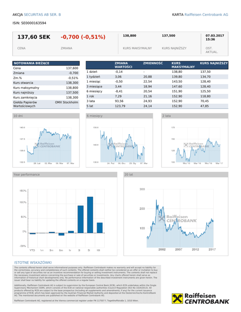 KARTA Raiffeisen Centrobank AG AKCJA SECURITAS AB SER. B ISIN: SE0000163594 137,60 SEK -0,700 (-0,51%) 138,800 137,500 07.03.2017 15:36 CENA ZMIANA KURS MAKSYMALNY KURS NAJNIŻSZY OST. AKTUAL. NOTOWANIA BIEŻĄCE Cena 137,600 ZMIANA WARTOŚCI ZMIENNOŚĆ KURS MAKSYMALNY KURS NAJNIŻSZY -0,700 1 dzień -0,14 - 138,80 137,50 -0,51% 1 tydzień 3,06 20,88 139,80 134,70 Kurs otwarcia 138,300 1 miesiąc -0,50 22,54 143,50 128,40 Kurs maksymalny 138,800 3 miesiące 3,44 18,94 147,60 128,40 137,500 6 miesięcy -8,41 20,54 151,90 125,50 138,300 1 rok 7,29 21,16 152,90 118,80 OMX Stockholm 3 lata 93,56 24,93 152,90 70,45 5 lat 123,79 24,14 152,90 47,85 Zmiana Zm.% Kurs najniższy Kurs zamknięcia Giełda Papierów Wartościowych 10 dni Year performance 6 miesięcy 2 lata 20 lat ISTOTNE WSKAZÓWKI The contents offered herein shall serve informational purposes only. Raiffeisen Centrobank makes no warranty and will accept no liability for the correctness, accuracy and completeness of such contents. The offered contents shall neither be considered as an offer or invitation to buy or sell any type of securities nor as an incentive recommendation for buying or selling investment instruments. The contents shall not replace the necessary investment advice concerning the purchase or sale of securities or investments. Any charts offered herein shall serve as information of historical chart developments only. No performance information of the described investment instruments are given herein. The issuer shall bear no liability for updating the offered contents on a regular basis. Additionally, Raiffeisen Centrobank AG is subject to supervision by the European Central Bank (ECB), which ECB undertakes within the Single Supervisory Mechanism (SSM), which consists of the ECB on national responsible authorities (Council Regulation (EU) No 1024/2013). All products offered by RCB are subject to the base prospectus (including all supplements and amendments, if any) for the current issuance programme of RCB, which has been approved by the Austrian Financial Market Authority and deposited at the Oesterreichische Kontrollbank AG. The mentioned documents are published on the website of Raiffeisen Centrobank AG. Raiffeisen Centrobank AG, registered at the Vienna commercial register under FN 117507 f, Tegetthoffstraße 1, 1010 Wien. Powered by TCPDF (www.tcpdf.org)