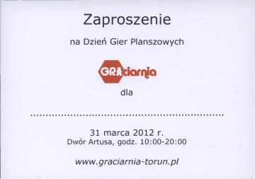 Zaproszenie na Dzień Gier Planszowych dla 31 marca 201 2 r. Dwór Artusa, godz. 10:00-20:00 www.graciarnia-torun.pl '1f_FcENE NTRulMKG1SRE �� � �� F g ' Grajfer.pl aDWOR RTUSa ' =mi= :Zapraszają na: 31 manca 2012 n. DwónAnTusa W programie: RvneK STanom1eJsK1 6 SaLa W1eLKa • 200 GIER dostępnych w wypożyczalni DLA WSZYSTKICH 10:00-20:00 •TURNIEJE: Carcassonne, Osadnicy z Catanu, Pędzące żółwie i wiele innych • KĄCIK DLA NAJMŁODSZVCH graczy Bilety: Normalny - 10 zł Dzieci do lat 10 - gratis Dzieci 10 - 15 lat - 5 zł Rodzinny (2 dorosłych+dzieci) - 15 zł Ol/ety do nabycia w Centrum Cler "Feniks„ (uf. 5w_ Katarzyny 7), shlepN "Cra}fer- strefa gier" (ul. Mostowo 19/ oraz przed imprezą w Soli Lustrzane/ Dworu Artusa www .G Ra Cl a Rn I a ·TO RU n. p L SPONSORZY: em� e E G M,ę,�,T li j> ] (ł ® lil�.m.L:.�\ PATRONI MEDIALNI: