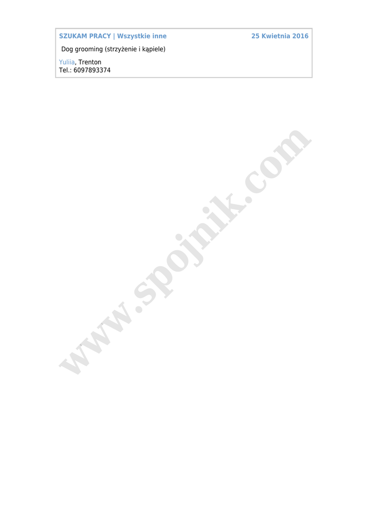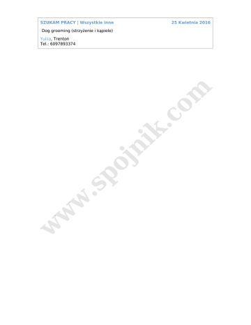 SZUKAM PRACY | Wszystkie inne 25 Kwietnia 2016 Dog grooming (strzyżenie i kąpiele) w w w .s po jn ik .c o m Yuliia, Trenton Tel.: 6097893374