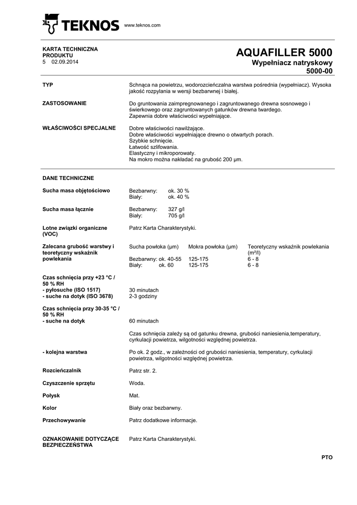 www.teknos.com KARTA TECHNICZNA PRODUKTU 5 02.09.2014 AQUAFILLER 5000 Wypełniacz natryskowy 5000-00 TYP Schnąca na powietrzu, wodorozcieńczalna warstwa pośrednia (wypełniacz). Wysoka jakość rozpylania w wersji bezbarwnej i białej. ZASTOSOWANIE Do gruntowania zaimpregnowanego i zagruntowanego drewna sosnowego i świerkowego oraz zagruntowanych gatunków drewna twardego. Zapewnia dobre właściwości wypełniające. WŁAŚCIWOŚCI SPECJALNE Dobre właściwości nawilżające. Dobre właściwości wypełniające drewno o otwartych porach. Szybkie schnięcie. Łatwość szlifowania. Elastyczny i mikroporowaty. Na mokro można nakładać na grubość 200 µm. DANE TECHNICZNE Sucha masa objętościowo Bezbarwny: Biały: ok. 30 % ok. 40 % Sucha masa łącznie Bezbarwny: Biały: 327 g/l 705 g/l Lotne związki organiczne (VOC) Patrz Karta Charakterystyki. Zalecana grubość warstwy i teoretyczny wskaźnik powlekania Sucha powłoka (µm) Mokra powłoka (µm) Bezbarwny: ok. 40-55 Biały: ok. 60 125-175 125-175 Czas schnięcia przy +23 °C / 50 % RH - pyłosuche (ISO 1517) - suche na dotyk (ISO 3678) 30 minutach 2-3 godziny Czas schnięcia przy 30-35 °C / 50 % RH - suche na dotyk 60 minutach Teoretyczny wskaźnik powlekania (m²/l) 6-8 6-8 Czas schnięcia zależy są od gatunku drewna, grubości naniesienia,temperatury, cyrkulacji powietrza, wilgotności względnej powietrza. - kolejna warstwa Po ok. 2 godz., w zależności od grubości naniesienia, temperatury, cyrkulacji powietrza, wilgotności względnej powietrza. Rozcieńczalnik Patrz str. 2. Czyszczenie sprzętu Woda. Połysk Mat. Kolor Biały oraz bezbarwny. Przechowywanie Patrz dodatkowe informacje. OZNAKOWANIE DOTYCZĄCE BEZPIECZEŃSTWA Patrz Karta Charakterystyki. PTO KARTA TECHNICZNA PRODUKTU 5000-00 Strona 2 INSTRUKCJA UŻYCIA Obróbka wstępna Drewno musi być czyste i wolne od pyłu oraz zanieczyszczeń. Przed nałożeniem warstwy pośredniej drewno należy zaimpregnować i zagruntować. Impregnat: Sosna/świerk: Gatunki drewna twardego: Podkład: Sosna/świerk: Gatunki drewna twardego: TEKNOL AQUA 1410-01 moze TEKNOL AQUA 1410-01 AQUAPRIMER 2900, AQUA PRIMER 3130, AQUA PRIMER 2907 ANTISTAIN AQUA 2901 Warunki nakładania Temperatura powietrza, malowanej powierzchni i farby powinna wynosić 15-25 °C, a wilgotność względna powietrza 40-60 % podczas nanoszenia i utwardzania. Nakładanie Przed użyciem dokładnie wymieszać. INFORMACJE DODATKOWE Sprzęt Rozcieńczalnik Airless Airmix/aircoat Wysoka rotacja Pędzel Nierozcieńczony Nierozcieńczony Woda Woda Sugerowana lepkość wg kubka DIN 4 mm przy 20 °C 30-50 s Pokrywanie produktami AQUATOP, np. AQUATOP 2600. Przechowywanie: Patrz etykieta. Przechowywać w szczelnie zamkniętym pojemniku. Przechowywać w warunkach zabezpieczających przed mrozem. Informacje zawarte w niniejszym dokumencie są normatywne i wynikają z badań laboratoryjnych i praktycznego doświadczenia. Podane wartości mają charakter orientacyjny. Nie ponosimy odpowiedzialności za rezultaty stosowania produktu w warunkach leżących poza naszą kontrolą, natomiast właściciel lub użytkownik odpowiada za określenie przydatności naszych produktów do określonego celu i metody stosowania w warunkach rzeczywistych. Nasza odpowiedzialność jest ograniczona do szkód spowodowanych bezpośrednio wadami produktów dostarczonych przez firmę Teknos. Najnowsze wersje naszych kart technicznych i kart charakterystyki substancji niebezpiecznej znajdują się na naszej stronie www.teknos.com.