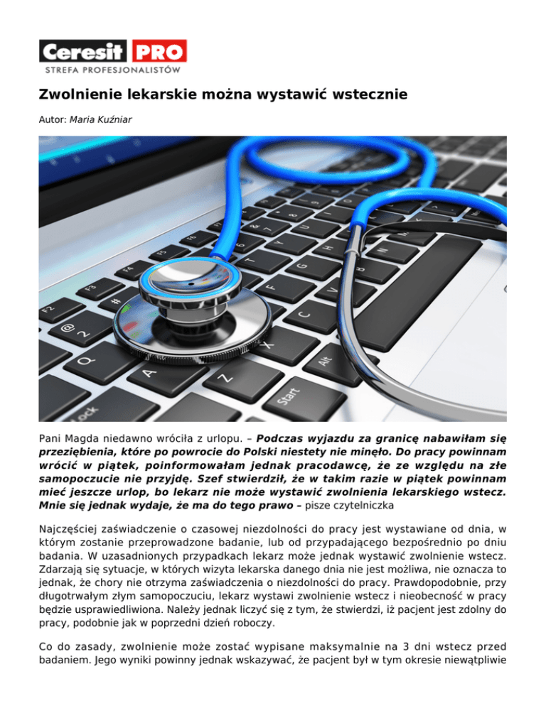 Zwolnienie lekarskie można wystawić wstecznie Autor: Maria Kuźniar Pani Magda niedawno wróciła z urlopu. – Podczas wyjazdu za granicę nabawiłam się przeziębienia, które po powrocie do Polski niestety nie minęło. Do pracy powinnam wrócić w piątek, poinformowałam jednak pracodawcę, że ze względu na złe samopoczucie nie przyjdę. Szef stwierdził, że w takim razie w piątek powinnam mieć jeszcze urlop, bo lekarz nie może wystawić zwolnienia lekarskiego wstecz. Mnie się jednak wydaje, że ma do tego prawo – pisze czytelniczka Najczęściej zaświadczenie o czasowej niezdolności do pracy jest wystawiane od dnia, w którym zostanie przeprowadzone badanie, lub od przypadającego bezpośrednio po dniu badania. W uzasadnionych przypadkach lekarz może jednak wystawić zwolnienie wstecz. Zdarzają się sytuacje, w których wizyta lekarska danego dnia nie jest możliwa, nie oznacza to jednak, że chory nie otrzyma zaświadczenia o niezdolności do pracy. Prawdopodobnie, przy długotrwałym złym samopoczuciu, lekarz wystawi zwolnienie wstecz i nieobecność w pracy będzie usprawiedliwiona. Należy jednak liczyć się z tym, że stwierdzi, iż pacjent jest zdolny do pracy, podobnie jak w poprzedni dzień roboczy. Co do zasady, zwolnienie może zostać wypisane maksymalnie na 3 dni wstecz przed badaniem. Jego wyniki powinny jednak wskazywać, że pacjent był w tym okresie niewątpliwie niezdolny do pracy. Decyzja zawsze należy do lekarza. Jeśli chory narzeka na migrenę, zwolnienia na dzień lub dwa wstecz przed badaniem może nie otrzymać. Jeśli jednak choroba nie ulega wątpliwości, a objawy w ciągu kilku dni mogły się jedynie nasilić, nie powinno być problemów z uzyskaniem zwolnienia. W niektórych przypadkach zwolnienie może zostać wystawione na okres wcześniejszy niż 3 dni wstecz. Dotyczy to jednak podejrzenia zaburzeń psychicznych, które ograniczają zdolność ubezpieczonego do oceny własnego postępowania. Tylko wtedy lekarz może podjąć decyzję o wypisaniu zaświadczenia o niezdolności do pracy na dłuższy wsteczny okres. Zaświadczenie lekarskie może być też wystawione na okres przypadający po dniu przeprowadzenia badania, najpóźniej 4. dnia po badaniu. Jest to możliwe, jeśli po wizycie lekarskiej przypadają dni wolne od pracy, lub jeśli badanie zostało przeprowadzone w trakcie niezdolności do pracy orzeczonej już wcześniej. Podstawa prawna Art. 54–55 ustawy z 25 czerwca 1999 r. o świadczeniach pieniężnych z ubezpieczenia społecznego w razie choroby i macierzyństwa (Dz.U. z 2014 r. poz. 159). Par. 2, 3 rozporządzenia ministra pracy i polityki socjalnej z 27 lipca 1999 r. w sprawie szczegółowych zasad i trybu wystawiania zaświadczeń lekarskich, wzoru zaświadczenia lekarskiego i zaświadczenia lekarskiego wydanego w wyniku kontroli lekarza orzecznika Zakładu Ubezpieczeń Społecznych (Dz.U. z 2013 r. poz. 229 © 2013 Henkel Polska sp. z o.o.